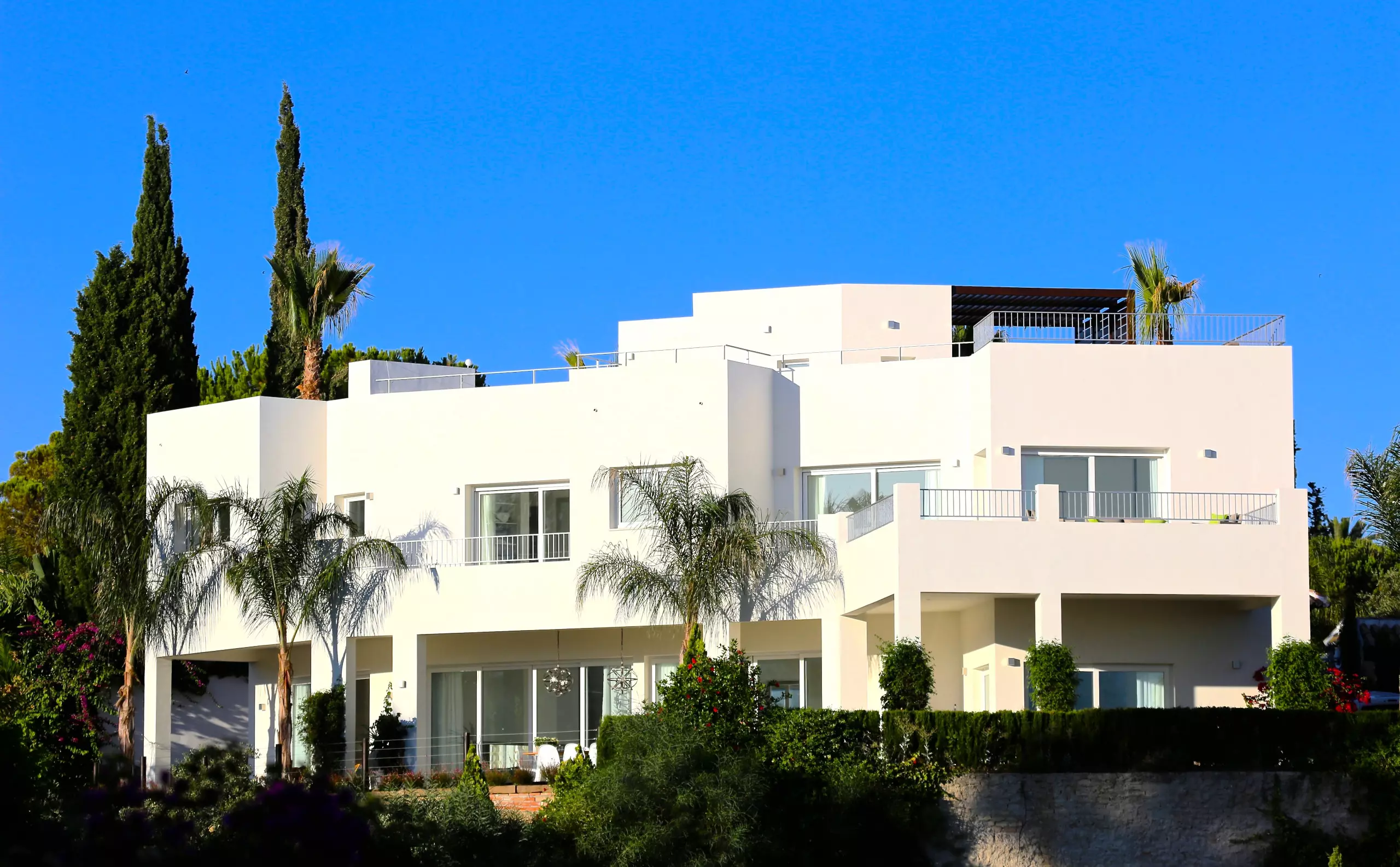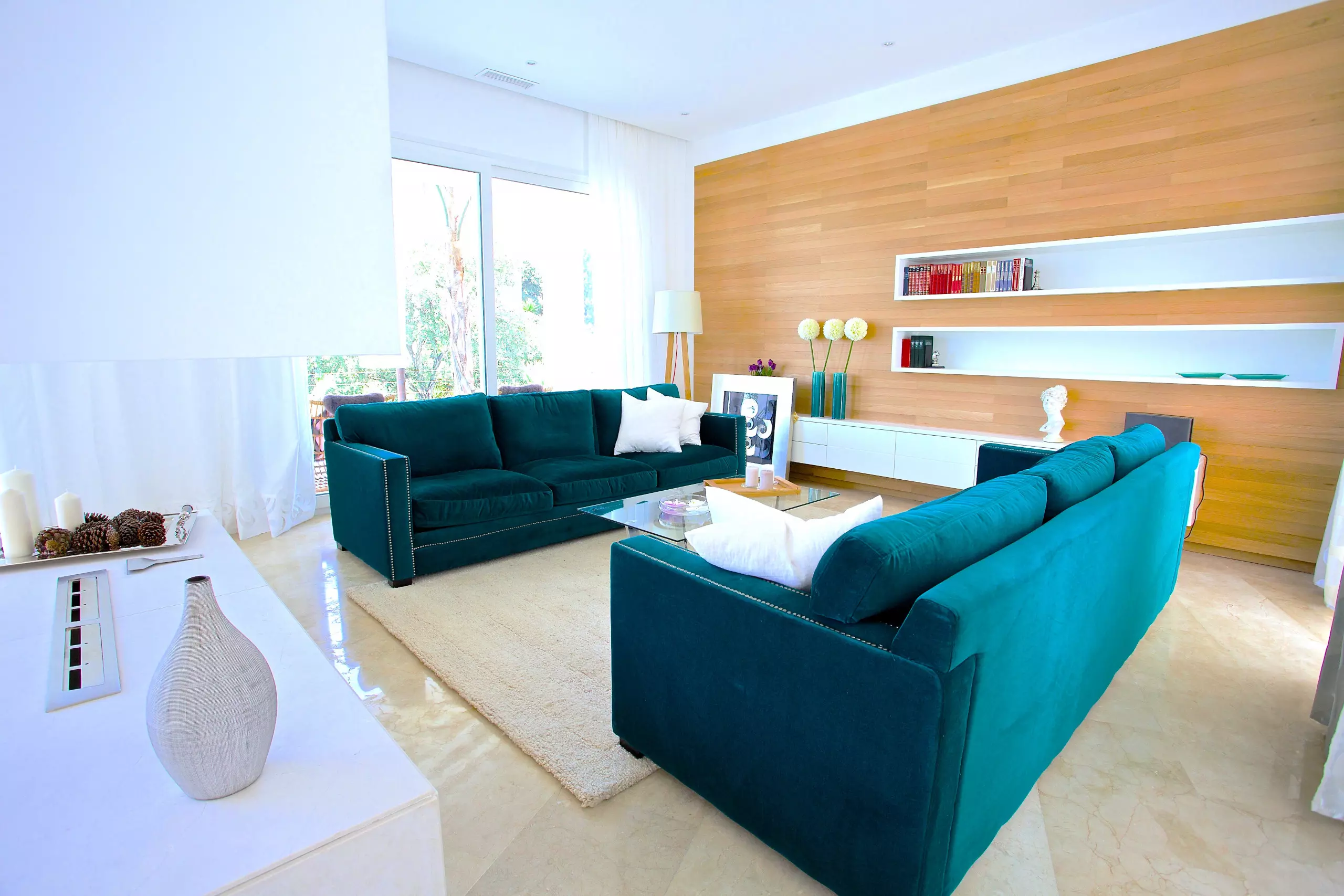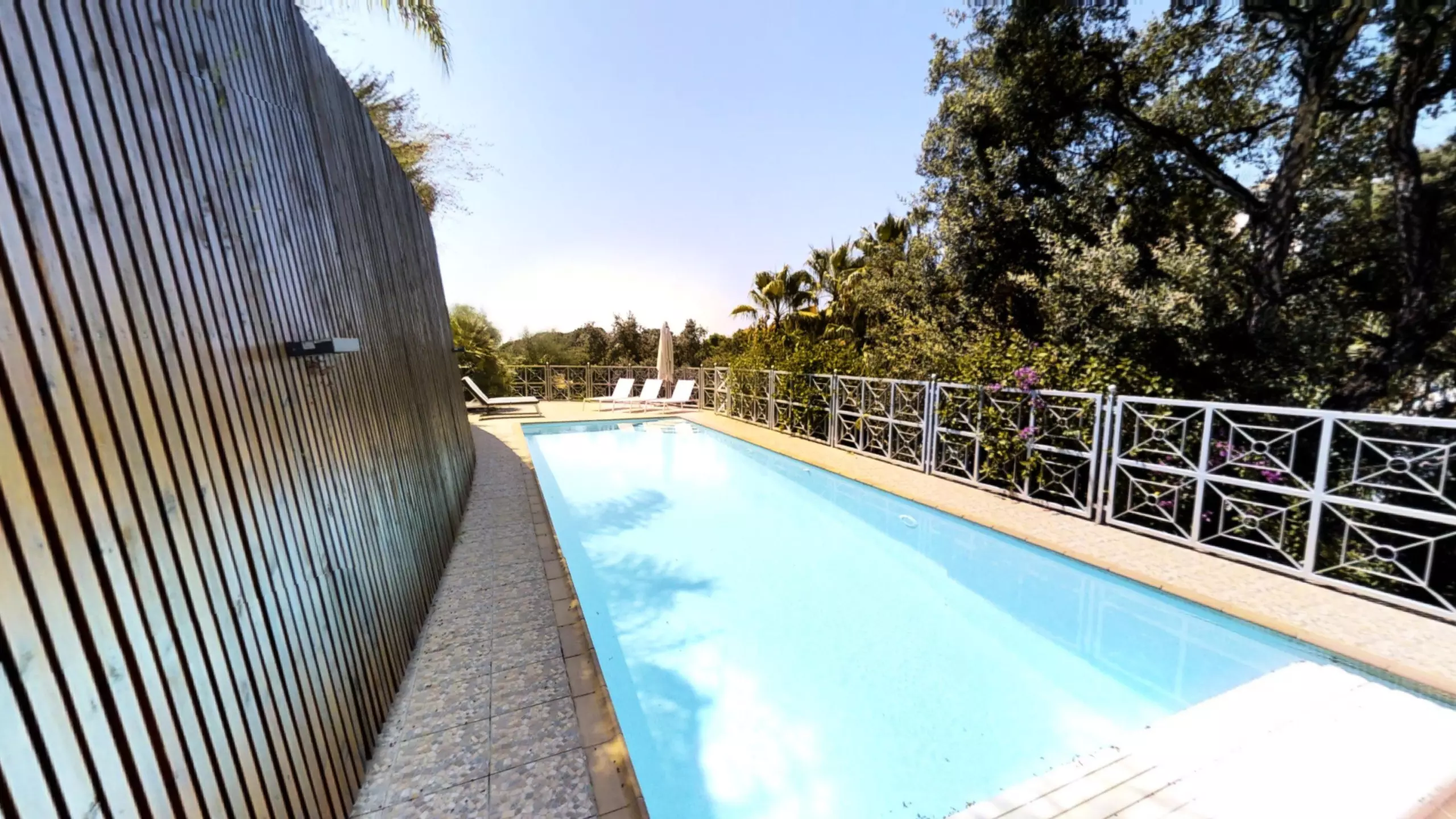 The villa faces due south to west and is located at the end of a quiet cul-de-sac. It comprises a two-story, contemporary-style building with several ground-floor living rooms and four spacious bedrooms, all with en-suite bathrooms.