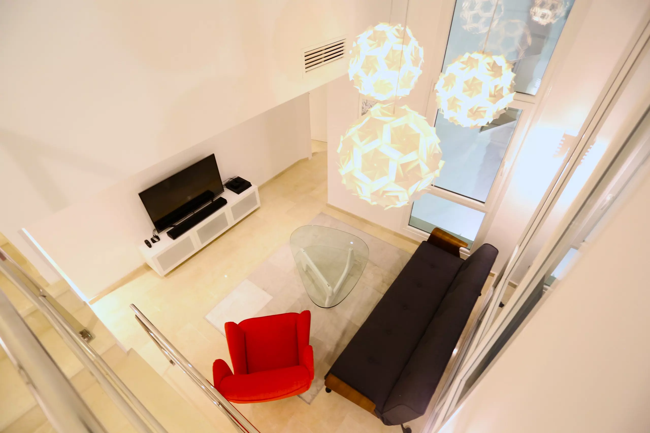 1. The impressive master bedroom features a double bed and offers stunning views from the 40m² private terrace, complete with a lounge set and two sun loungers. The spacious en-suite bathroom includes a bathtub, shower, two separate sinks, a toilet, and a bidet.