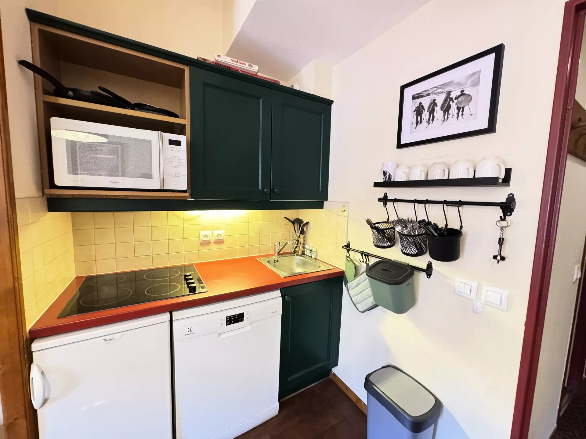 Kitchenette equipped with refrigerator, ceramic hob, dishwasher