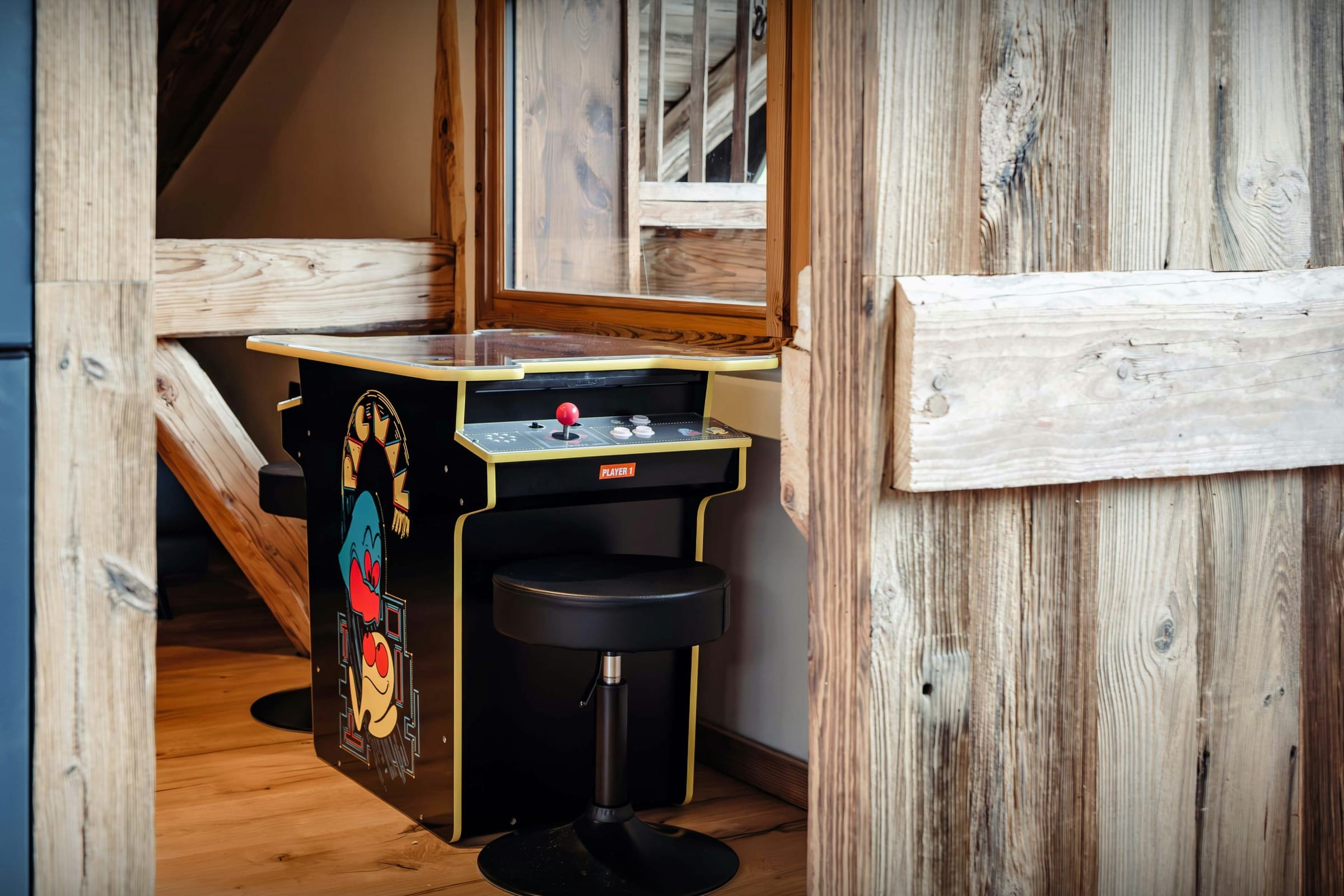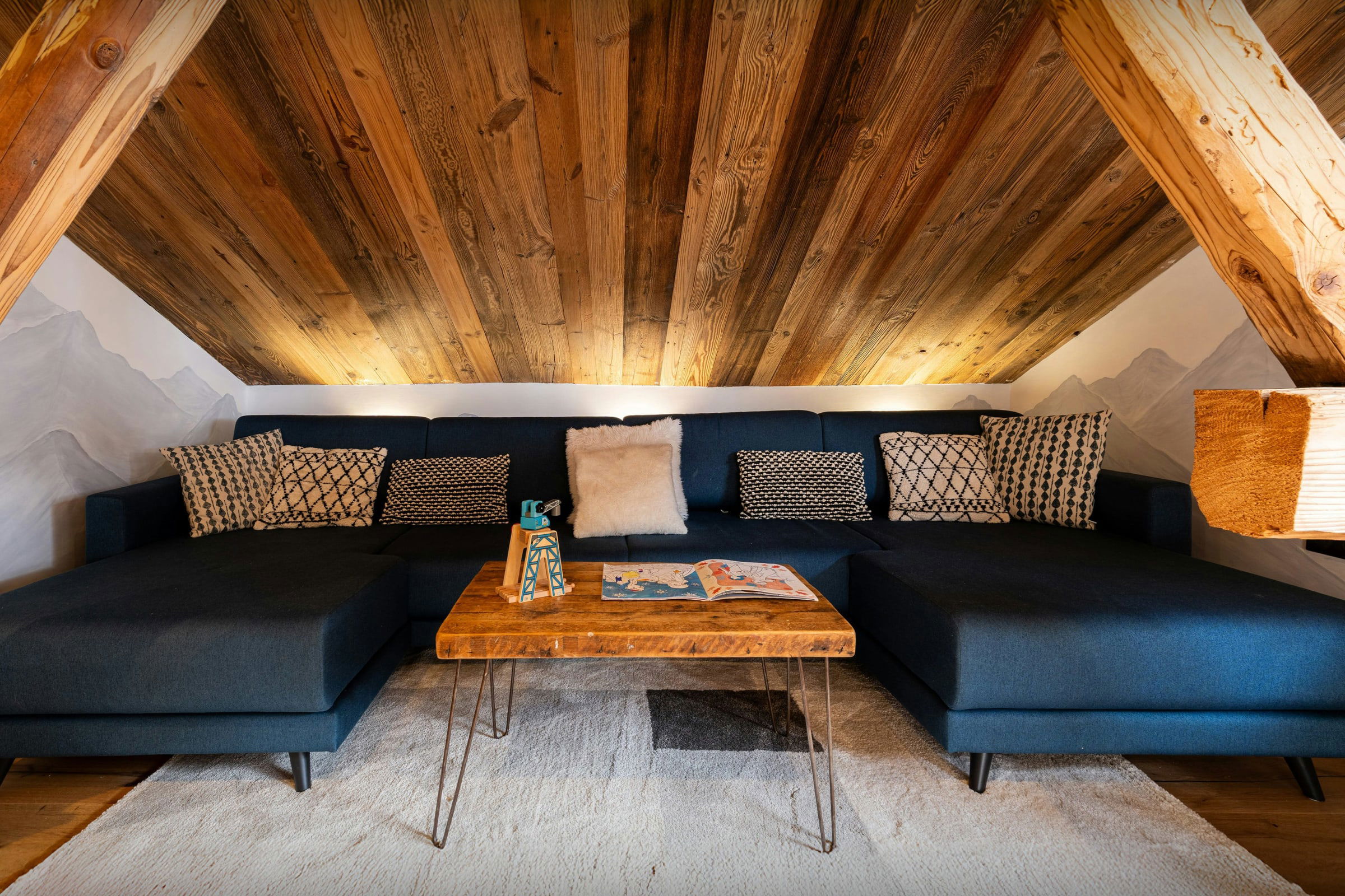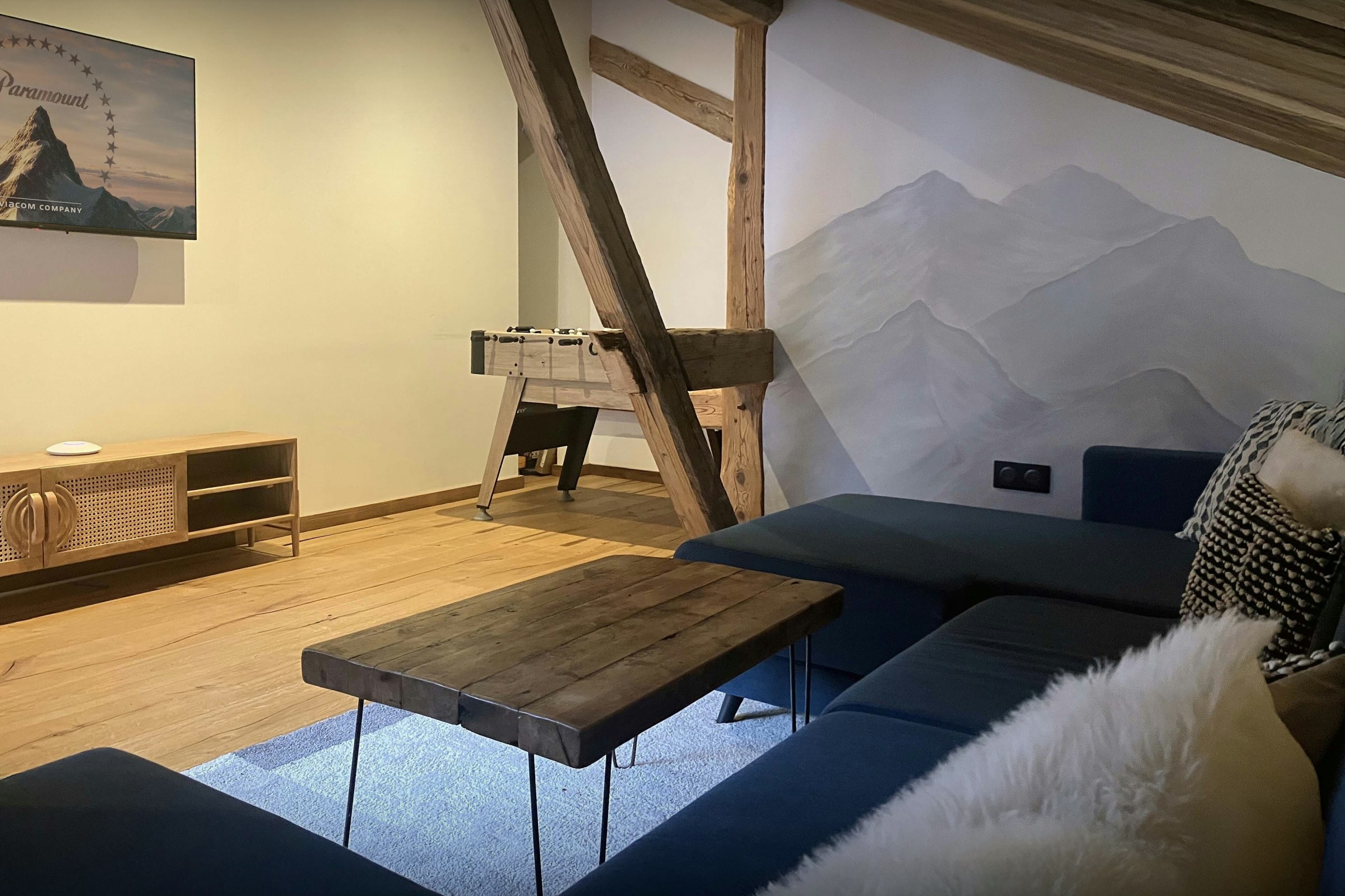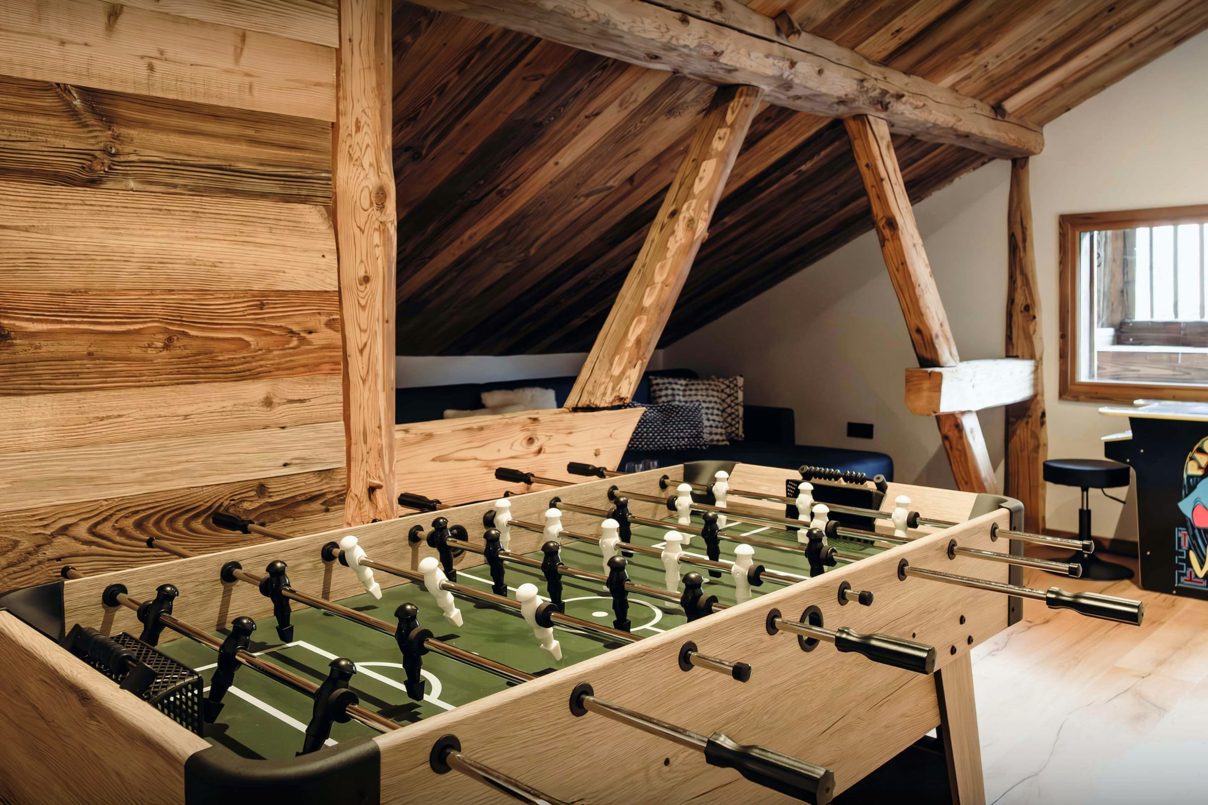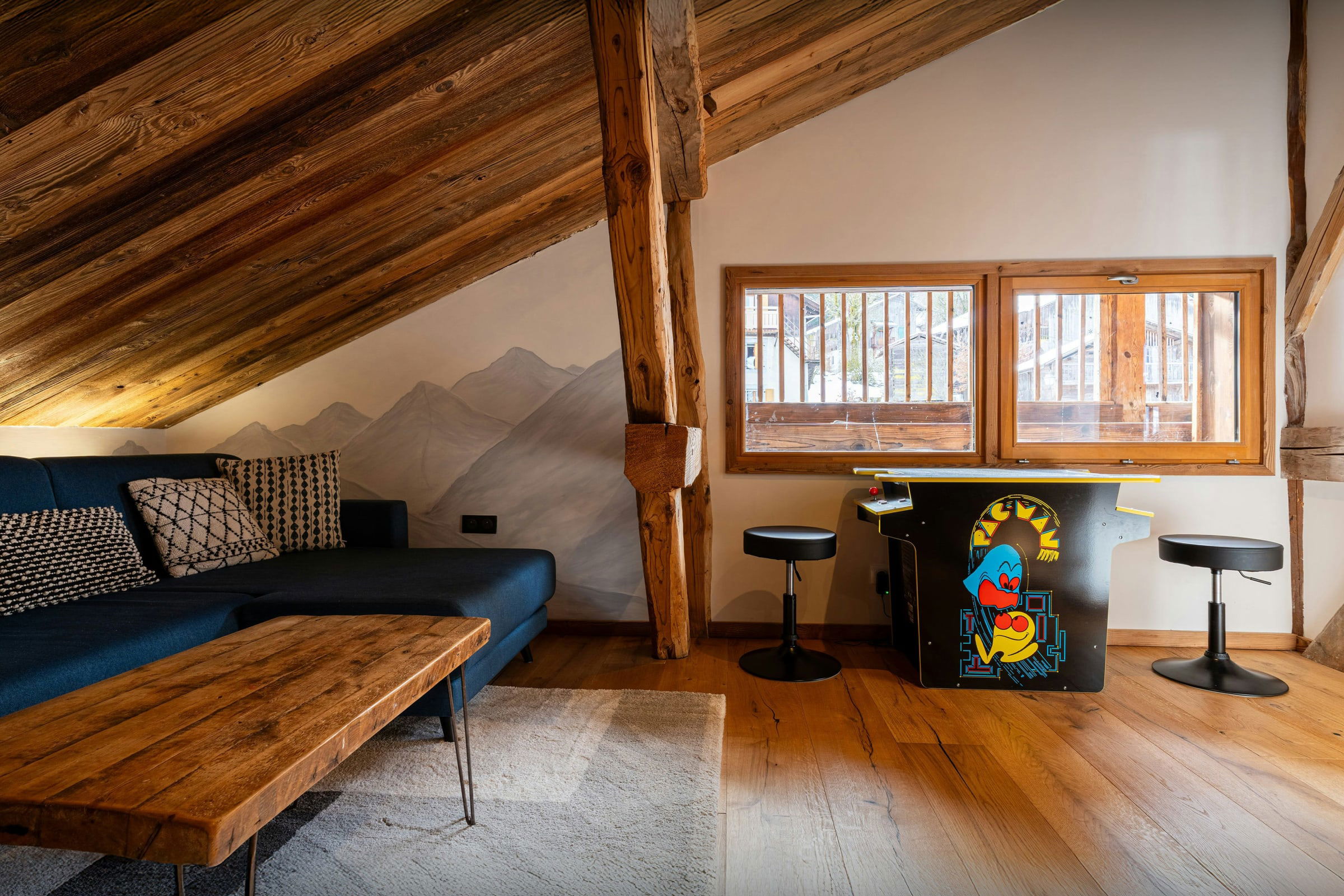 The open-plan living room on the upper level has a cosy seating area, a well-equipped kitchen and a dining area as well as several large windows which flood it with light. There are also glass doors which open onto the balcony. The impressive ceiling height and exposed beams give this area a very special character. A second lounge with a TV and a games room with table football, board games and an arcade machine offer plenty of options for entertainment.