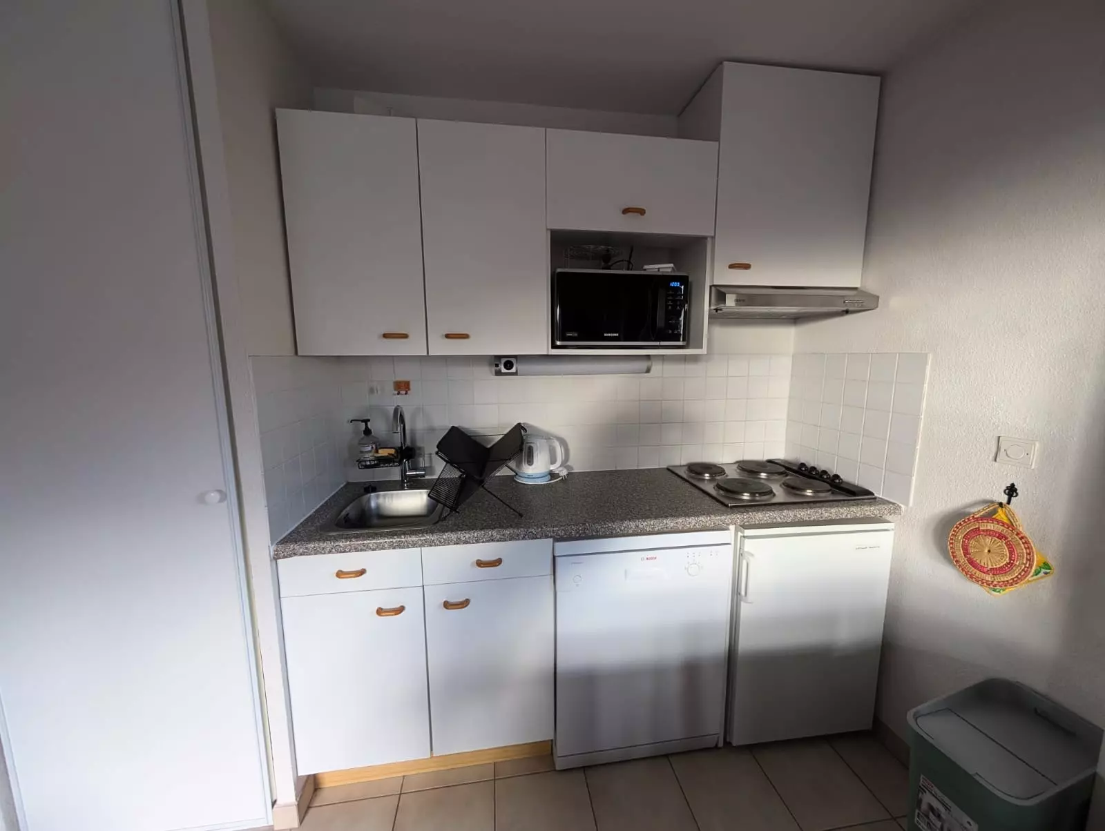 Kitchen area: 4-burner electric hob, extractor hood, "top" fridge, dishwasher, microwave, filter coffee maker, toaster, kettle.