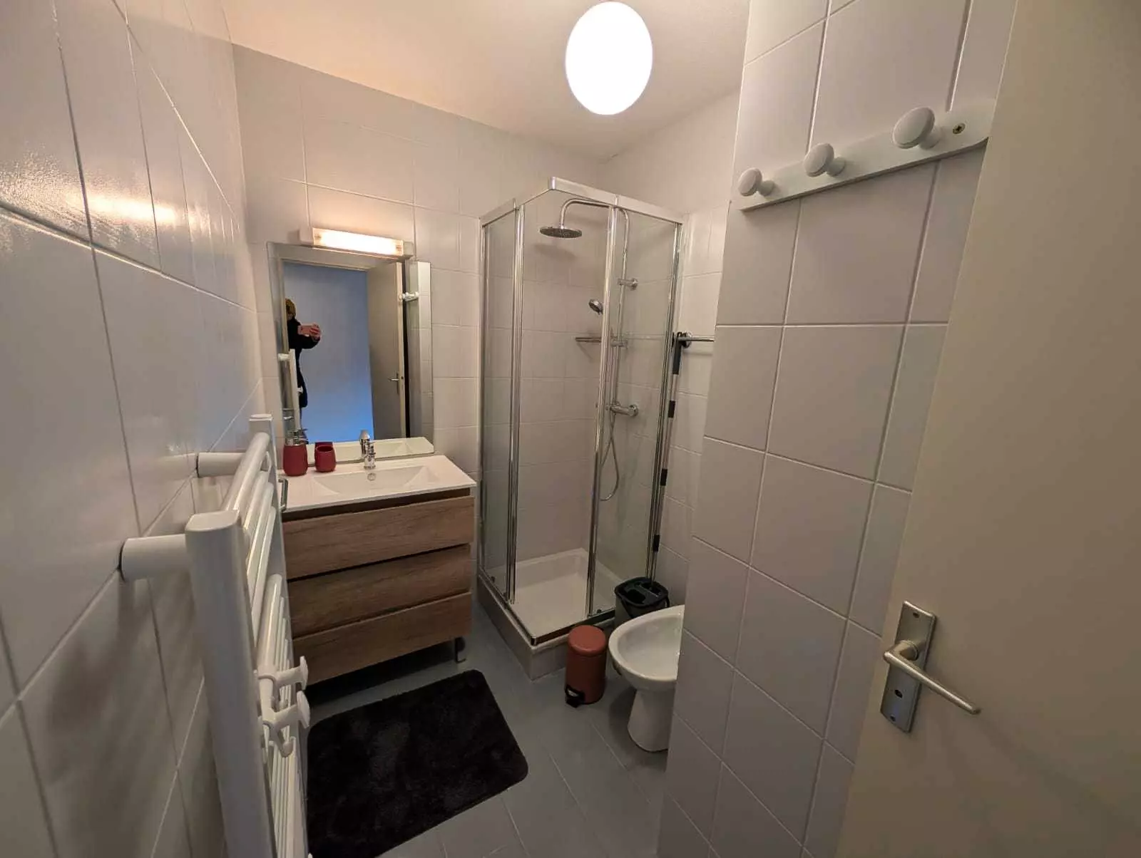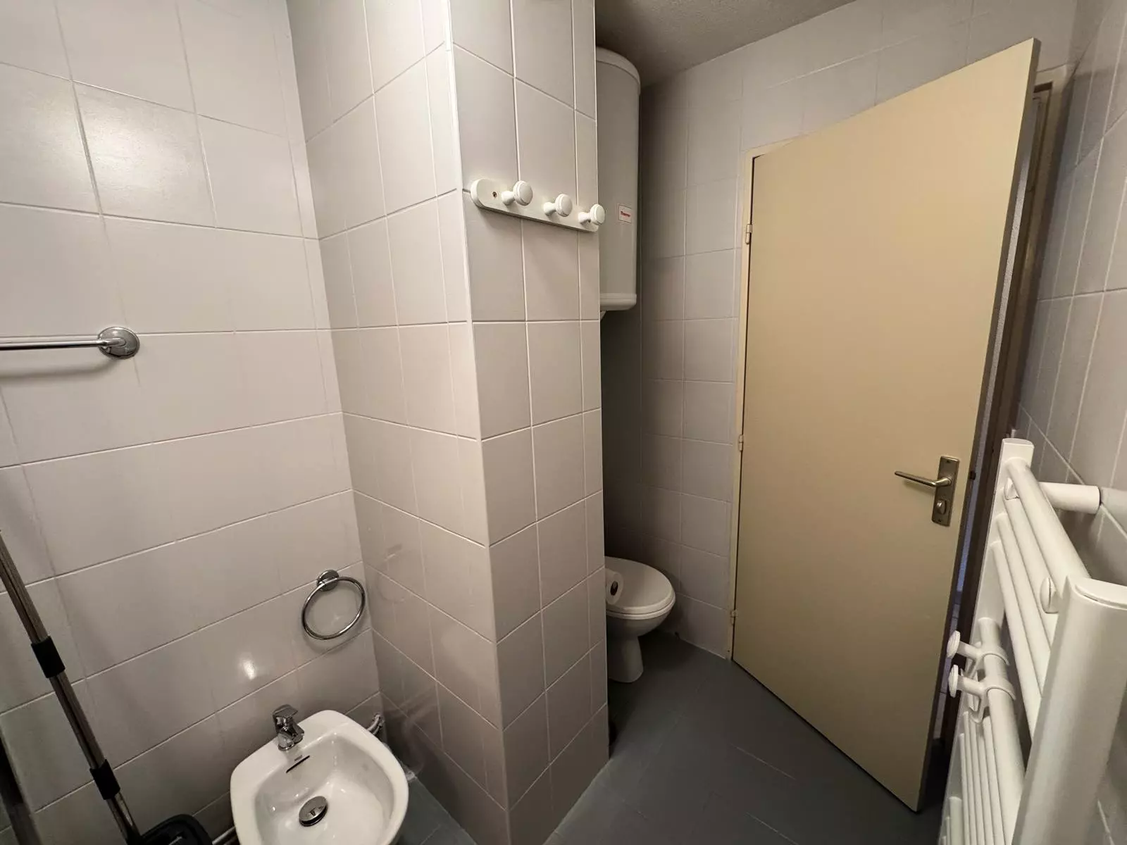 Bathroom: Shower cubicle, WC (in recess), bidet, vanity unit with sink, wall-mounted electric towel warmer.