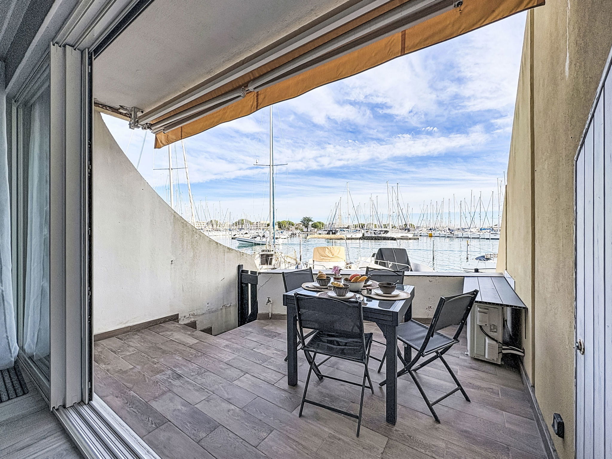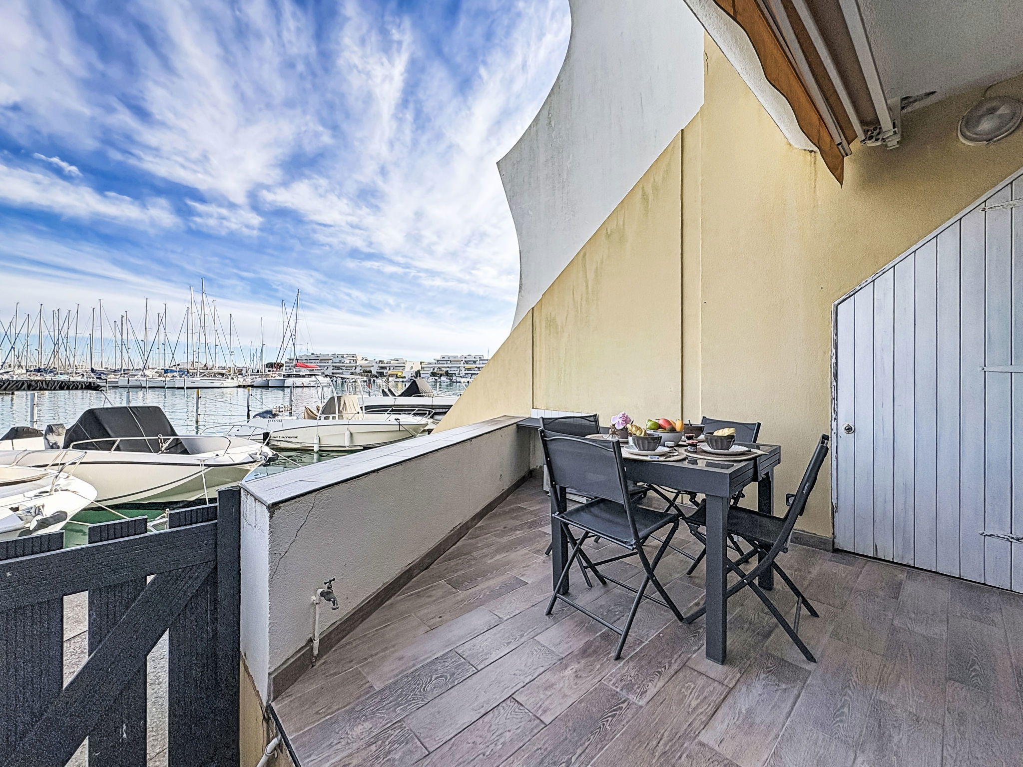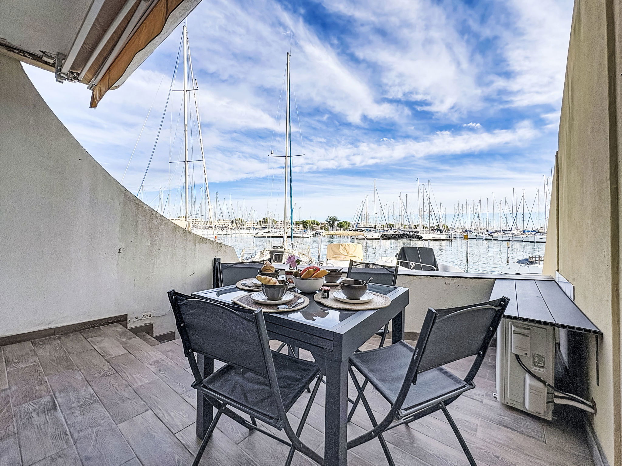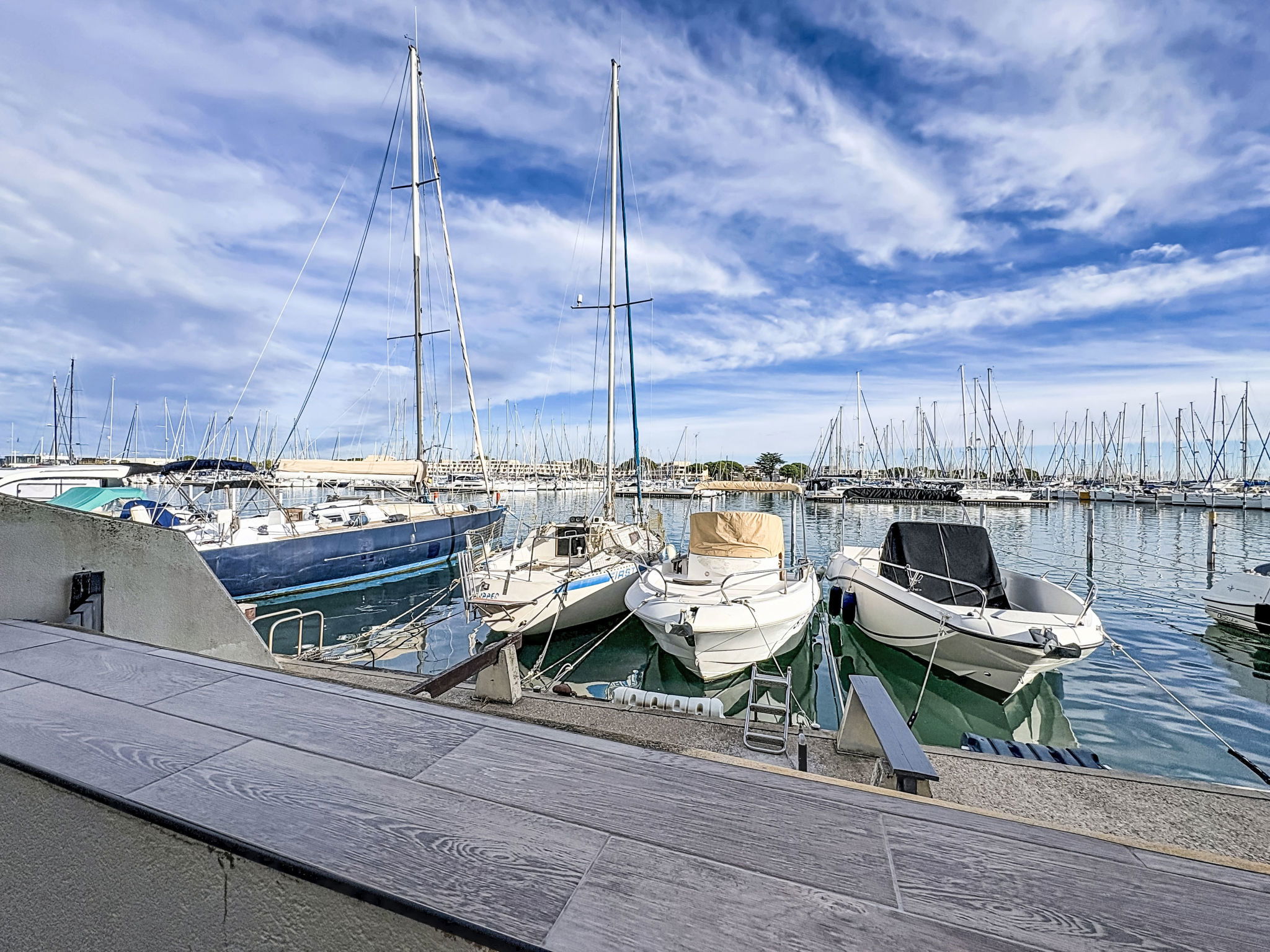 "Les Marines de L'Airan", 2-room apartment 52 m2, on the ground floor. Modern furnishings: living/dining room with 1 double sofabed (140 cm, length 190 cm), TV (flat screen). 1 room with 1 french bed (140 cm, length 190 cm). Open kitchen (dishwasher, 2 induction hot plates, toaster, microwave, freezer, electric coffee machine, Capsules for coffee machine (Tassimo) extra). Shower. Gas heating, air-conditioning. Large terrace 5 m2, east facing position. Very beautiful view of the port. Facilities: washing machine. Internet (WiFi, free). Parking space n 23. Please note: maximum 1 pet/ dog allowed. Smoke alarm. Offer by a private individual according to Art. 155, IV of CGI.