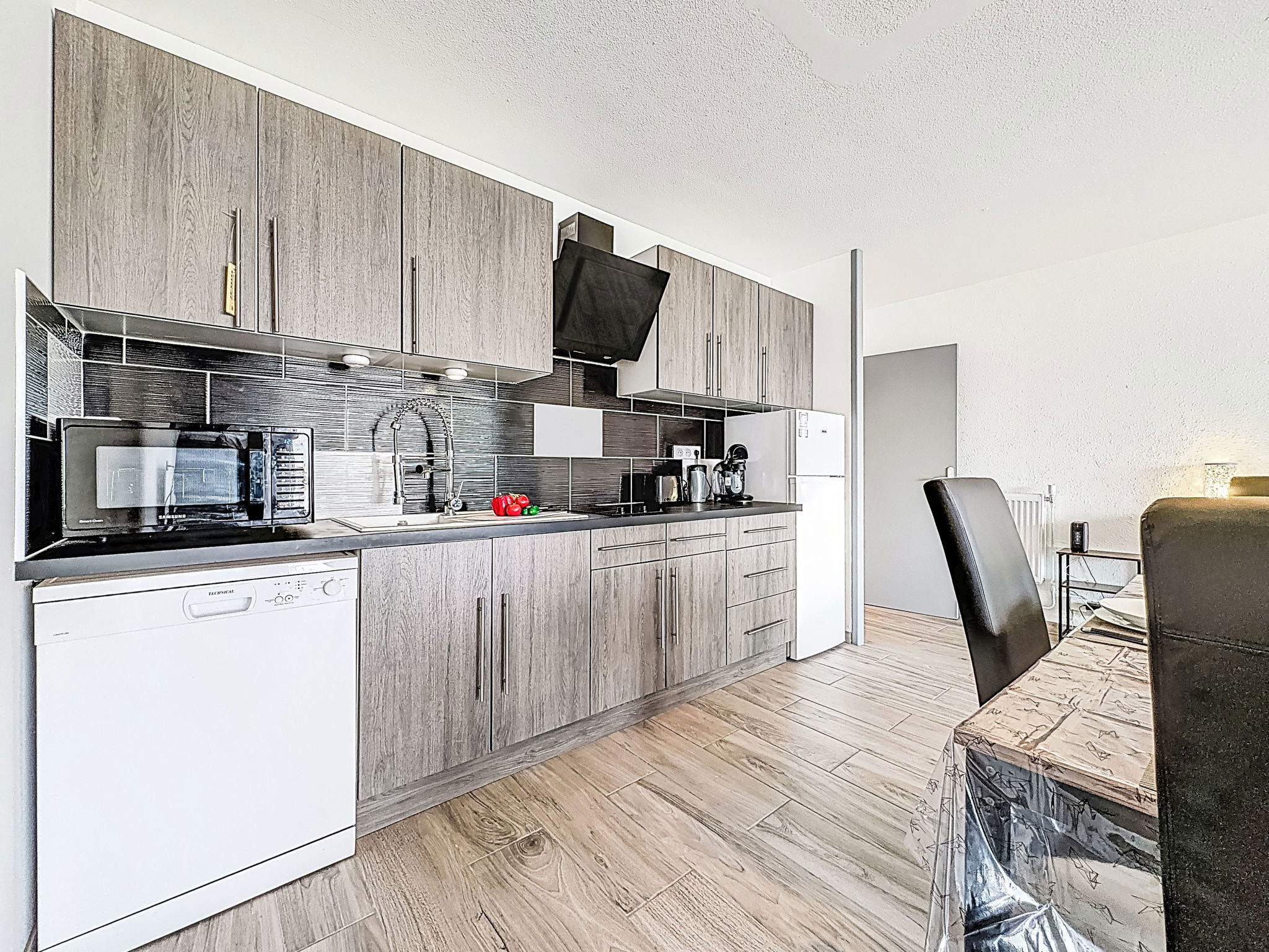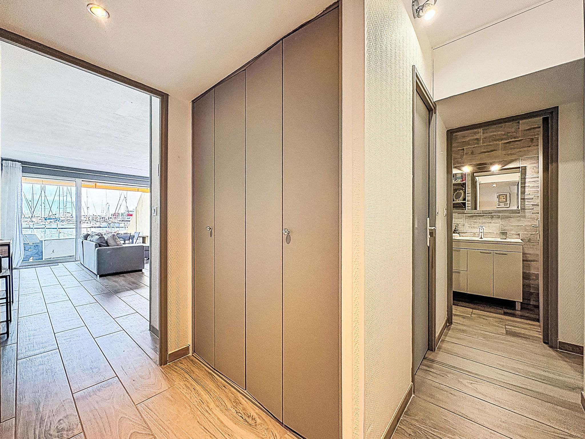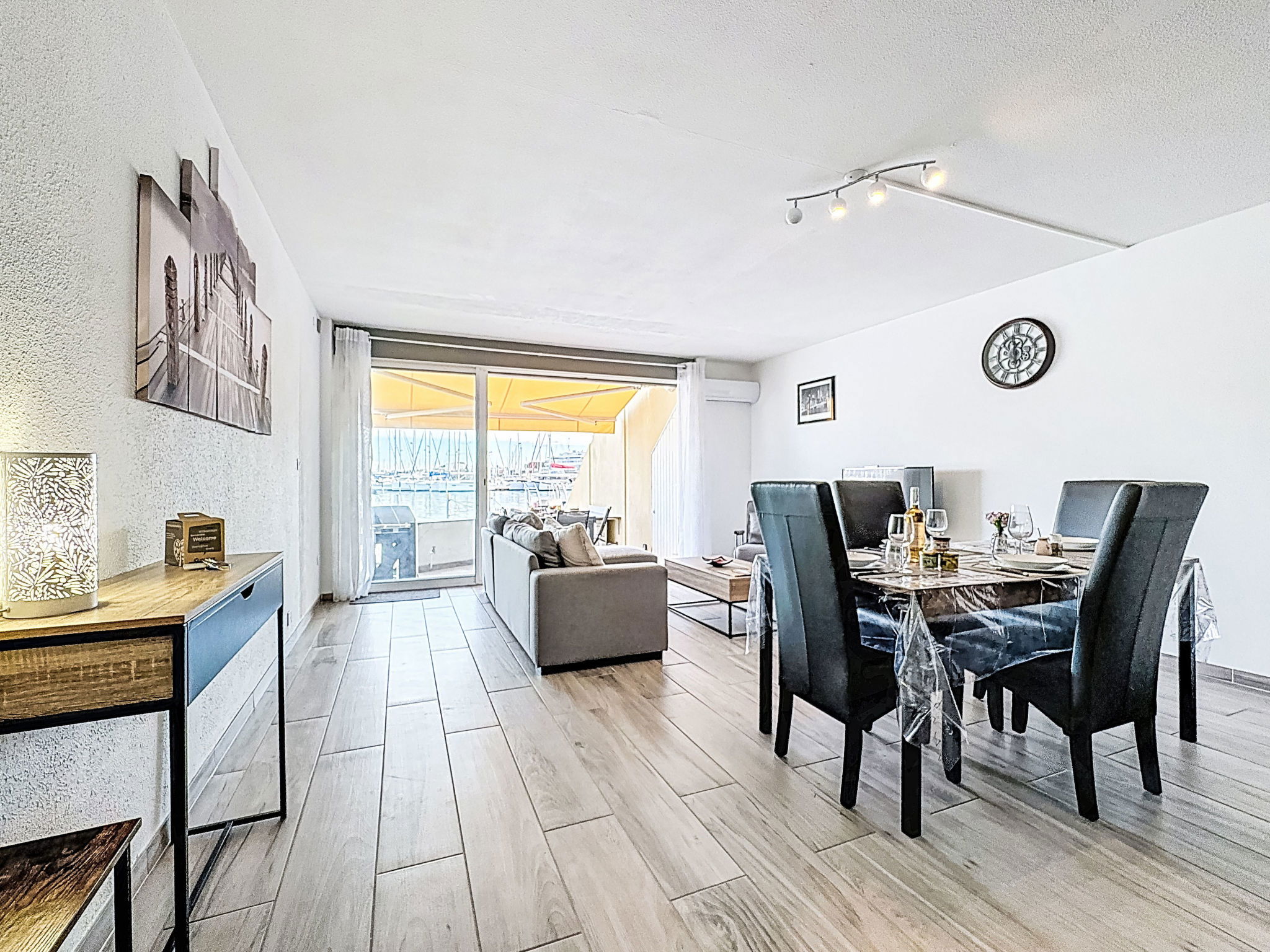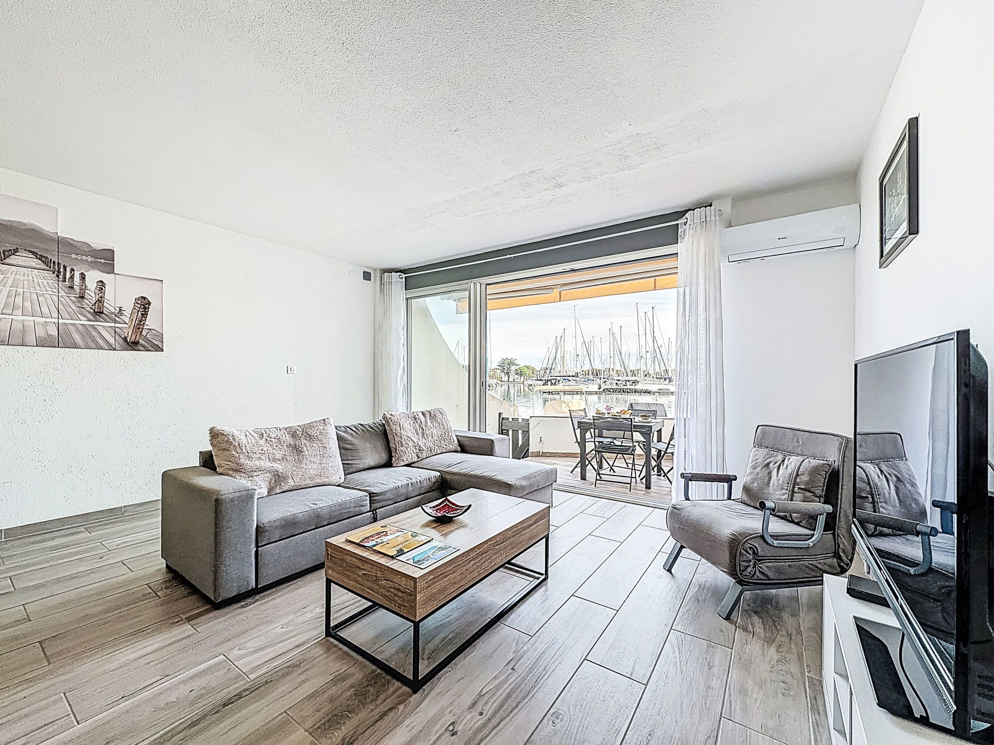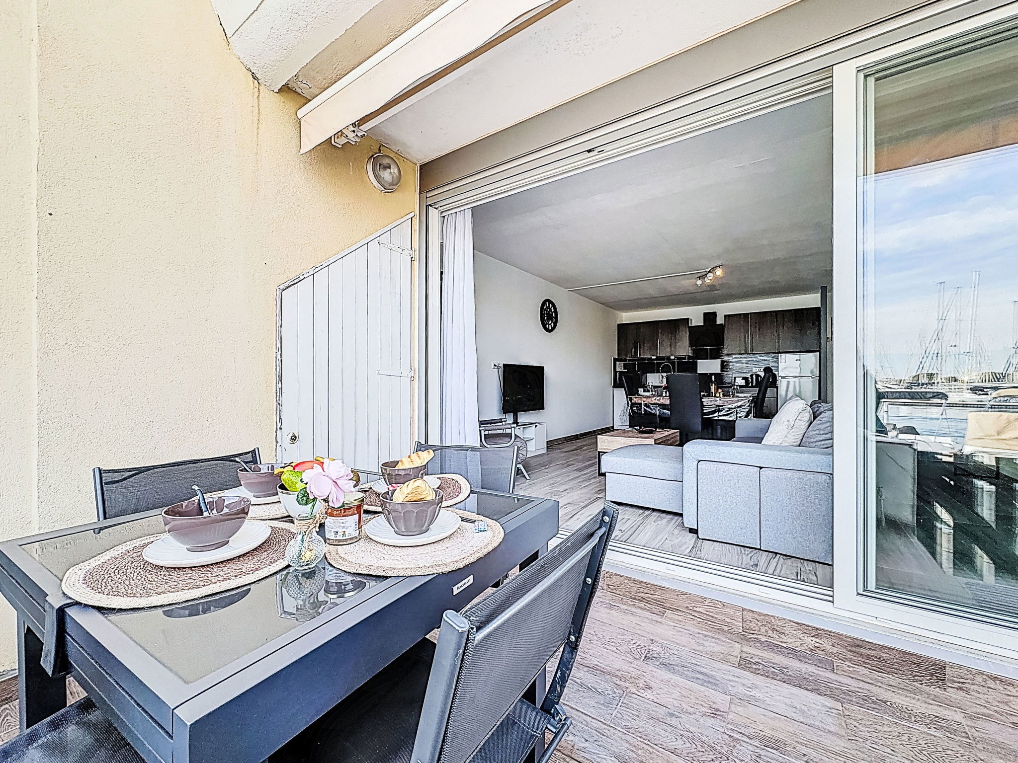 "Les Marines de L'Airan", 2-room apartment 52 m2, on the ground floor. Modern furnishings: living/dining room with 1 double sofabed (140 cm, length 190 cm), TV (flat screen). 1 room with 1 french bed (140 cm, length 190 cm). Open kitchen (dishwasher, 2 induction hot plates, toaster, microwave, freezer, electric coffee machine, Capsules for coffee machine (Tassimo) extra). Shower. Gas heating, air-conditioning. Large terrace 5 m2, east facing position. Very beautiful view of the port. Facilities: washing machine. Internet (WiFi, free). Parking space n 23. Please note: maximum 1 pet/ dog allowed. Smoke alarm. Offer by a private individual according to Art. 155, IV of CGI.