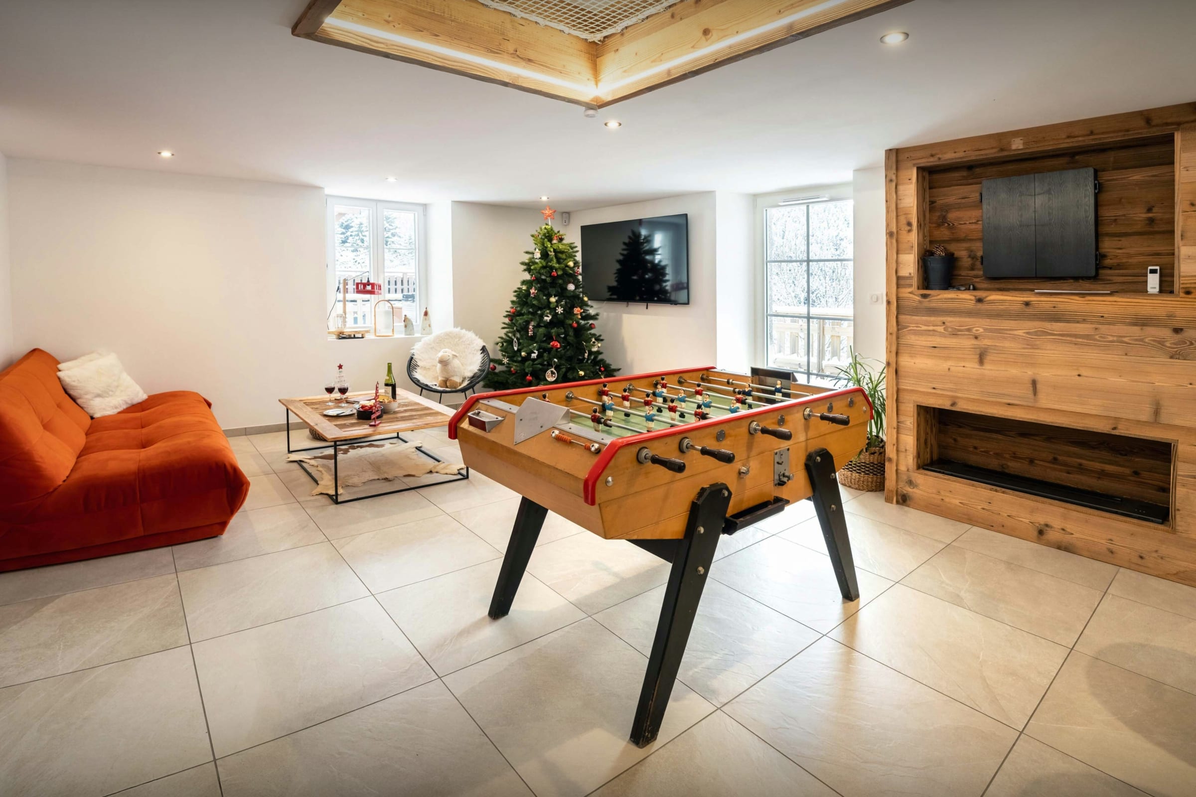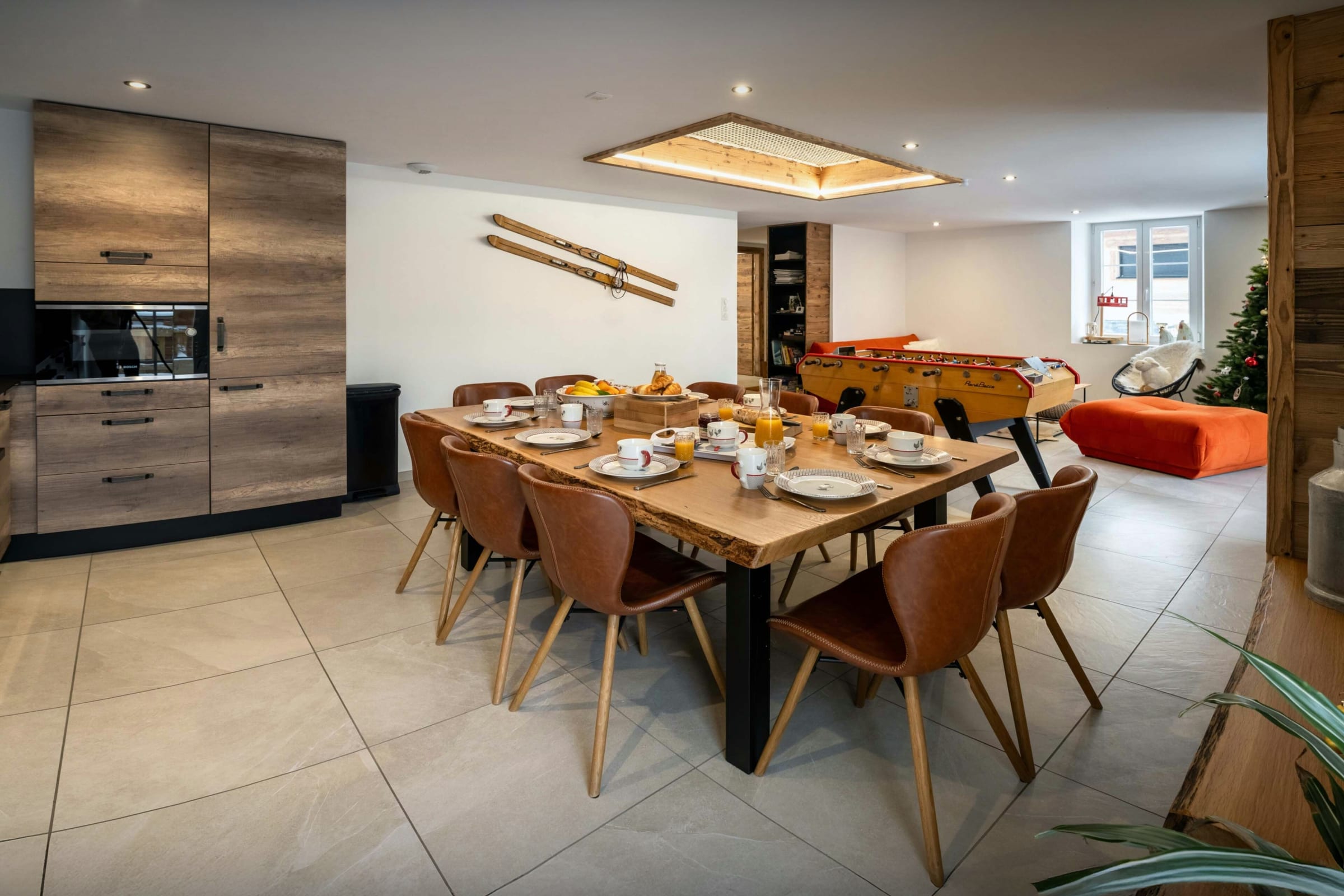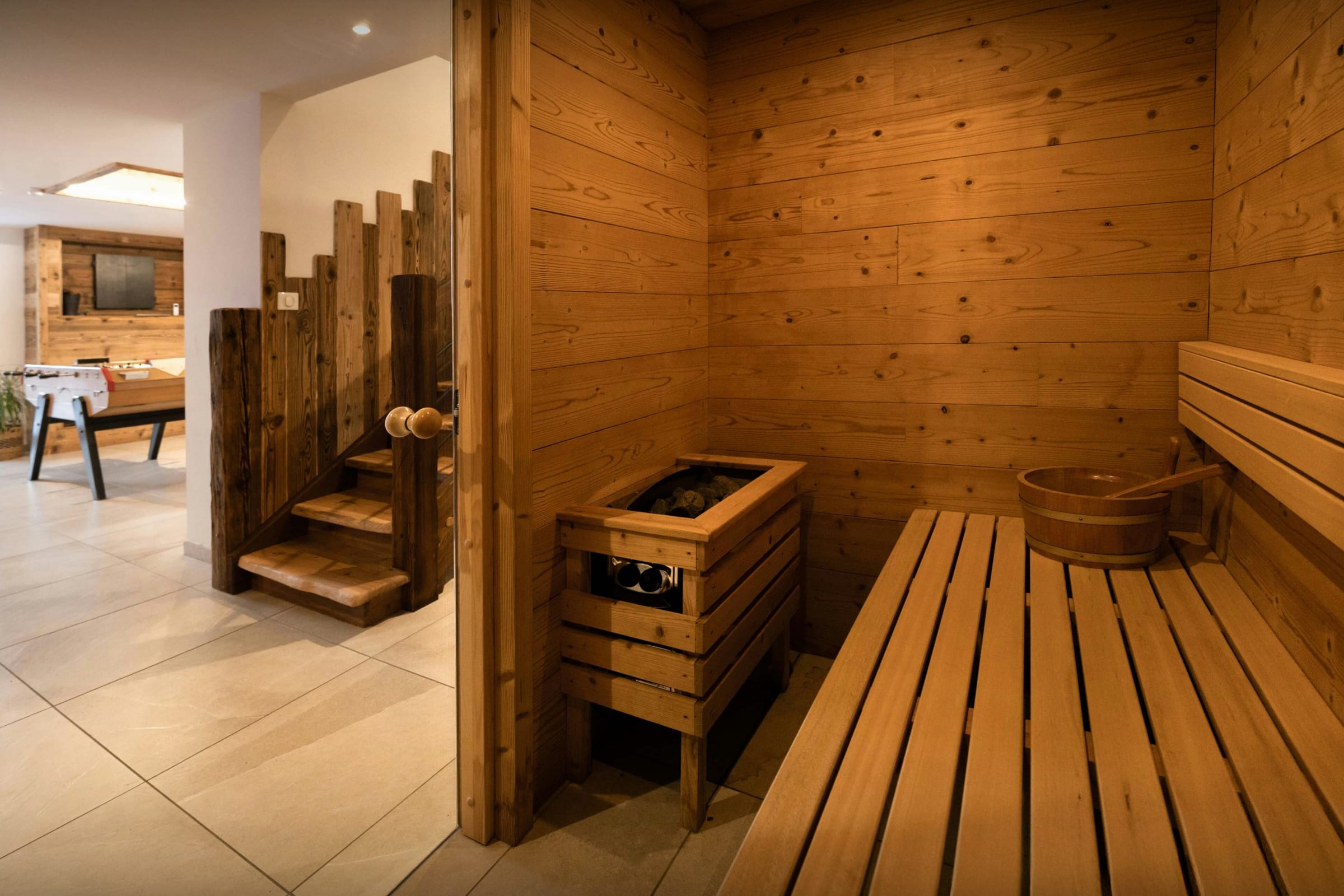 In the living room, you can enjoy cosy evenings around the fire, perhaps watching TV, playing table football or enjoying a game of darts. The room opens onto a terrace where you can enjoy the fresh mountain air from the hot tub – a great way to relax after a day full of activities. The nearby sauna adds to the wellness experience.