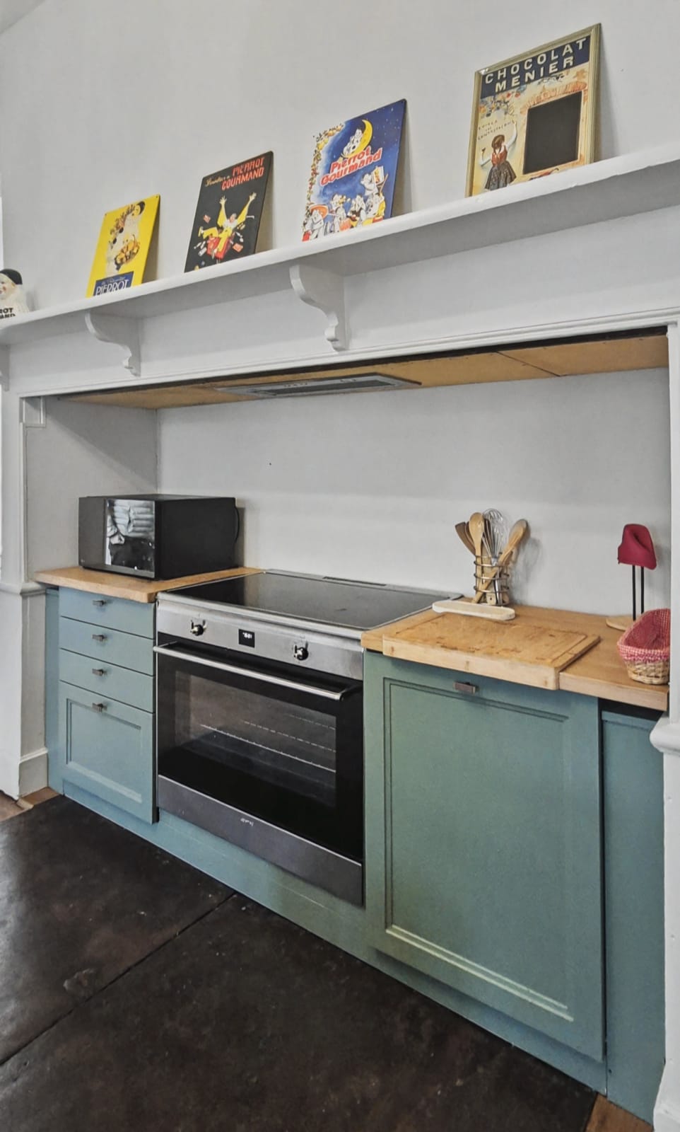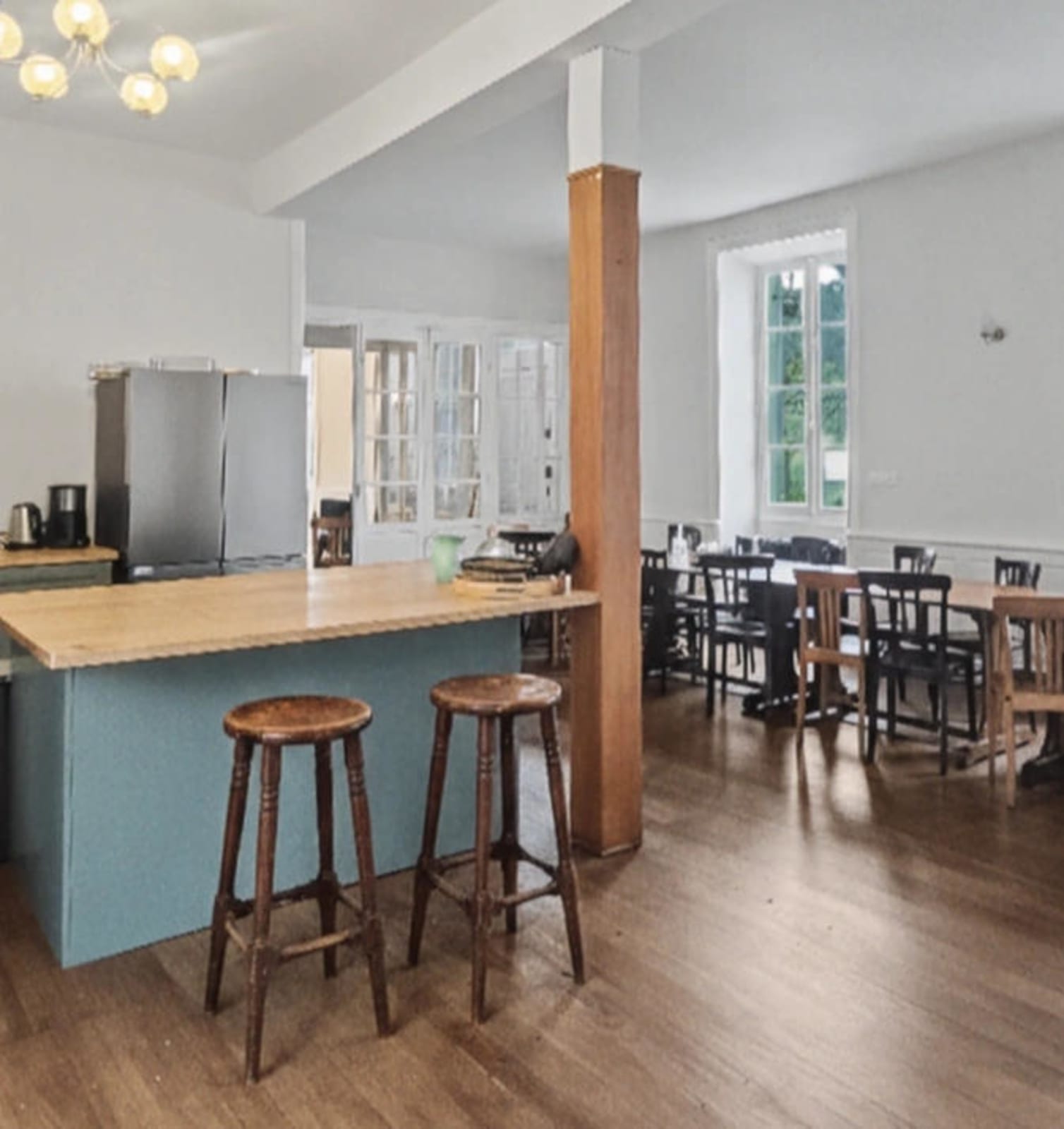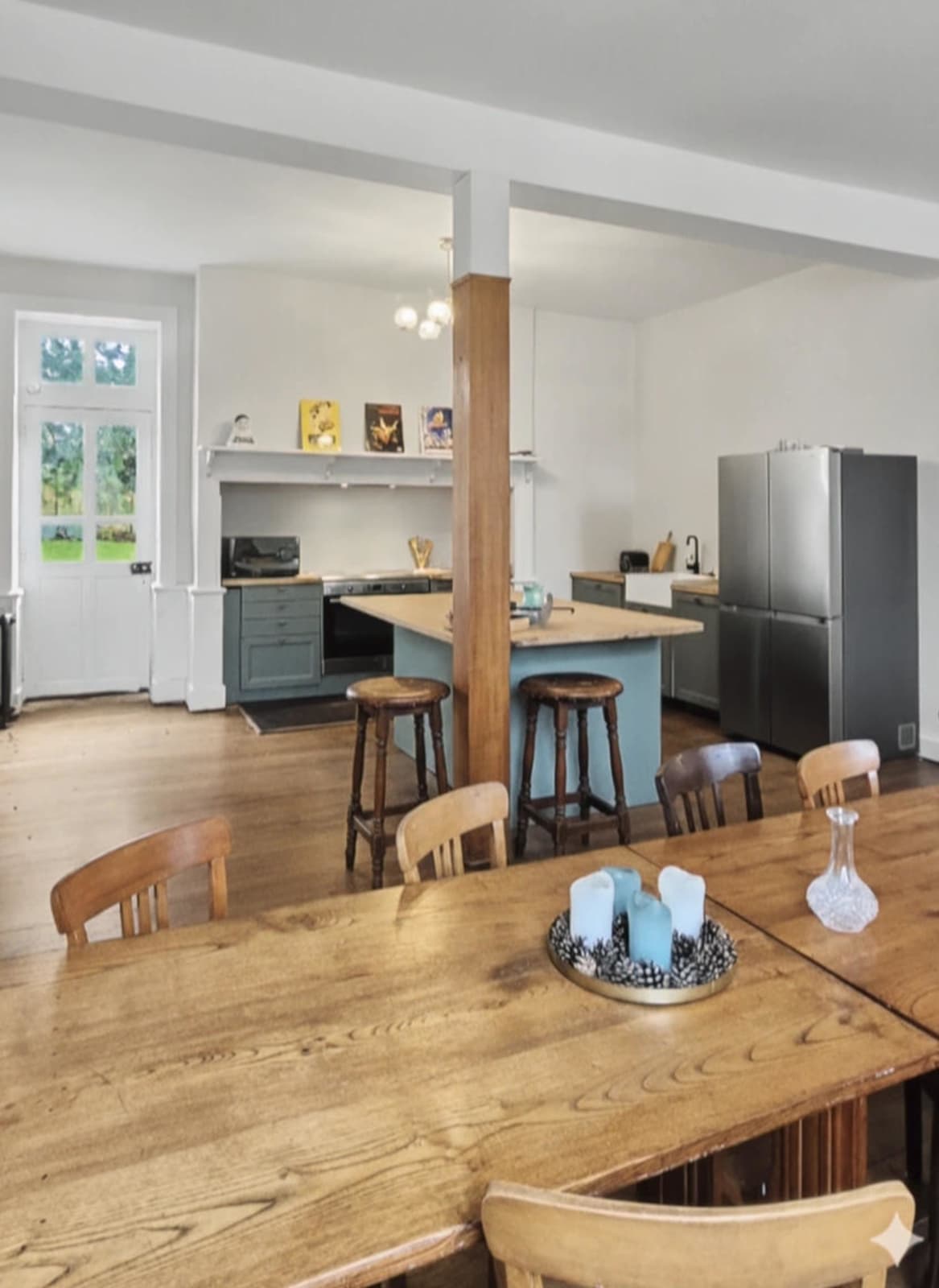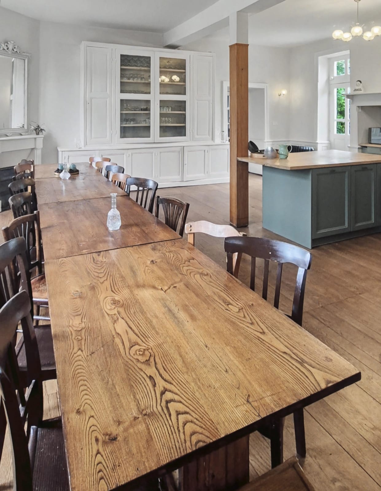 The kitchen/dining room is fully equipped for 12 guests and features a large long table.