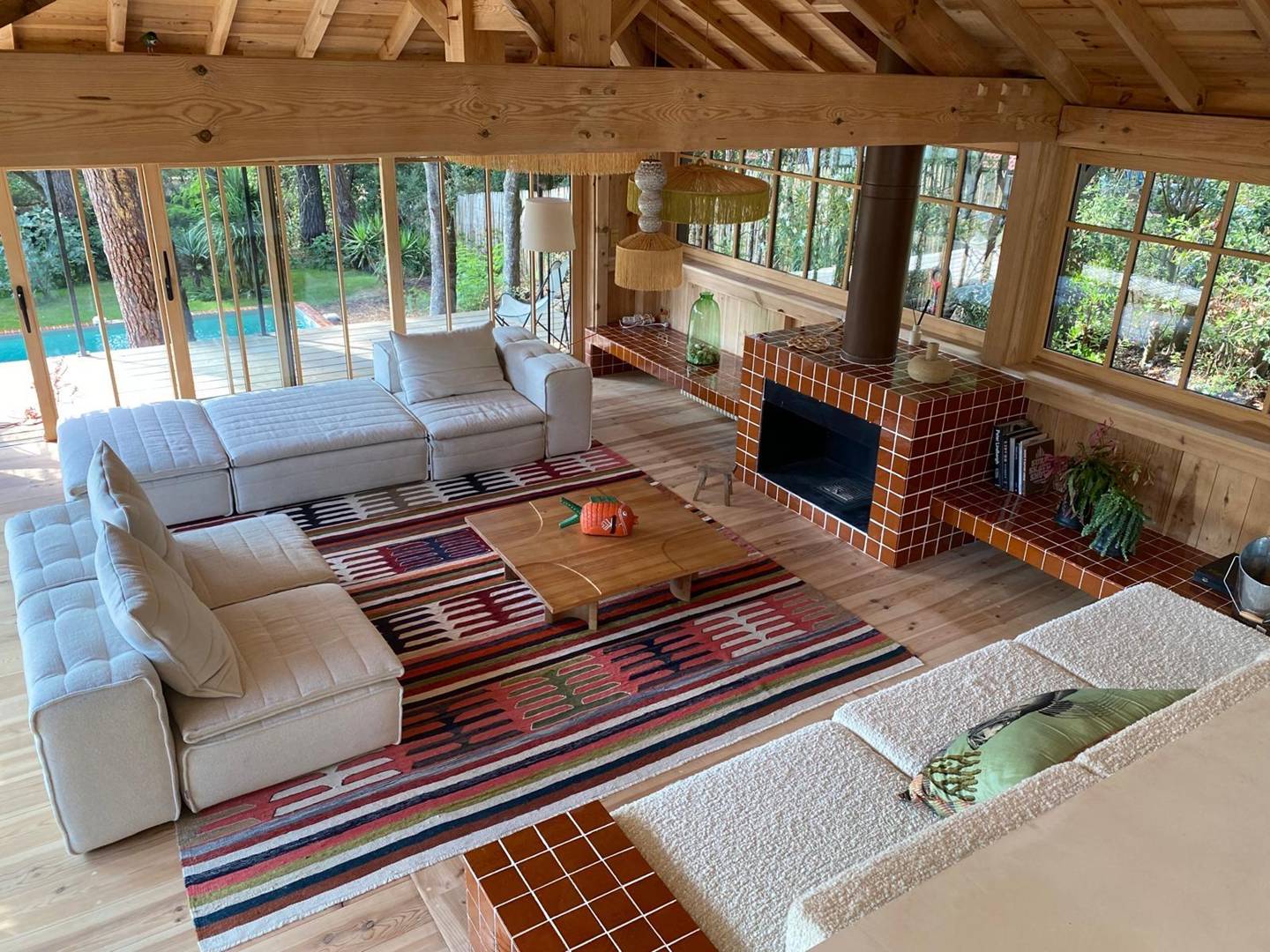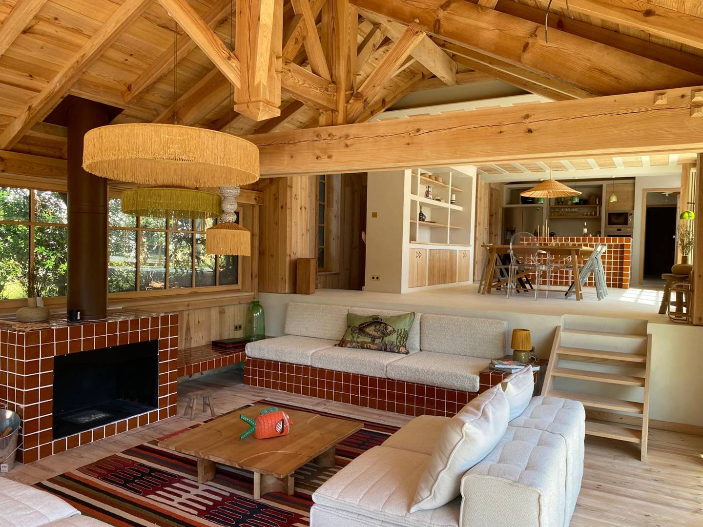 Un magnifique large salon/salle à manger cosy entièrement tourné vers les extérieurs vous permettra de passer d'agréables moments en famille. La pièce de vie est spacieuse et la cheminée rajoute un côté chaleureux au salon. La cuisine avec son ilot est entièrement équipée avec tout le nécessaire (machine à café Nespresso, plaques induction, four, bouilloire, micro-onde, réfrégirateur, lave-vaisselle, machine à laver le linge).