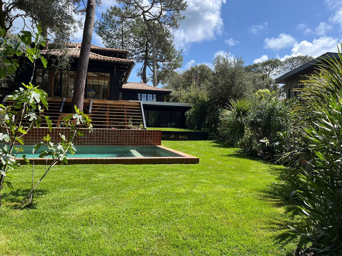 Concernant les extérieurs, le jardin est vaste (terrain de 1 150m2) avec un bel aménagement paysagé. La vue sur le jardin et la piscine depuis la terrasse couverte est très agréable.