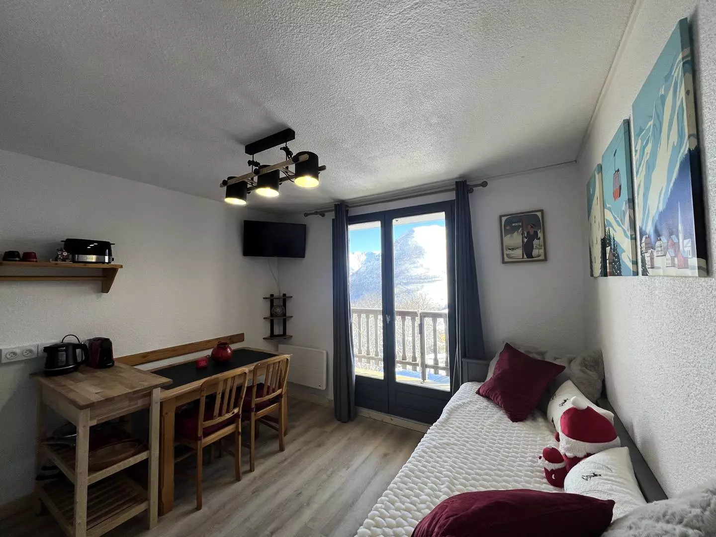 - Living room with equipped kitchenette and access to the balcony (mountain and slope views)