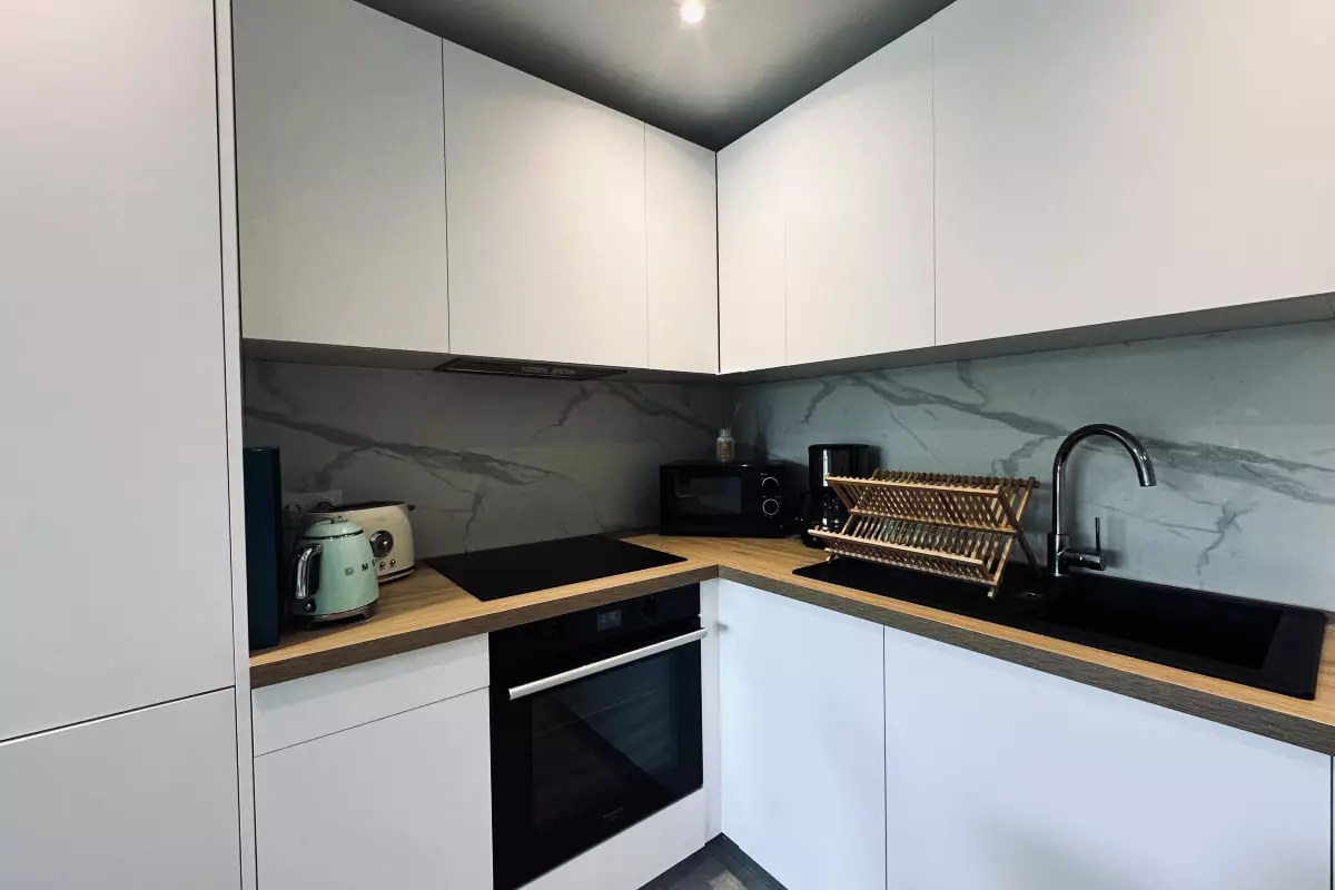 The room features a 160x190cm double bed, perfect for peaceful nights. You'll also find a fully equipped kitchen, a comfortable shower room, and a welcoming living room to relax in after a day of exploring.