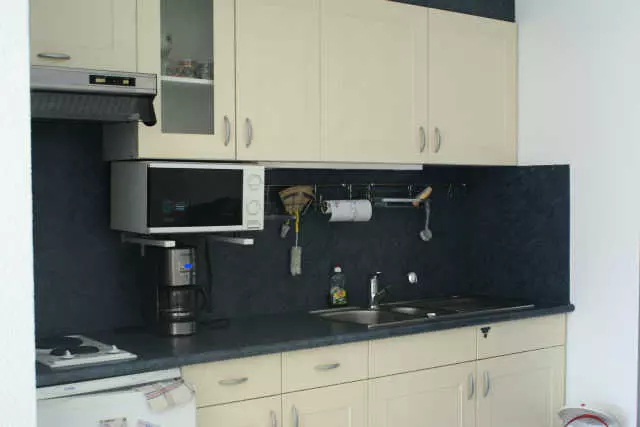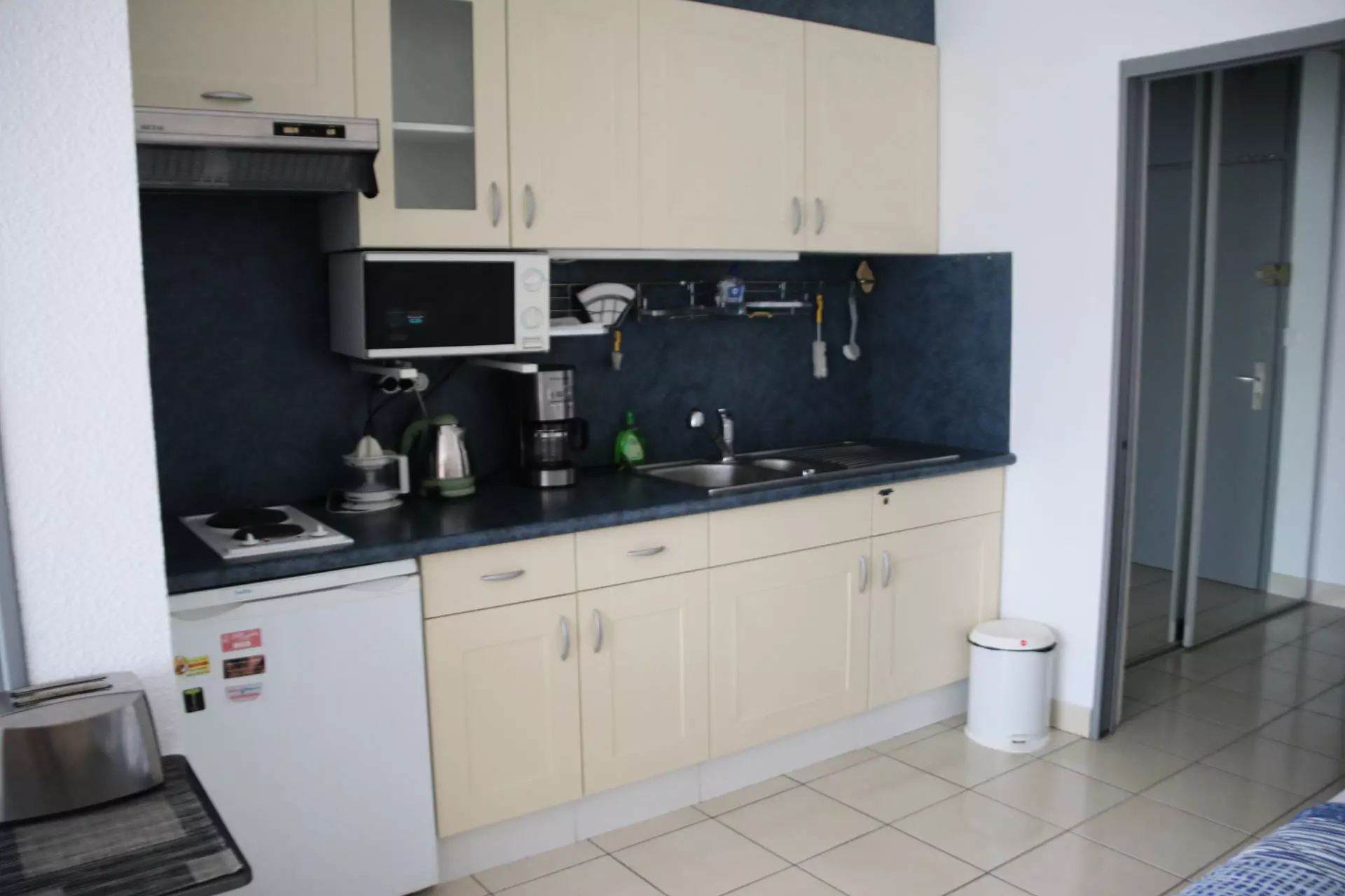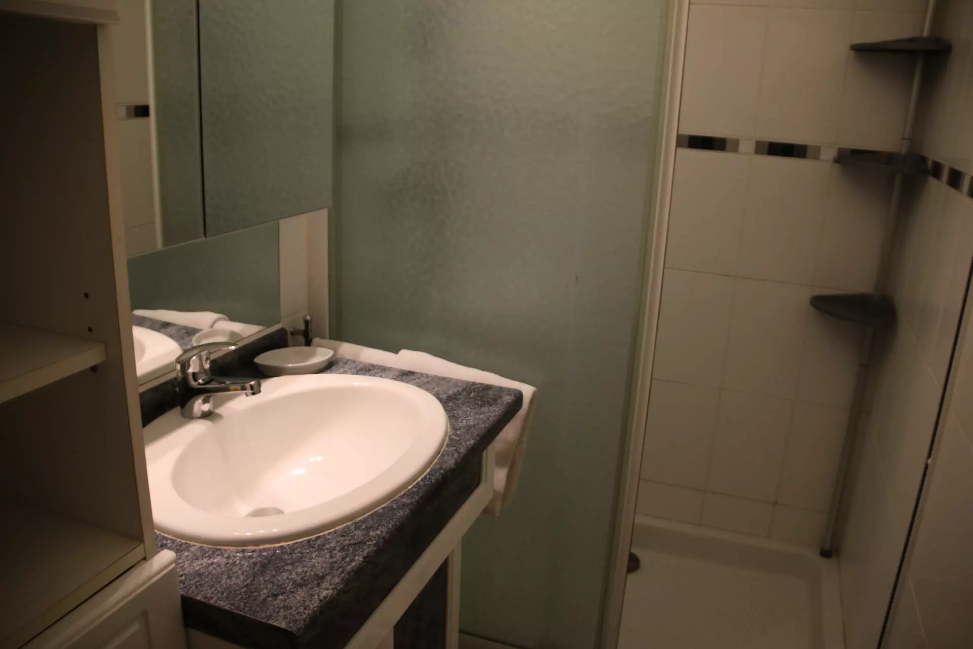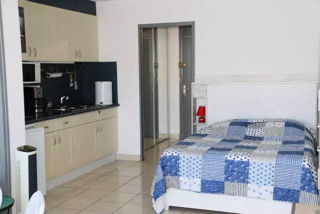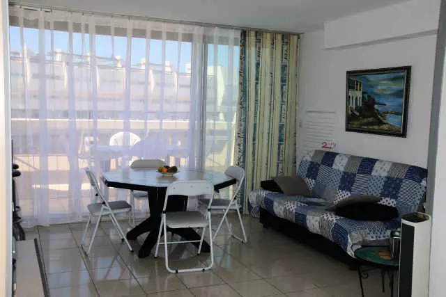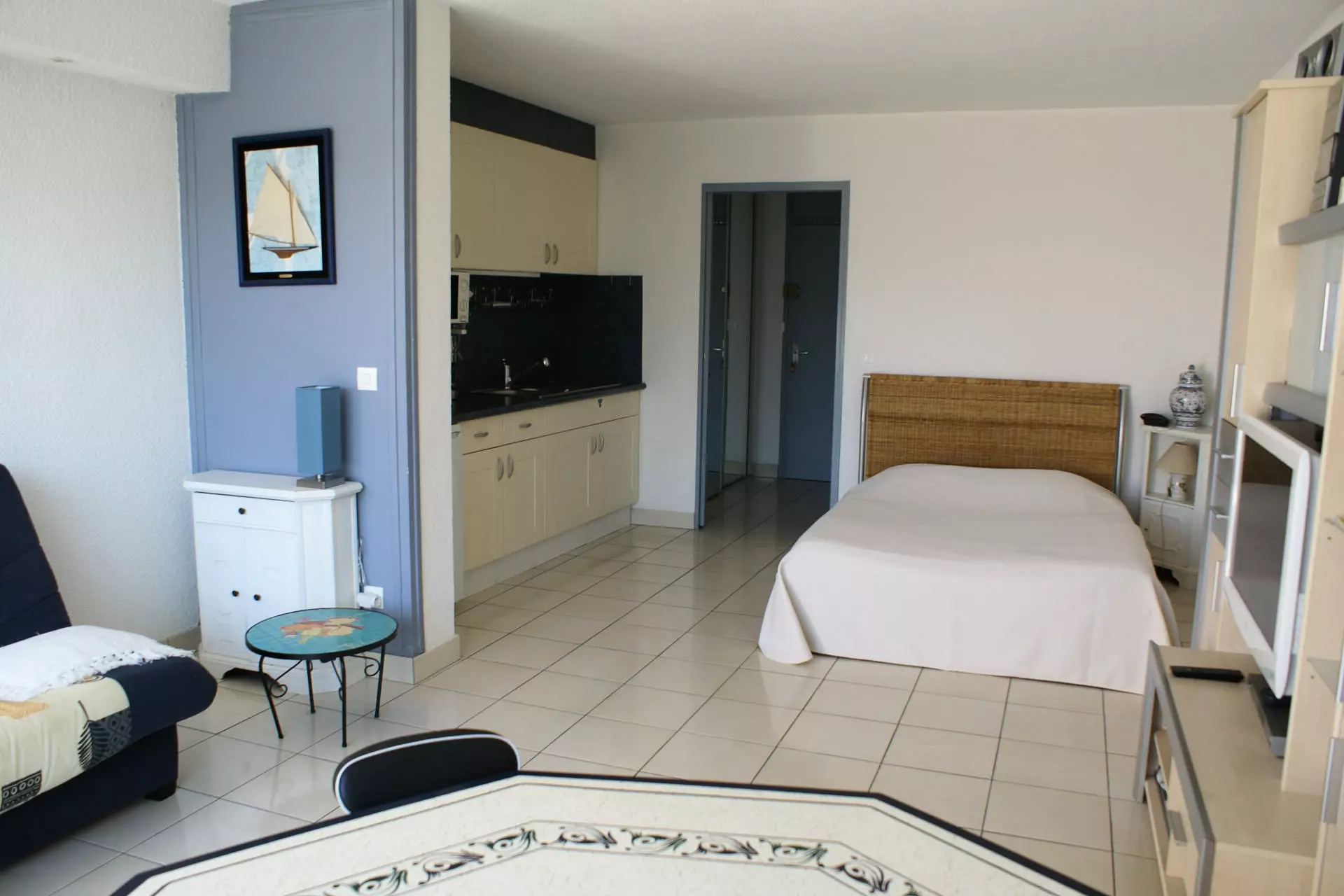Large studio apartment for 2 people, located in Héliopolis, entrance E, on the 2nd floor with elevator, facing Port Nature. Living room with a double bed (140cm). Standing fan. Kitchenette with microwave, vacuum cleaner, etc. Shower room. Separate WC. Terrace with electric awning. Parking space no. 152.