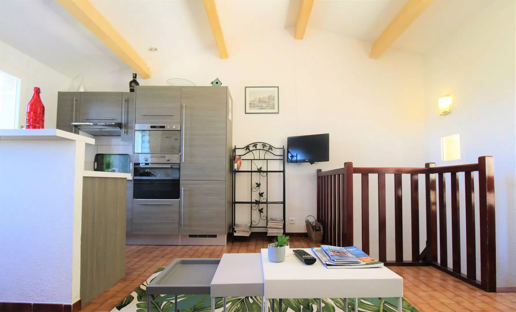 Upon entering, you will find the living room with an open-plan, fully equipped kitchen and a sofa bed in the lounge. A beautiful, unobstructed view overlooks the countryside.