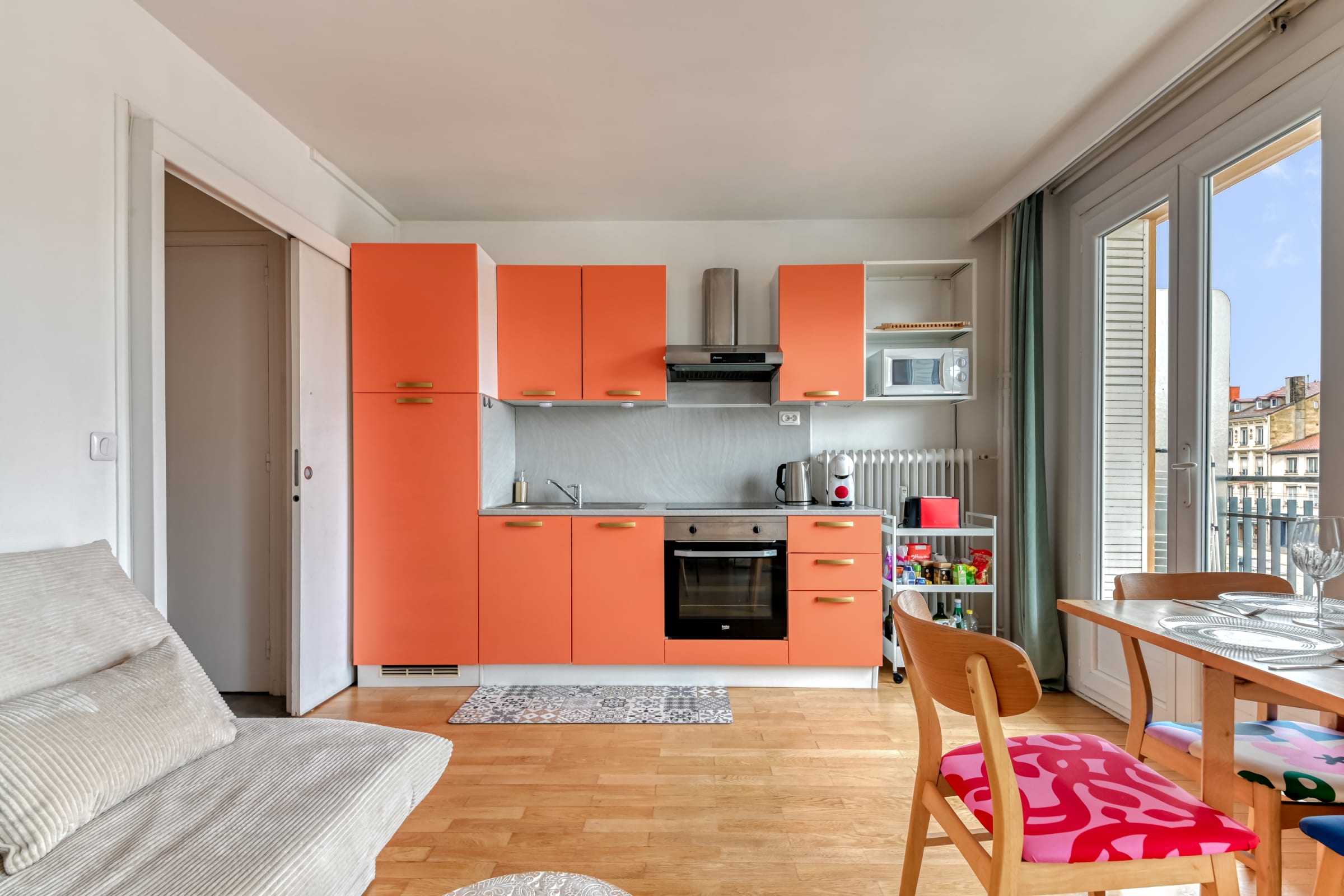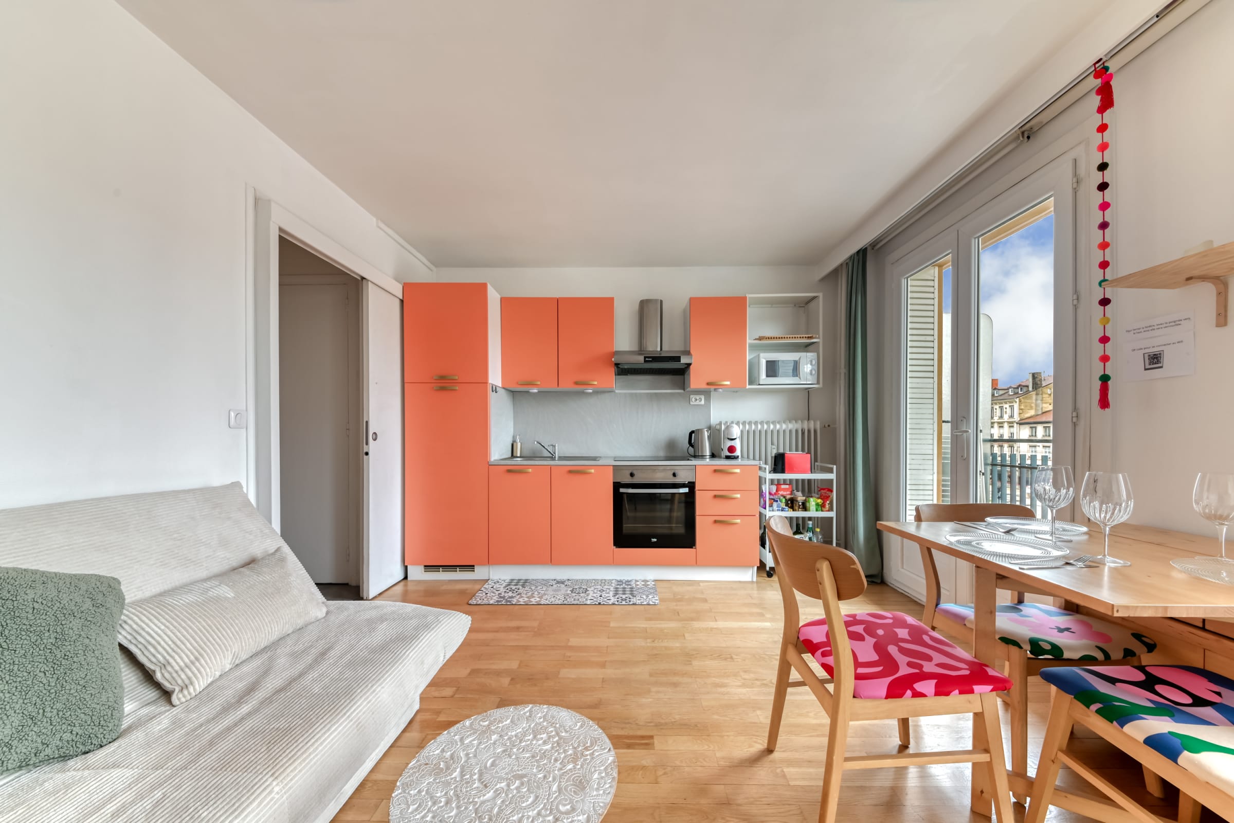 - a spacious, bright living room with sofa bed and dining area,