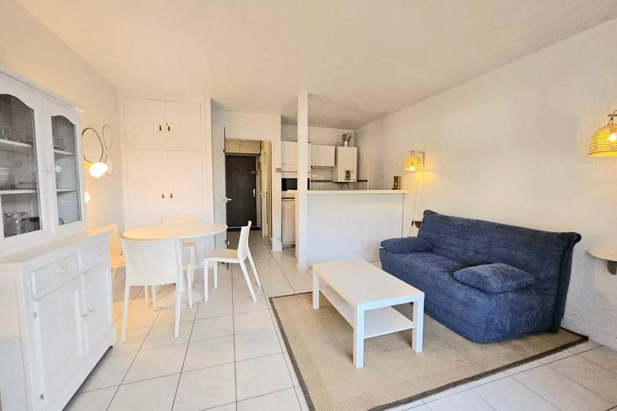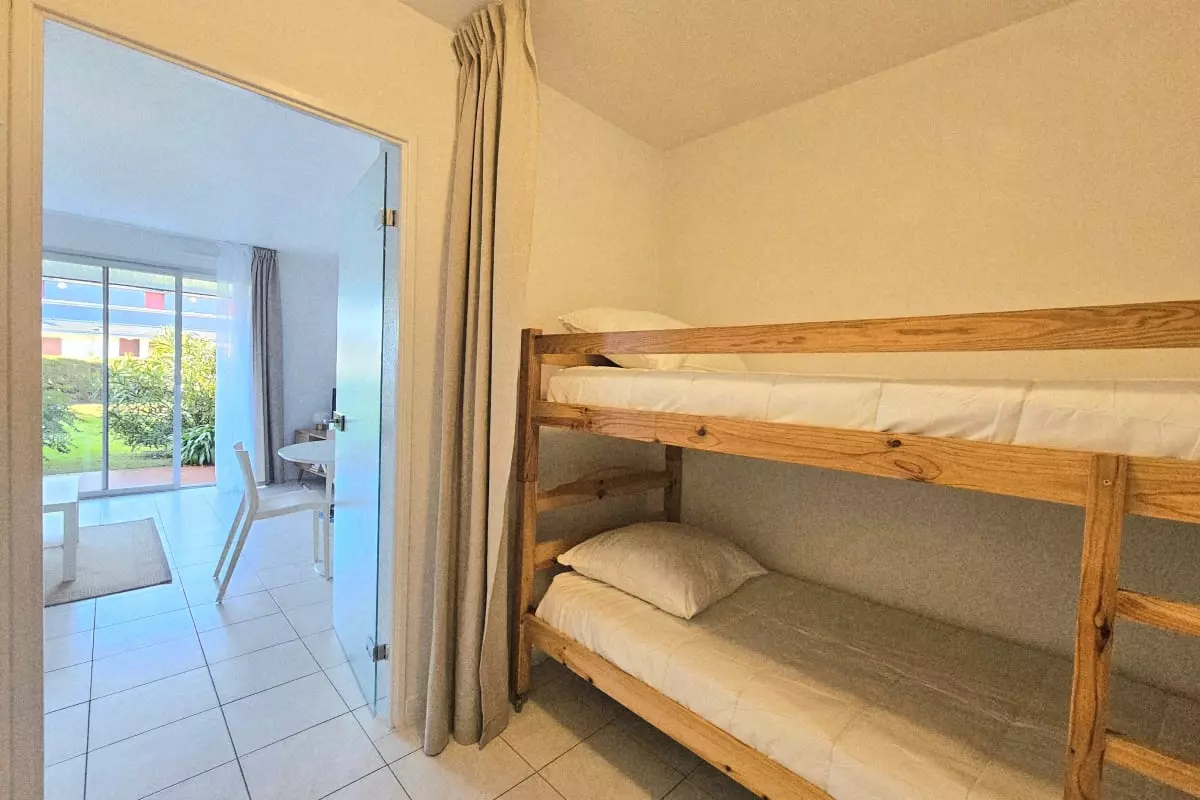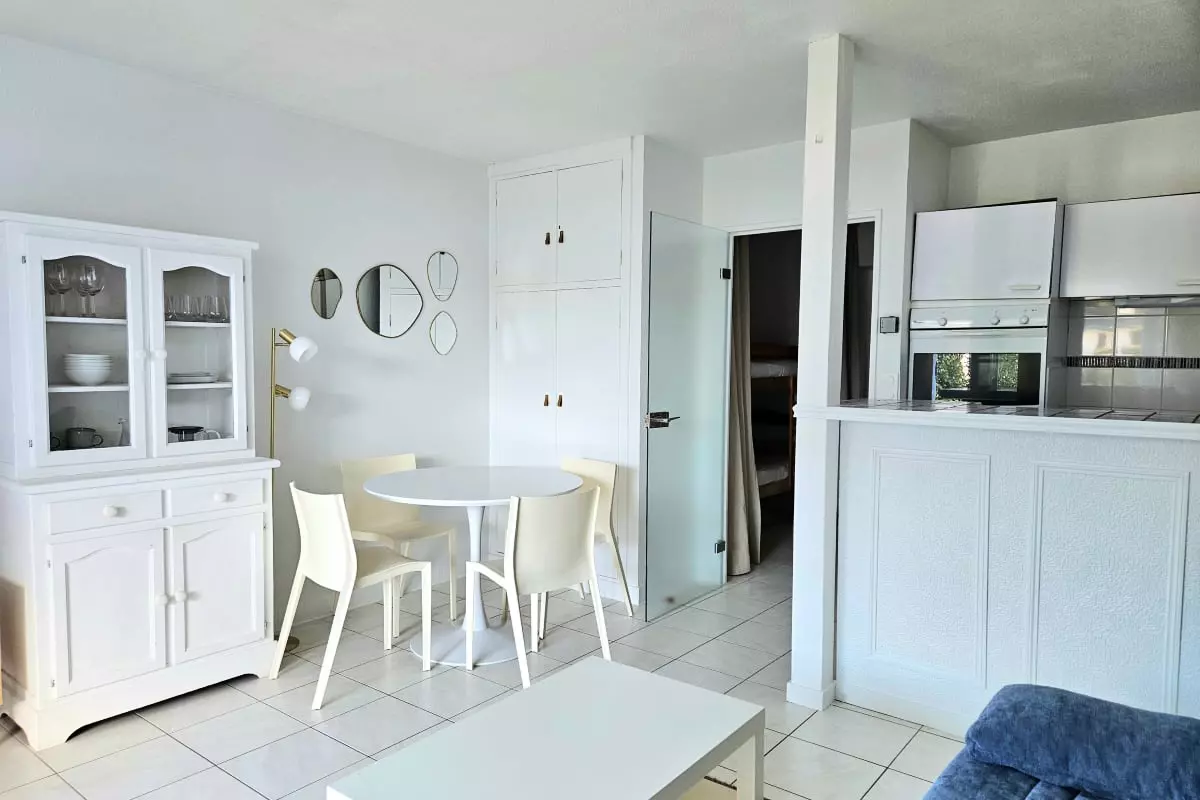 Located in a very quiet and green residence, the studio includes a sleeping area with a bunk bed, a functional shower room, a fully equipped kitchen and a relaxation area with a 140x190 sofa bed.