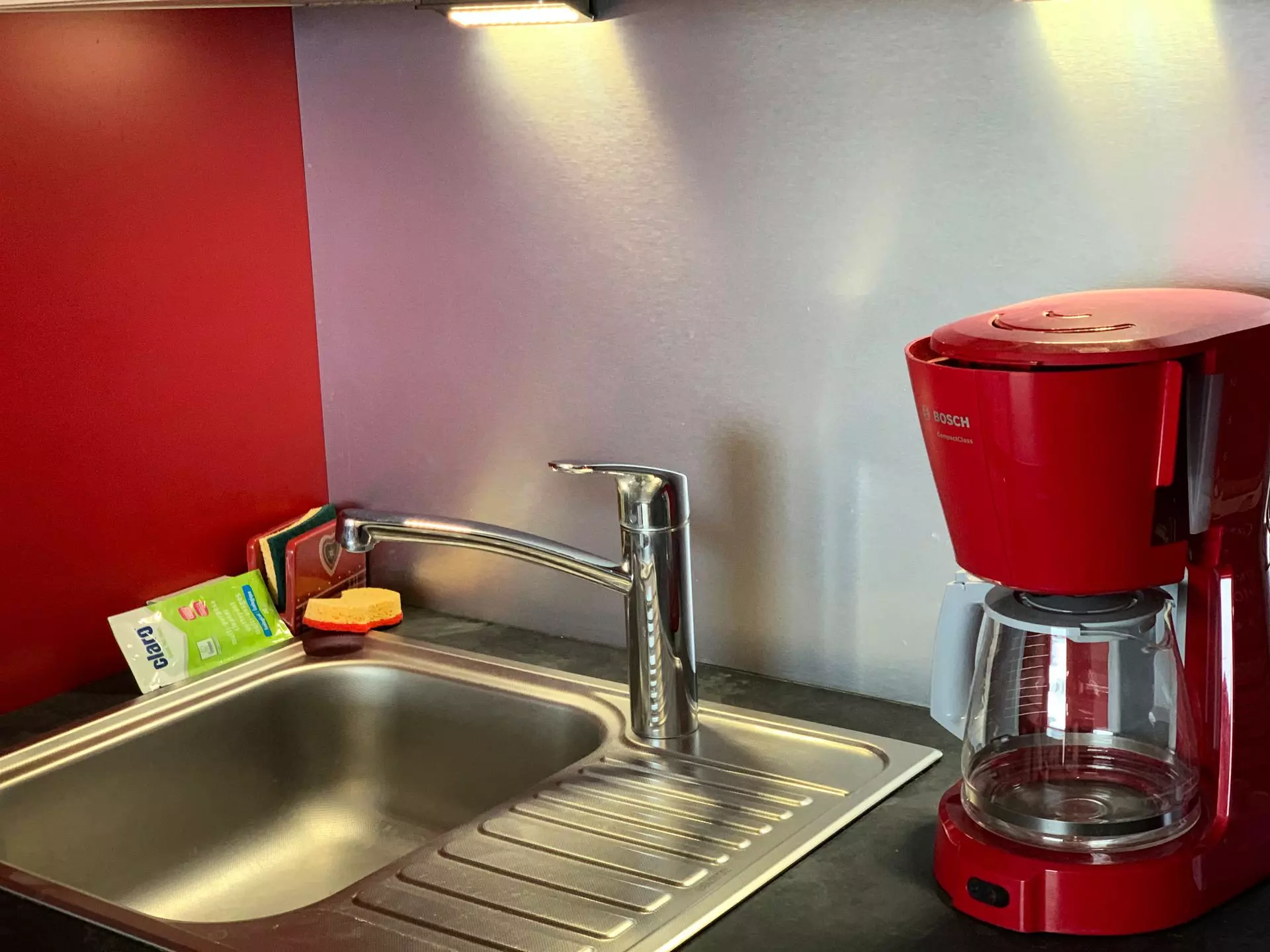 Kitchenette including: ceramic hob, mini oven, dishwasher, microwave and refrigerator.