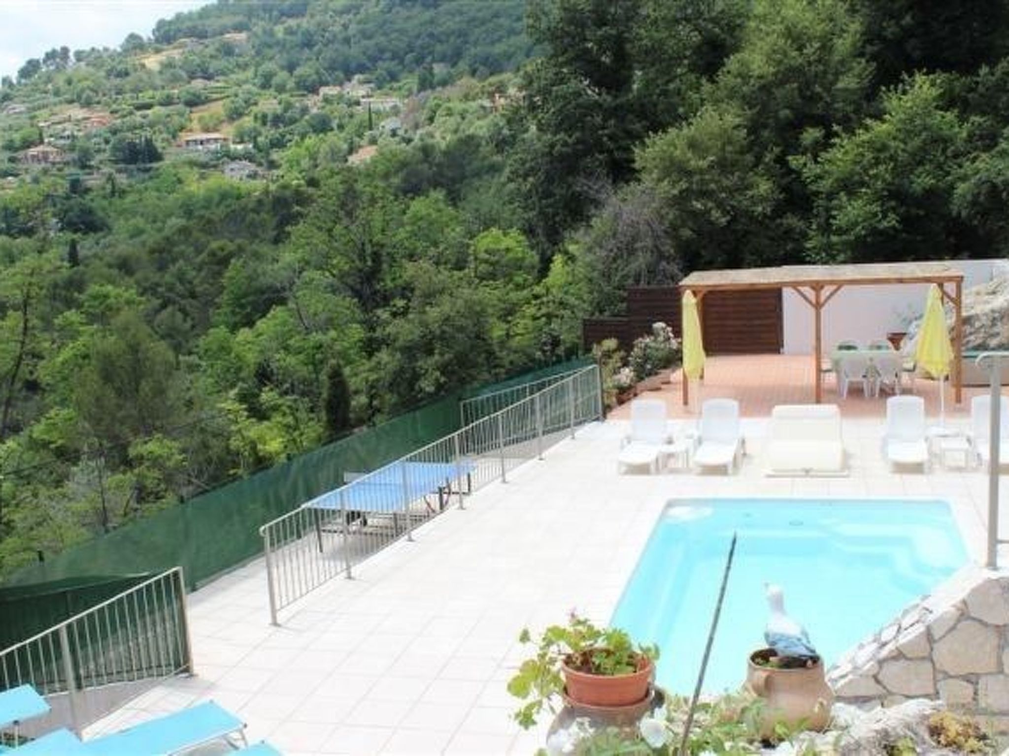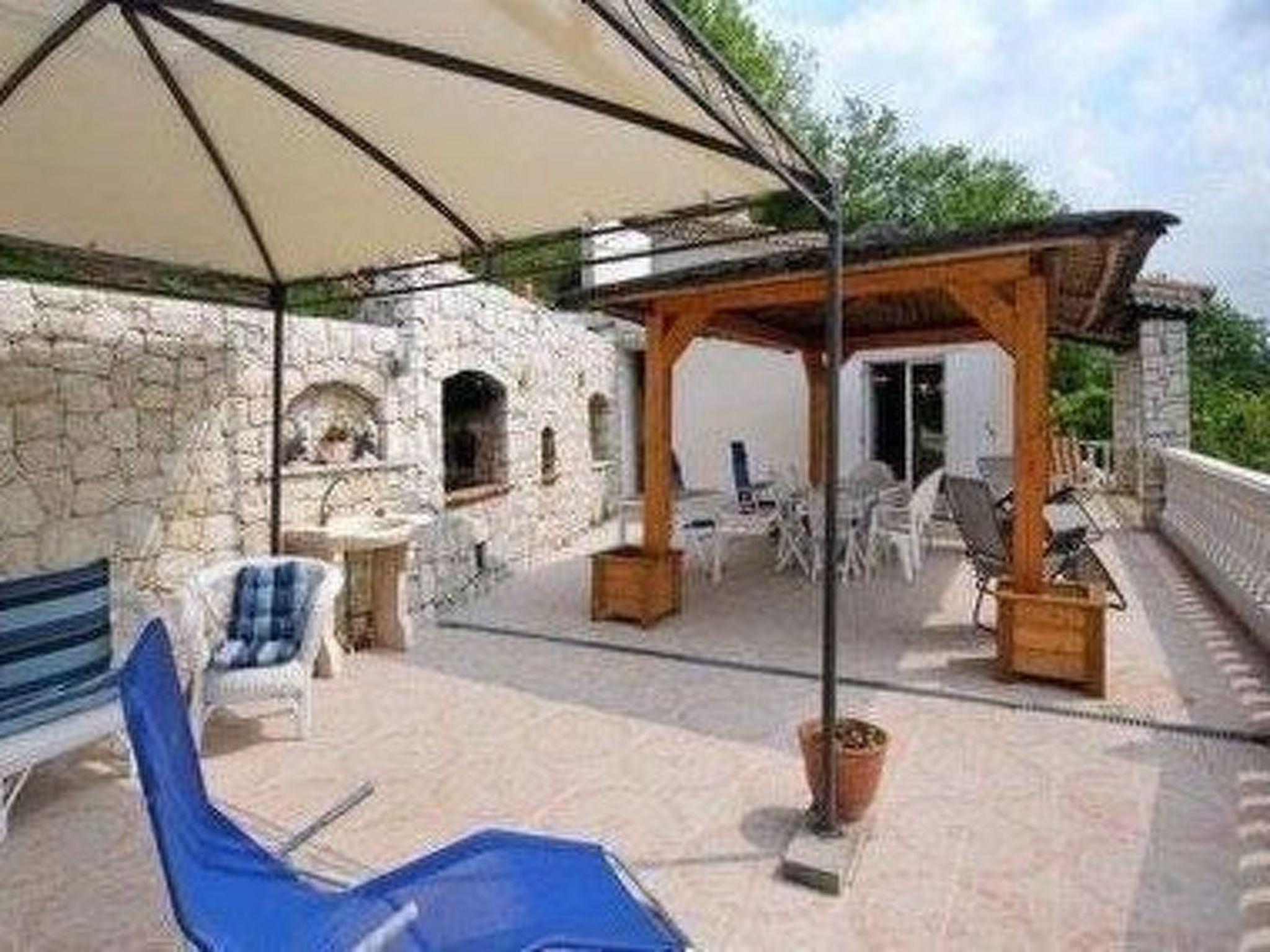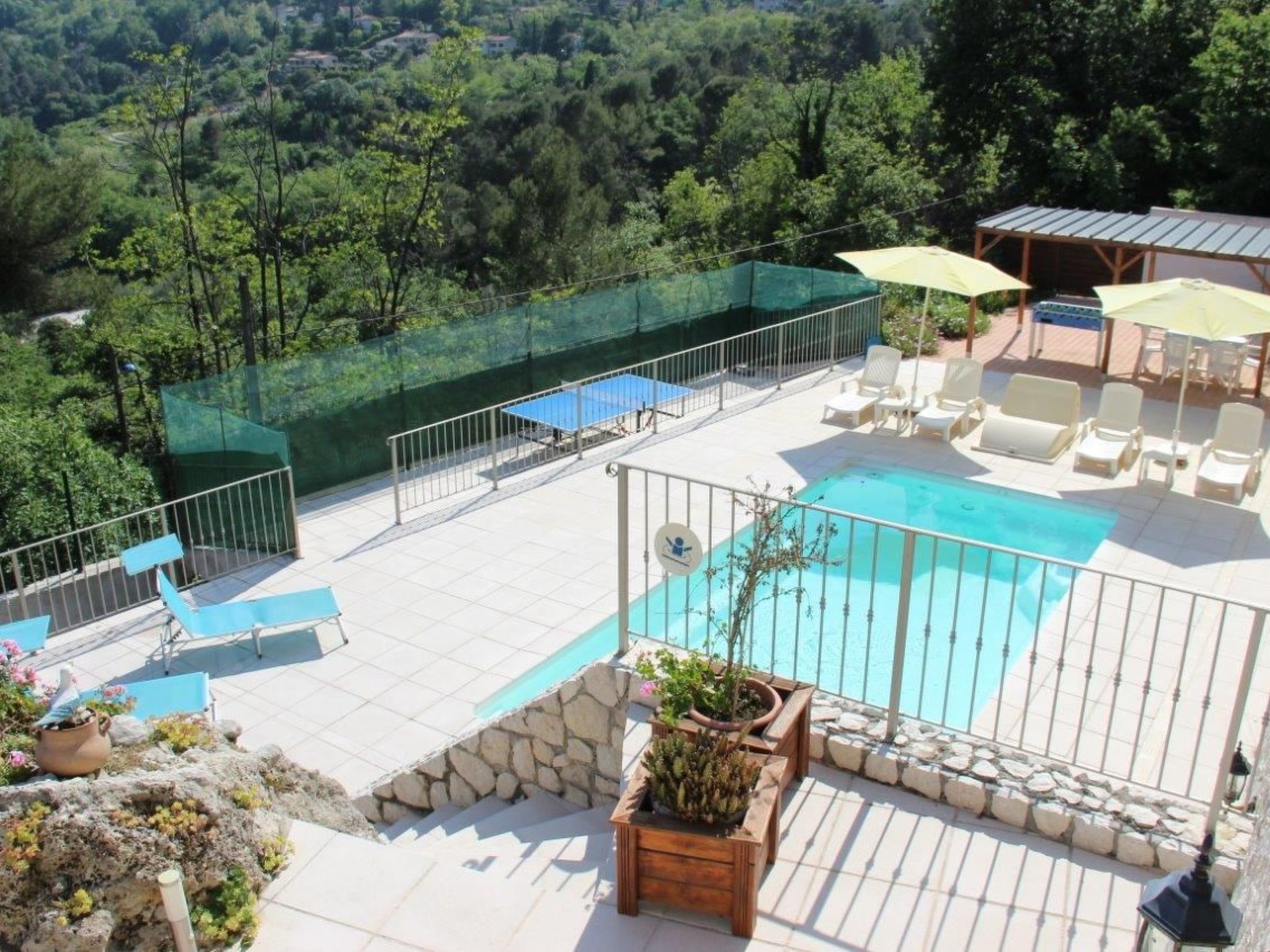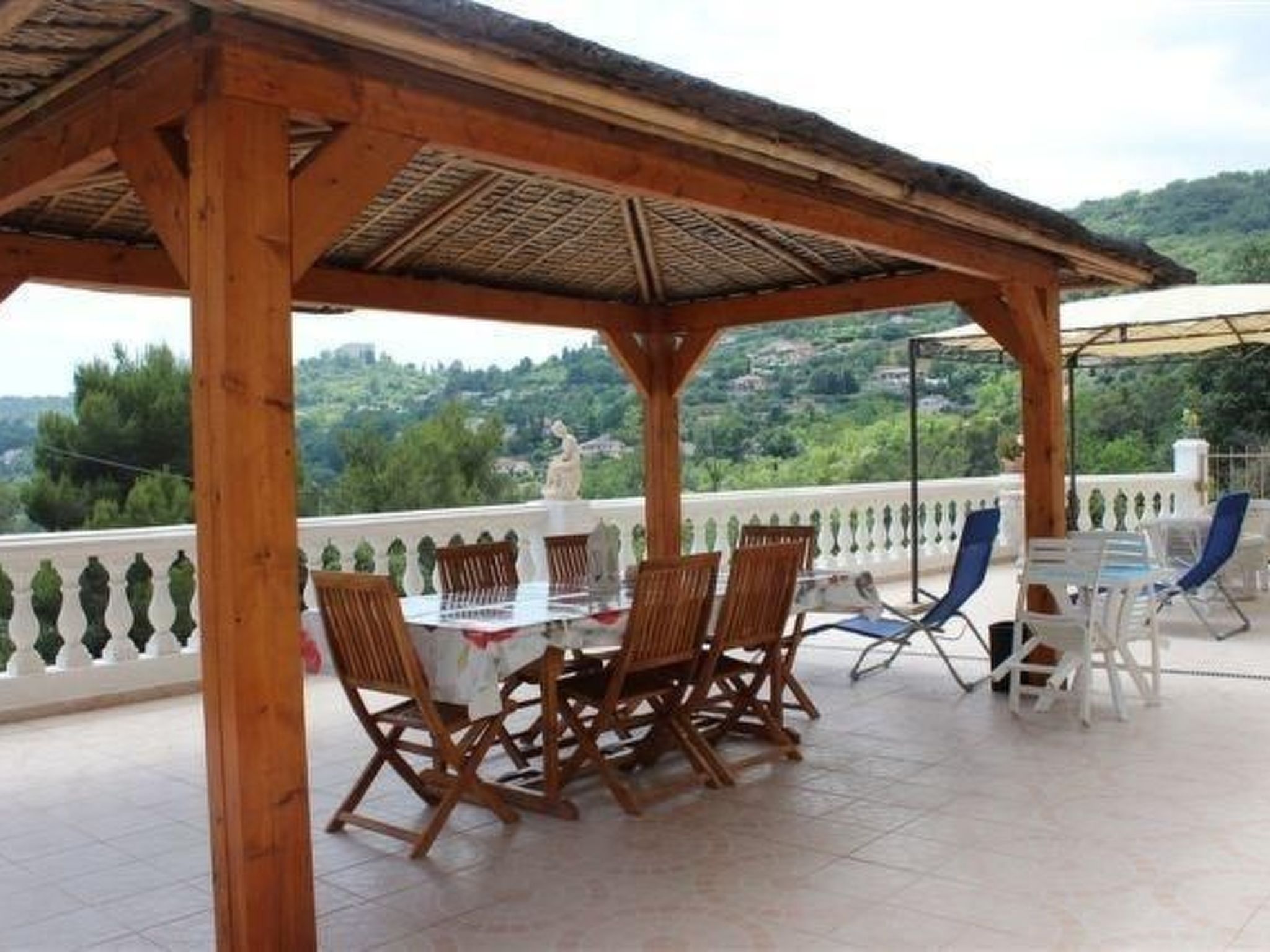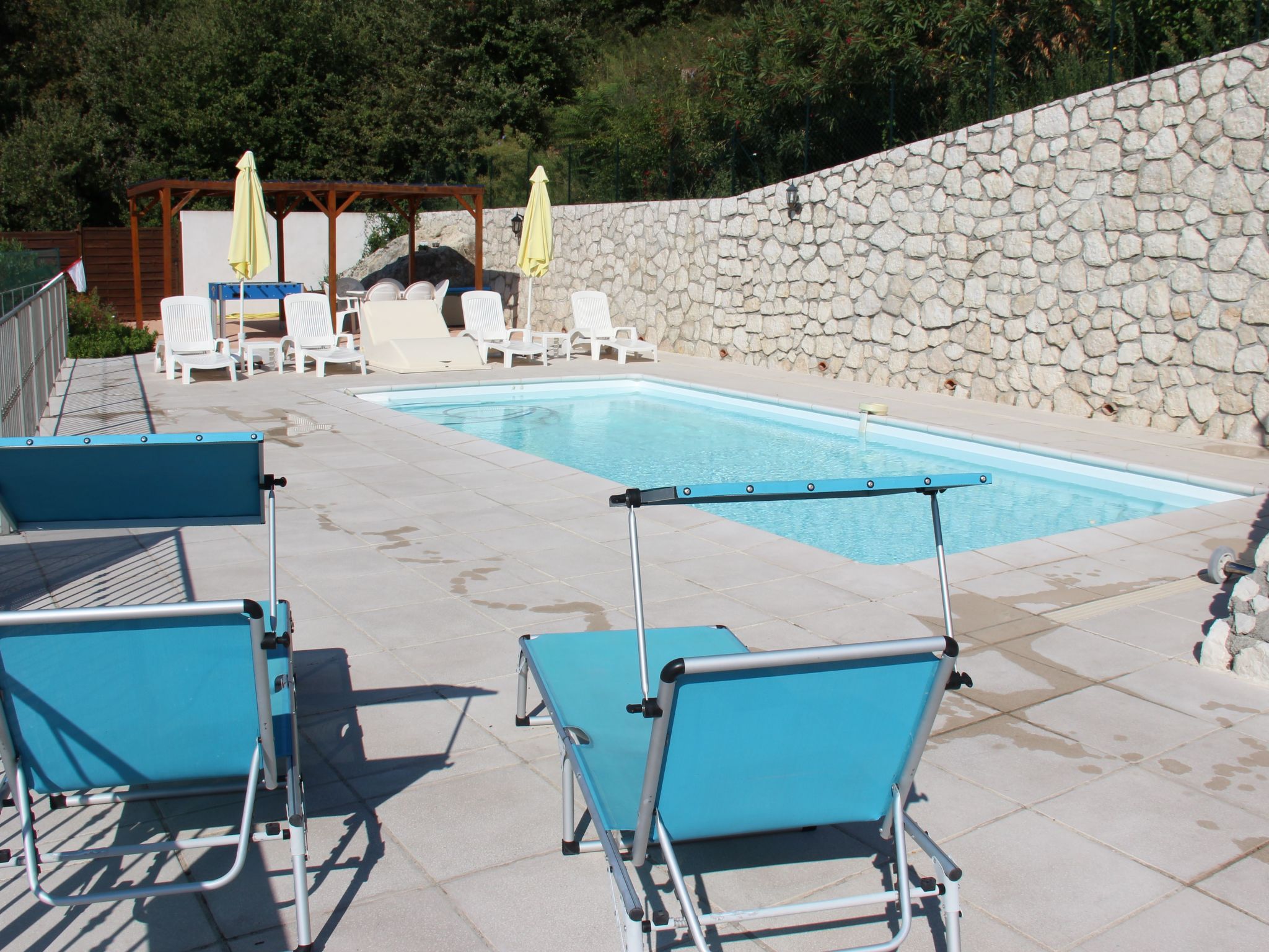 The 80 m² terrace, enclosed and protected from the sun, communicates with the living room. Here you can enjoy absolute peace and quiet. Parents can relax while the children play. The terrace has an arbour (5 x 3 m) and a pergola (3.5 x 3.5 m), a barbecue, a wall-mounted pizza oven, garden furniture, a table and chairs and sun loungers. This means you can spend plenty of time outside enjoying the barbecue, eating, relaxing and lounging. From the terrace, you can access your own private swimming pool (8 x 4 m, 1 m to 1.70 m deep), filled with chlorine-treated water and situated just below. Thanks to its sunny location, it's already a pleasant temperature early on. The 200 m² paved area around the pool is furnished with six sun loungers, two parasols and a solar shower. It enjoys all-day sunshine and magnificent sea views. Enjoy the peace and quiet as you listen to the birds and cicadas. For those who like to be a little more active, a table tennis table and table football are available. The property has an automatic entrance gate, automatic lighting and two parking spaces.