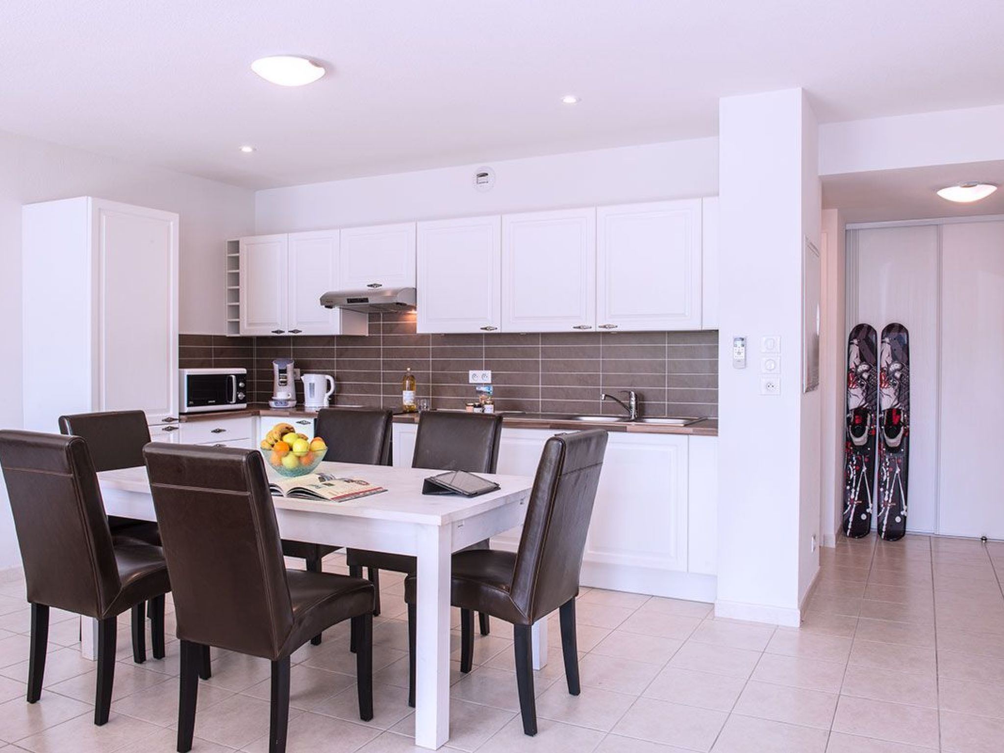The 130m2 4-bedroom flats for 10 people with mezzanine consist of a large living room with flat-screen TV and air conditioning, sitting area with 2-seater sofa bed and dining area. Wood-burning stove. Fully equipped kitchen with microwave, oven, dishwasher, Senseo, fridge with freezer.