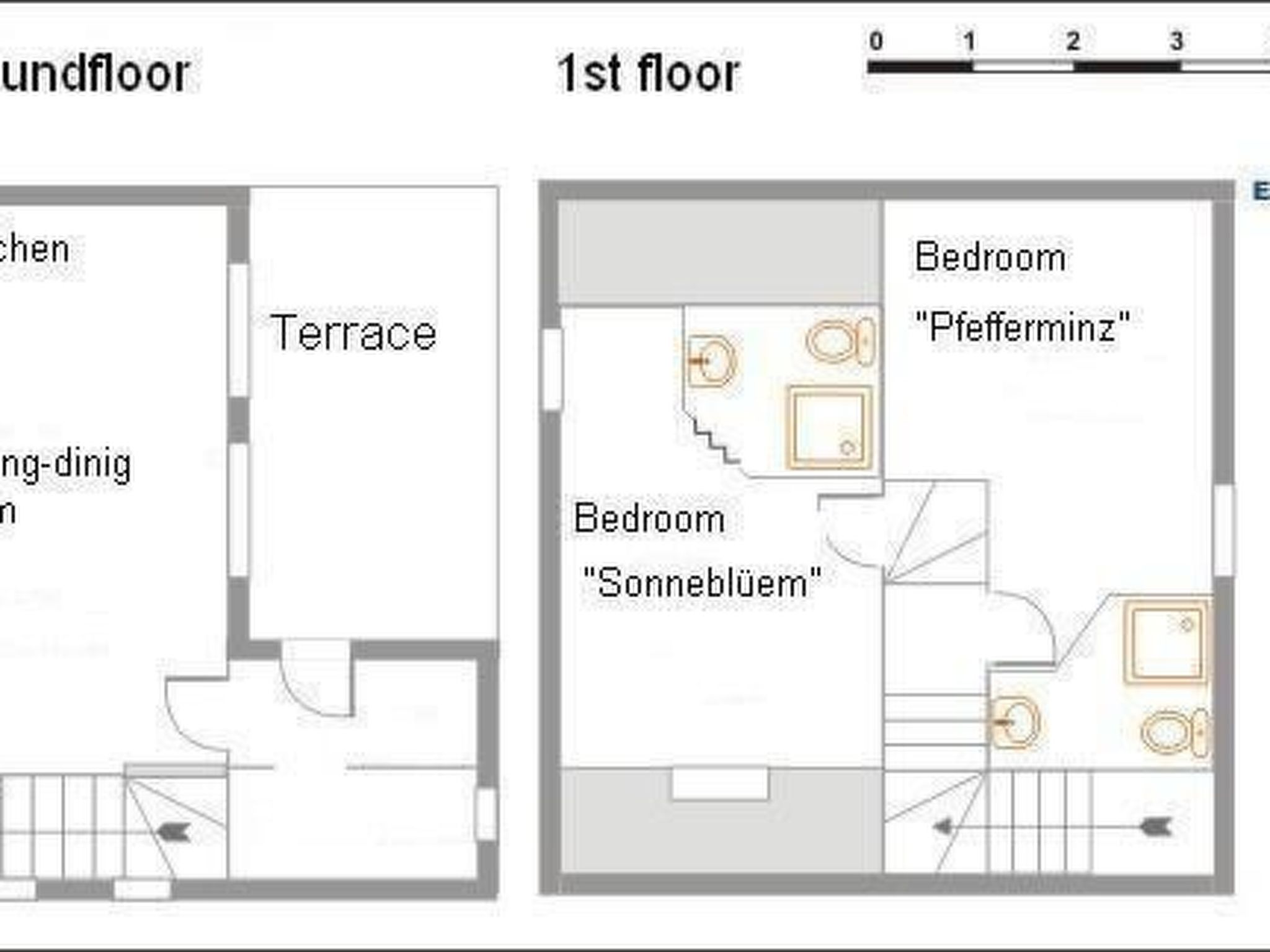 This charming traditional half-timbered house has 43 m² of living space (not including the eaves) and can sleep four people. The former 18th-century barn has been completely converted. As a result, the house now offers all modern comforts while retaining its typical features. The living room with its open-plan kitchen has a comfortable sofa and armchair, as well as cable TV. The kitchen with dining area is modern and fully equipped with cooker, oven, coffee maker, toaster, fridge-freezer, washing machine and microwave. The two bedrooms and two bathrooms are on the upper floor. The bedroom has a double bed, the other has two single beds which can be joined together (please inform the owners if this is your wish). Both bathrooms are equipped with washbasin, shower and WC.