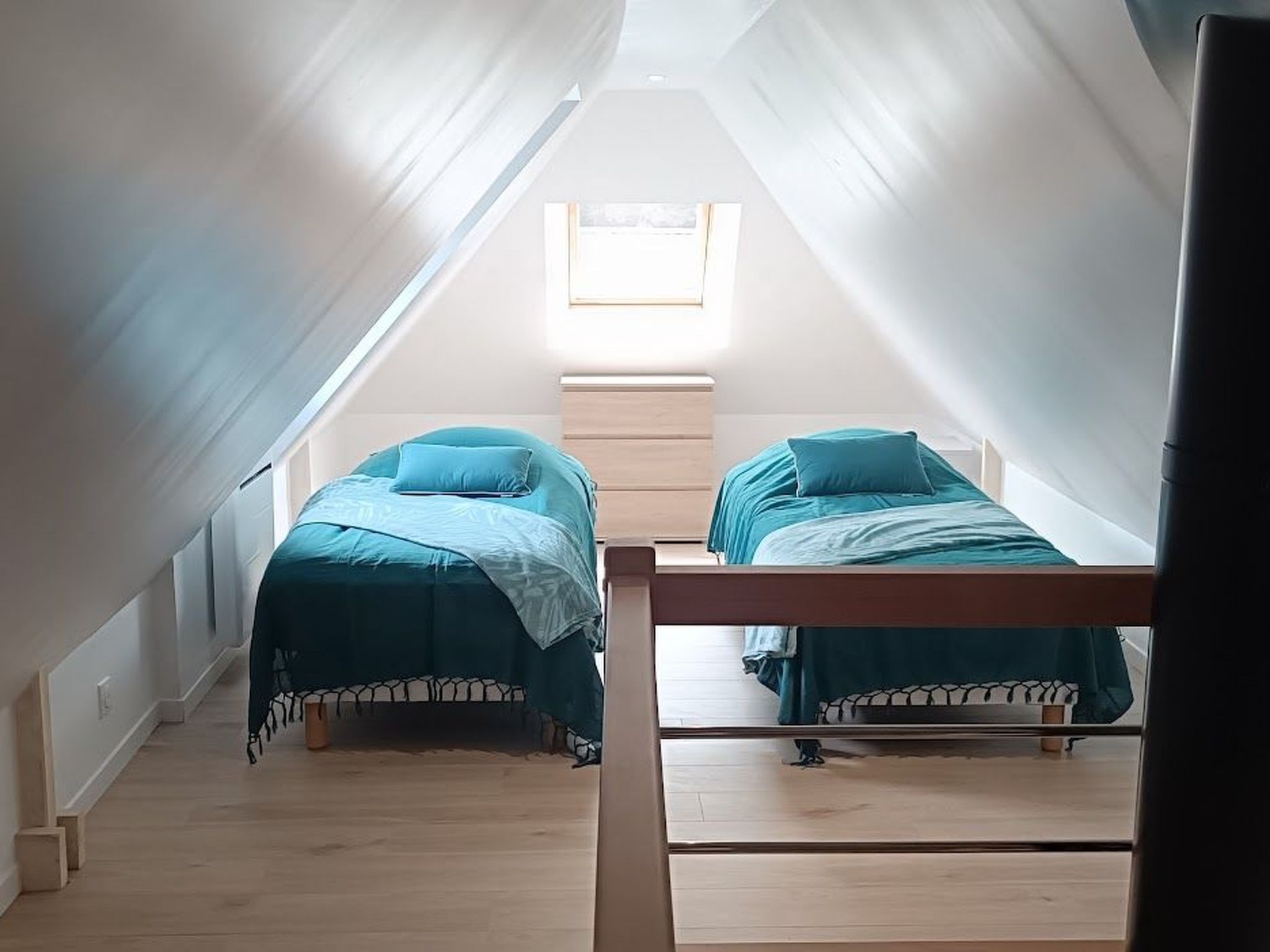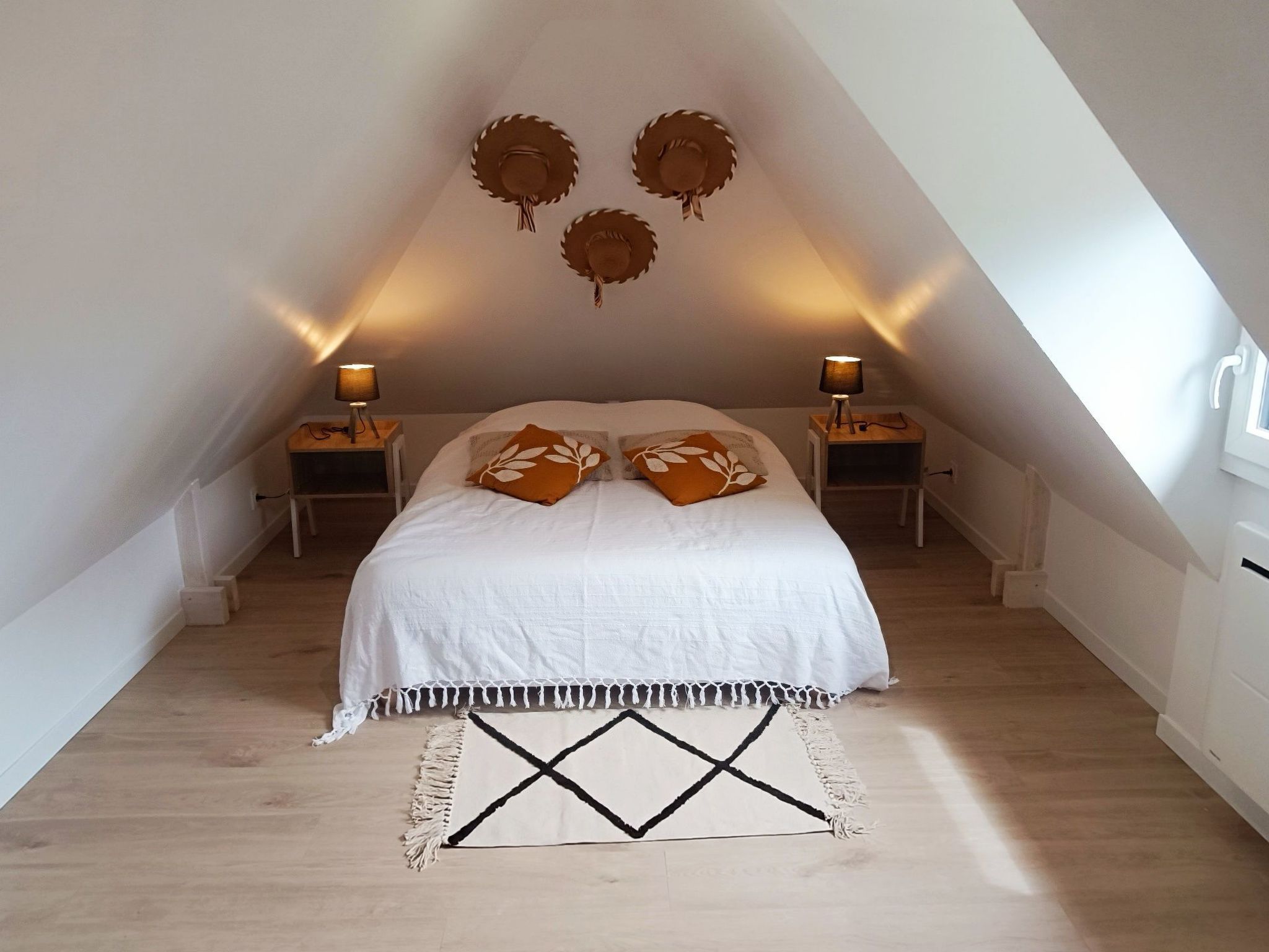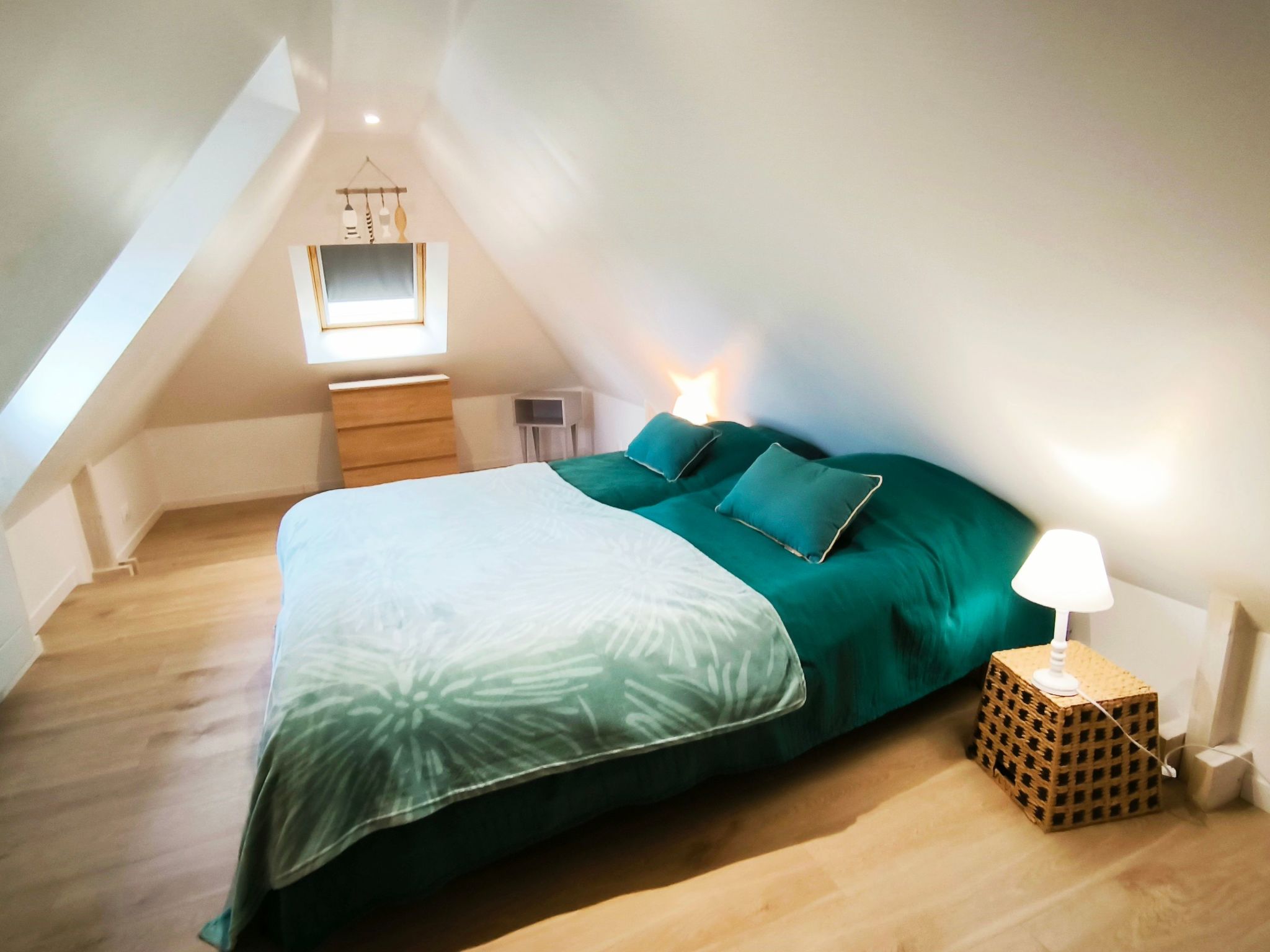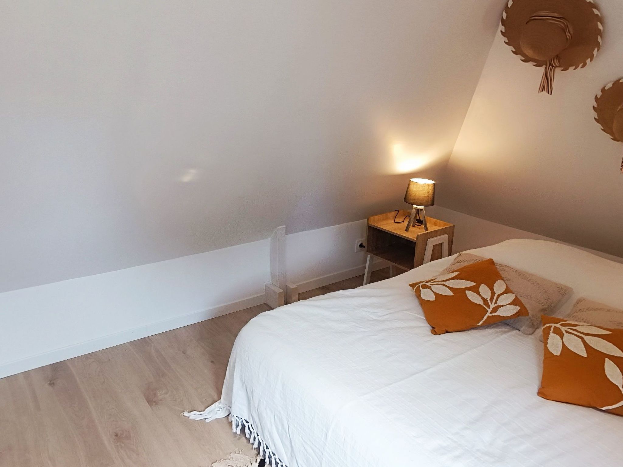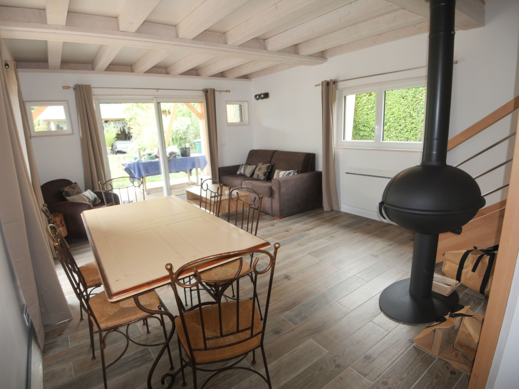 Inside, you'll be greeted by a bright living room with bay window overlooking the garden. The separate kitchen, fully equipped with oven, 12 place dishwasher, microwave and induction hob, invites you to prepare tasty meals. For your comfort, the house has a ground-floor shower room with shower, WC and hairdryer, as well as a second separate WC and a bedroom with a 160 cm bed. The wood-burning stove creates a cosy atmosphere in the house, which is fully tiled on the ground floor and has parquet flooring on the floor, where there are two attic bedrooms, one with a 140 cm bed, the other with two 80 cm beds that can be converted into a 160 cm bed.