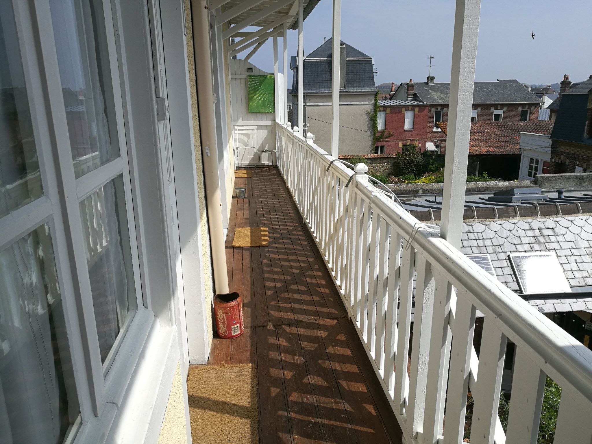 The charm continues outside with a small shared wooden terrace, located on the same level as the flat. It's the ideal place to relax on a deckchair, enjoy a drink or savour a meal in the sunshine, thanks to the tables and chairs provided.