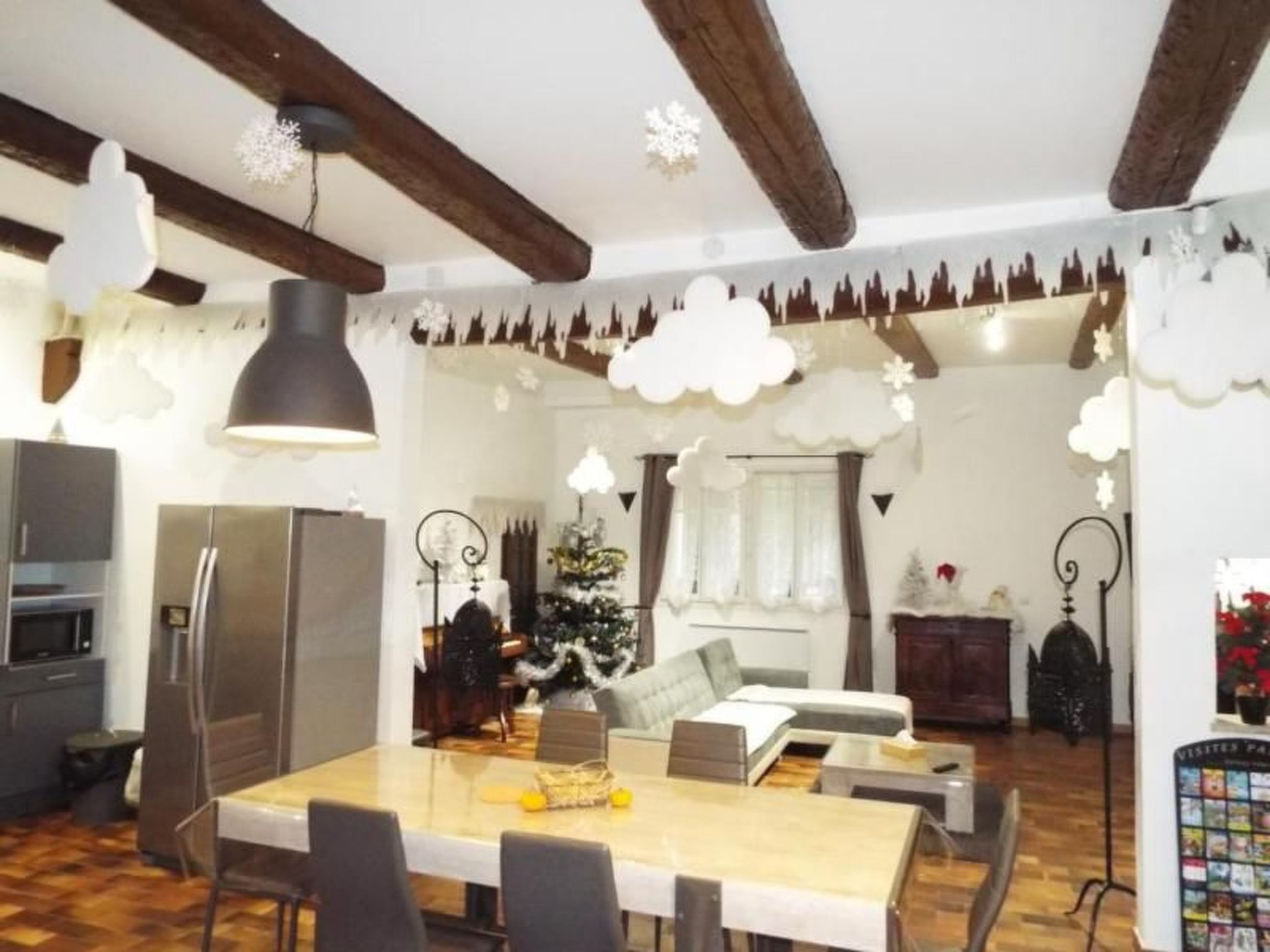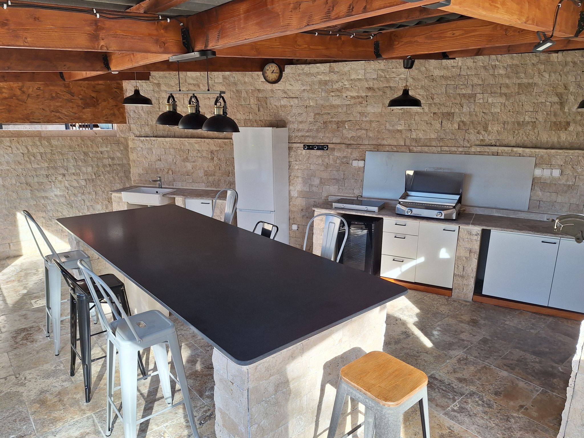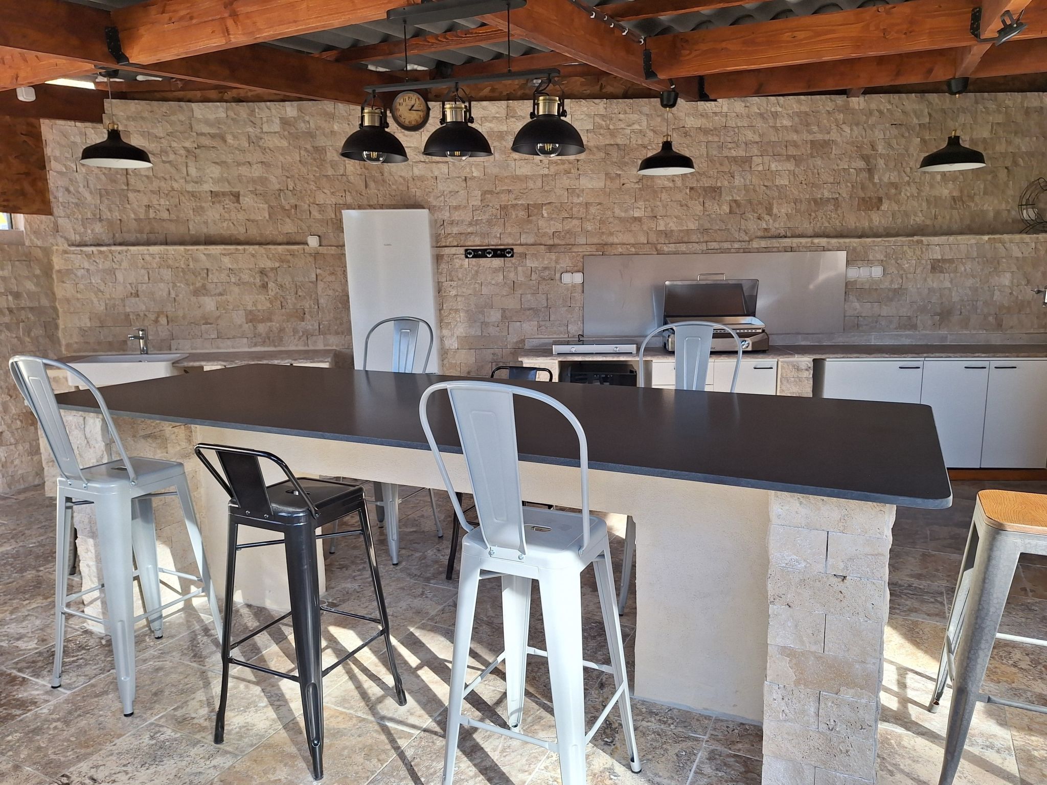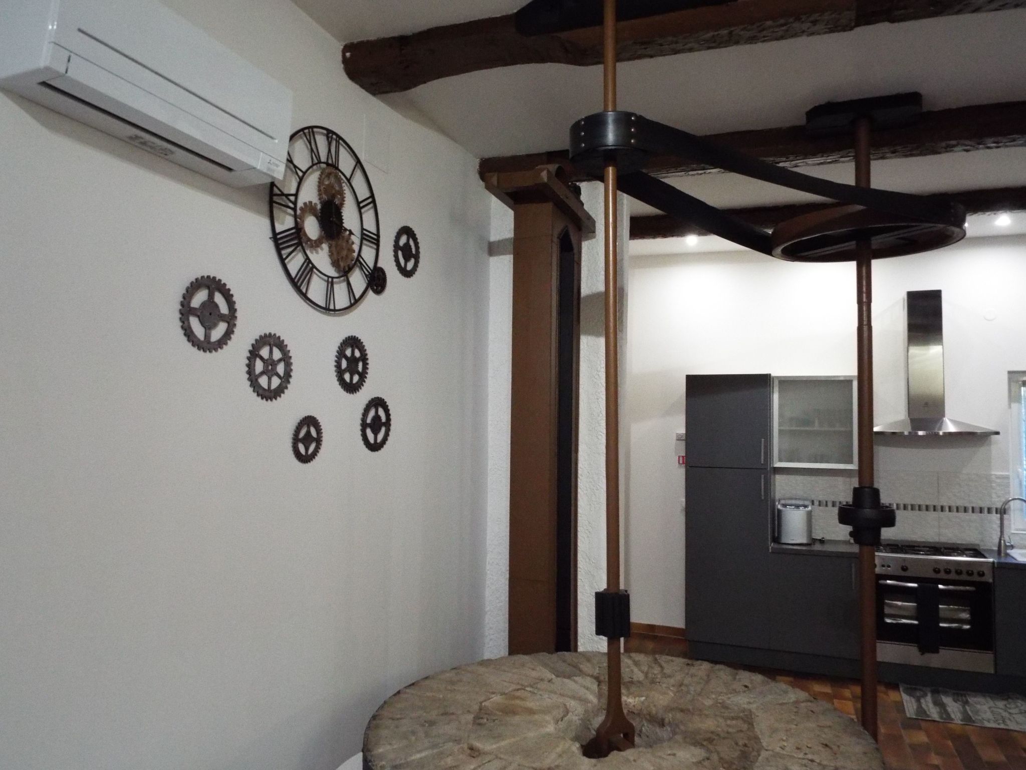 The dining room is in front of the Moulin with its open kitchen, a large dining table and a library.