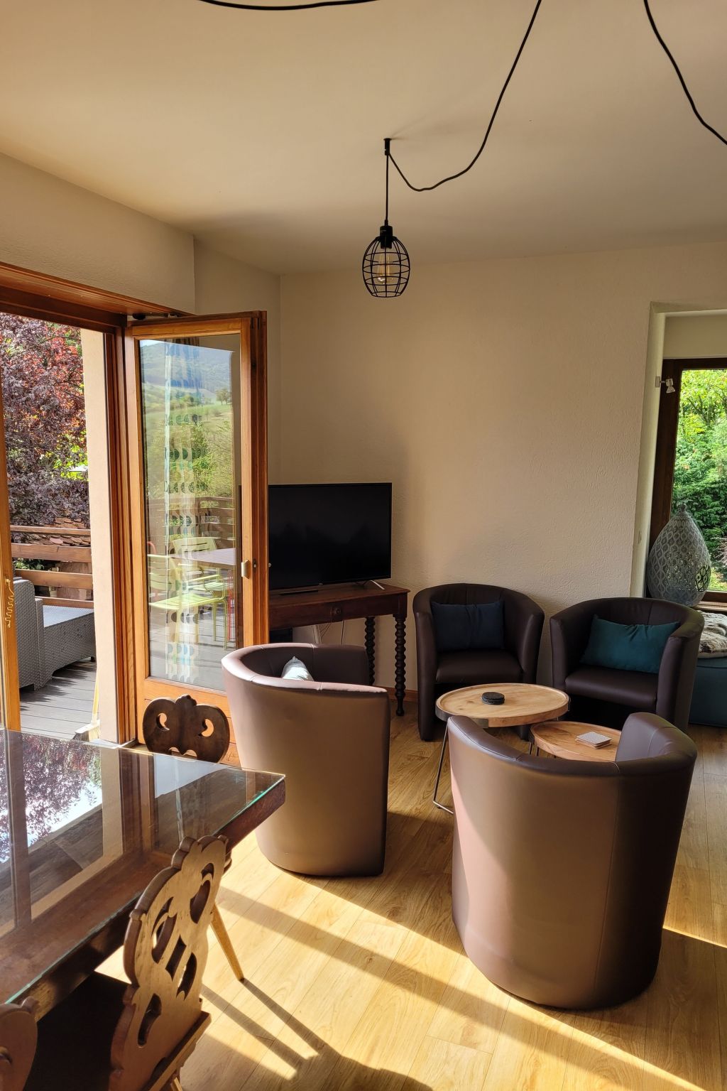 In a tastefully decorated house and outbuilding, we can accommodate up to 8 people (4 in the house). Not forgetting the sauna for your relaxation. The terrace and large garden will let you enjoy the peace and quiet of the village and the view over the valley. In the house: On the 1st floor, there are 2 bedrooms, 1 bathroom with shower, 1 wc. On the ground floor, there is a fitted kitchen, 1 wc and the living room with its panoramic view overlooking the 25 m² terrace. In the basement, you'll find the 6-person sauna with its large shower, as well as a laundry room with washing machine. Our family home, built in 1980, holds many memories, and we wanted to keep it in the family so that you could enjoy this relaxing setting.