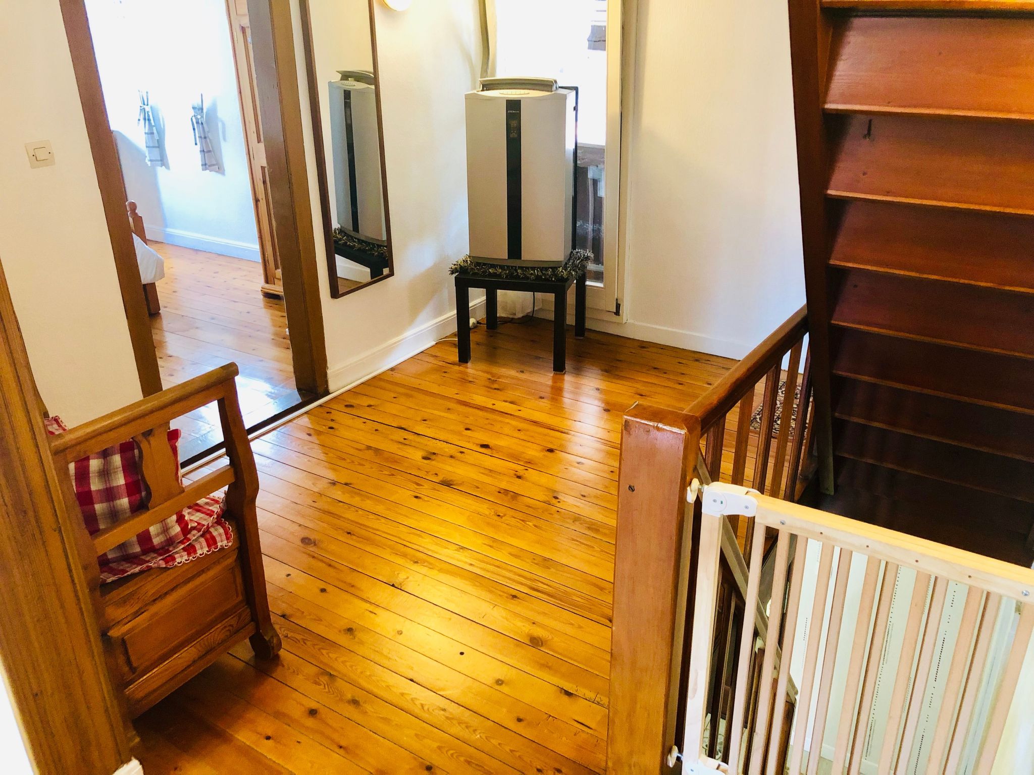The ground floor comprises a living/dining room, kitchen with dining area (microwave, fridge-freezer), bathroom (bath + shower) and separate WC. Upstairs are two bedrooms with beds 1.60 m wide by 2 m long, one bedroom with 2 single beds 90 cm wide by 2 m long, and a shower room (shower + WC). Central heating included, air-conditioning upstairs in summer.