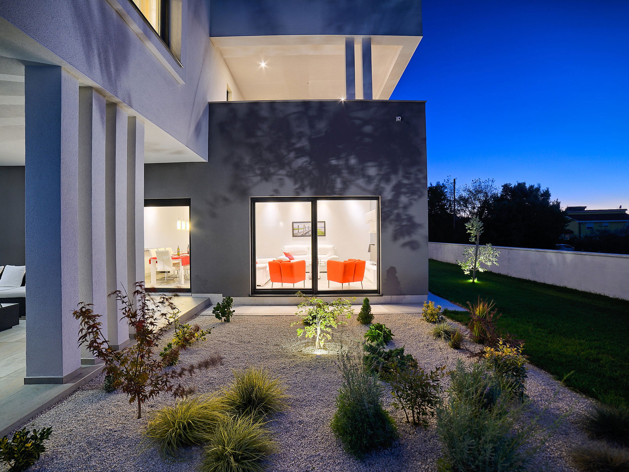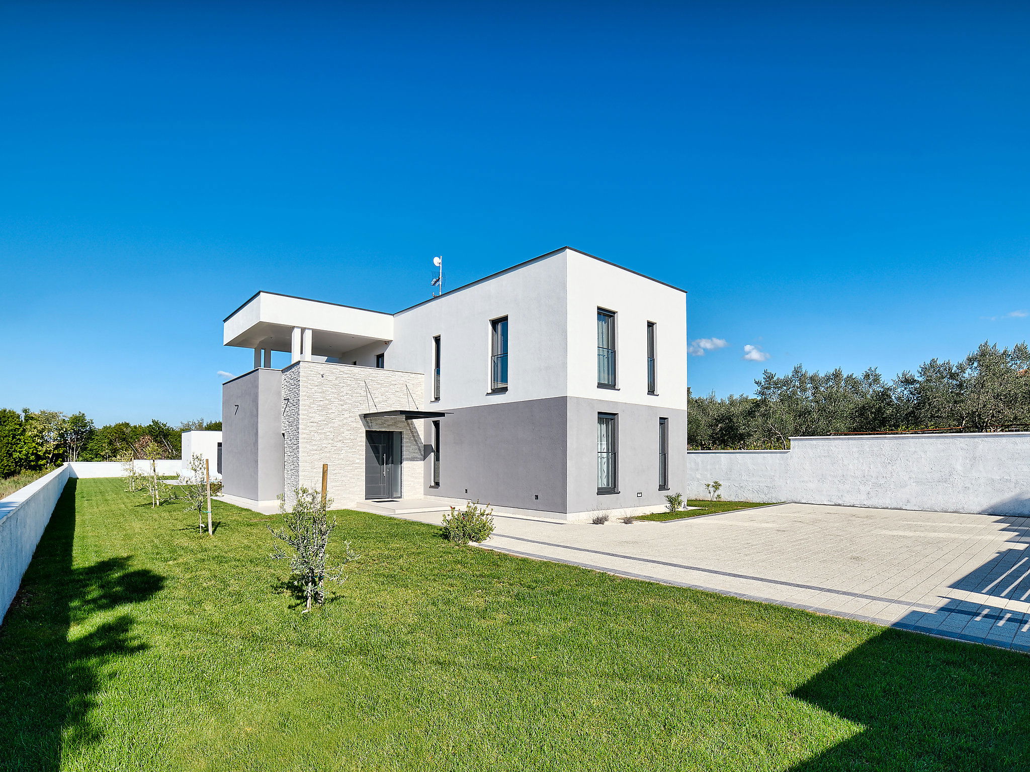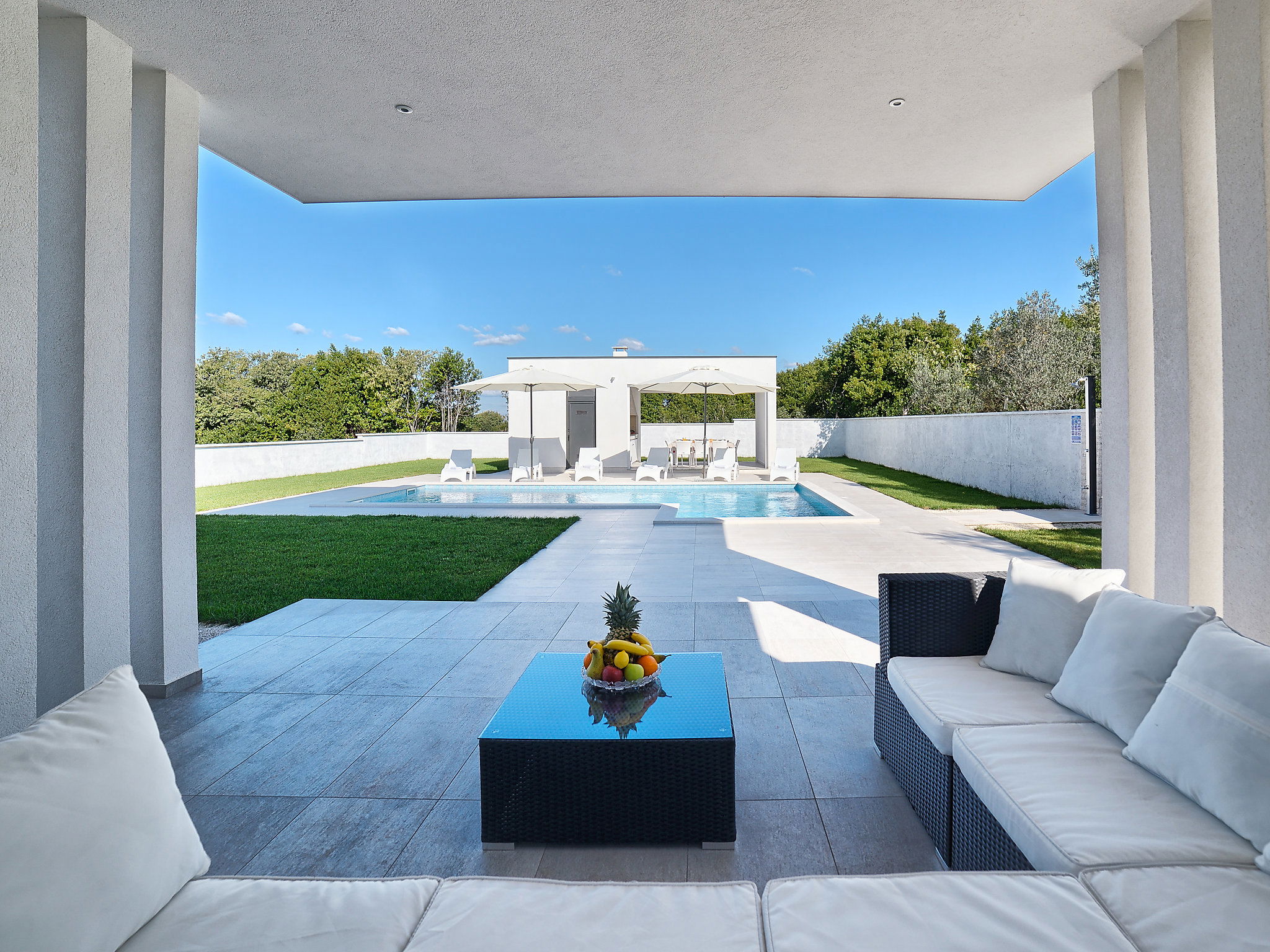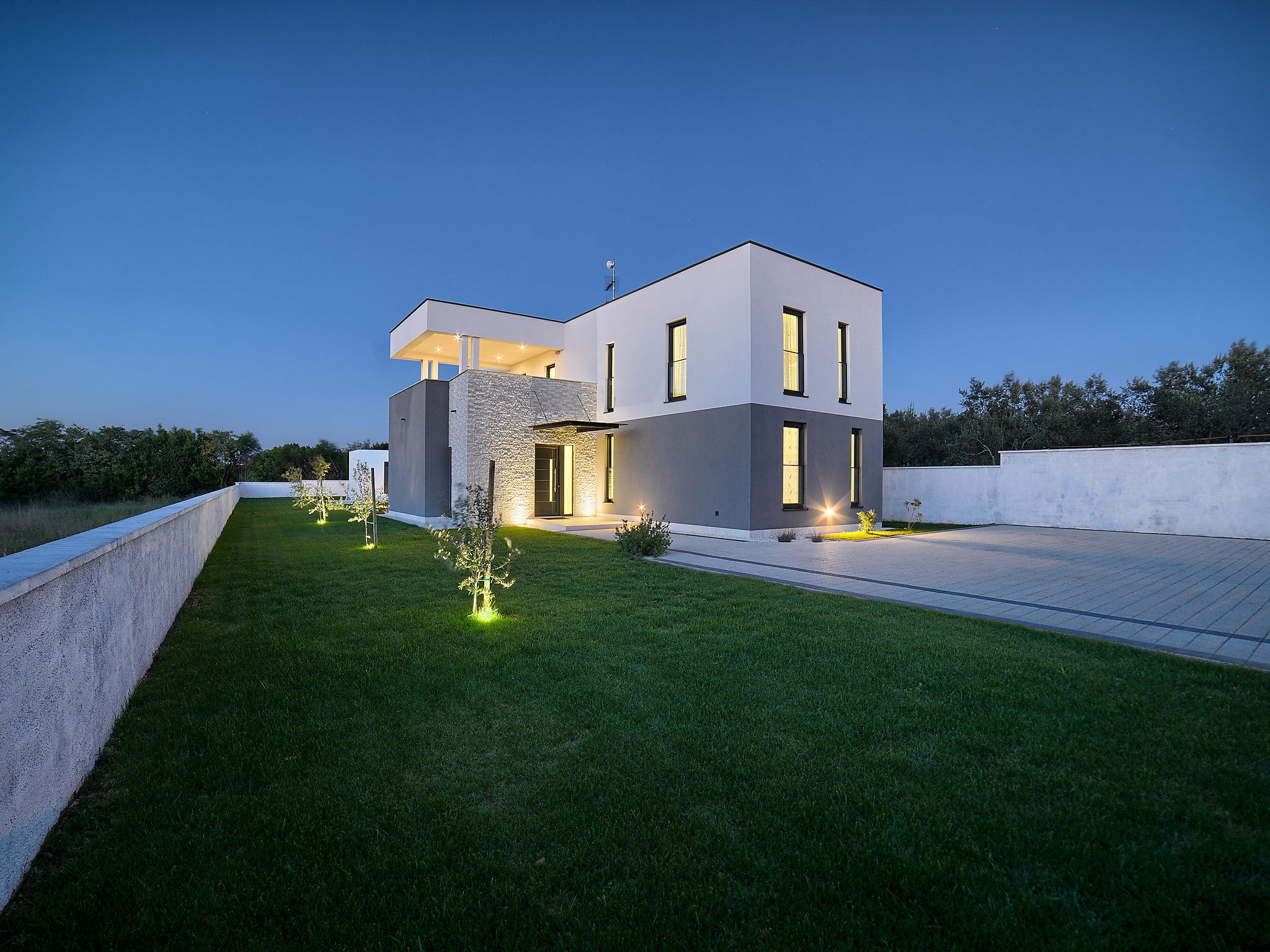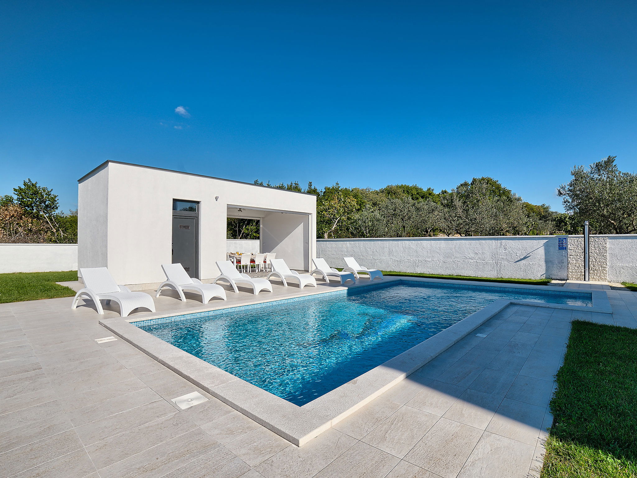 Štinjan 5 km from Pula: Modern, beautiful villa "Lungera", 2 storeys. 3 km from the centre of Fažana, in a sunny position, 1 km from the sea, 1 km from the beach. Private: property 1'250 m2 (fenced), garden with lawn and wildlife garden, swimming pool angular, heated (43 m2, depth 135 cm, seasonal availability: 09.Mar. - 21.Nov.) with internal staircase and salt-electrolysis pool-cleaning system. Outdoor shower, pool house with fridge and cooking stove, terrace, garden furniture, barbecue. In the house: internet access, washing machine. Parking at the house on the premises. Shop 200 m, restaurant 500 m, bus stop 220 m, pebble beach 1 km, rocky beach 1 km. Golf course (18 hole) 5 km, sailing school 2 km, tennis 1 km, riding stable 3 km, walking paths from the house 500 m, cycle lane 100 m. Please note: airfield 15 km from the property. Swimming pool heated (extra). By groups of young people double deposit is requested on arrival. No pets allowed.