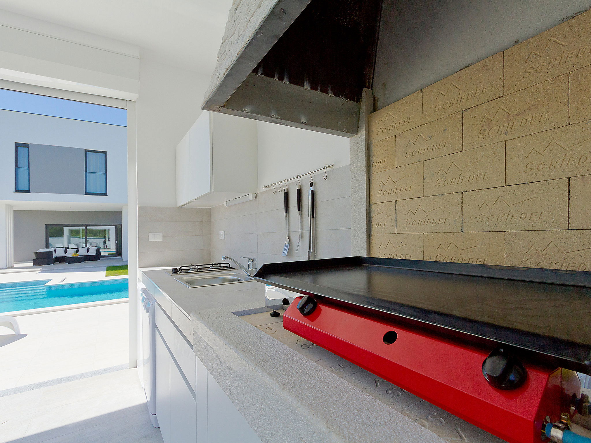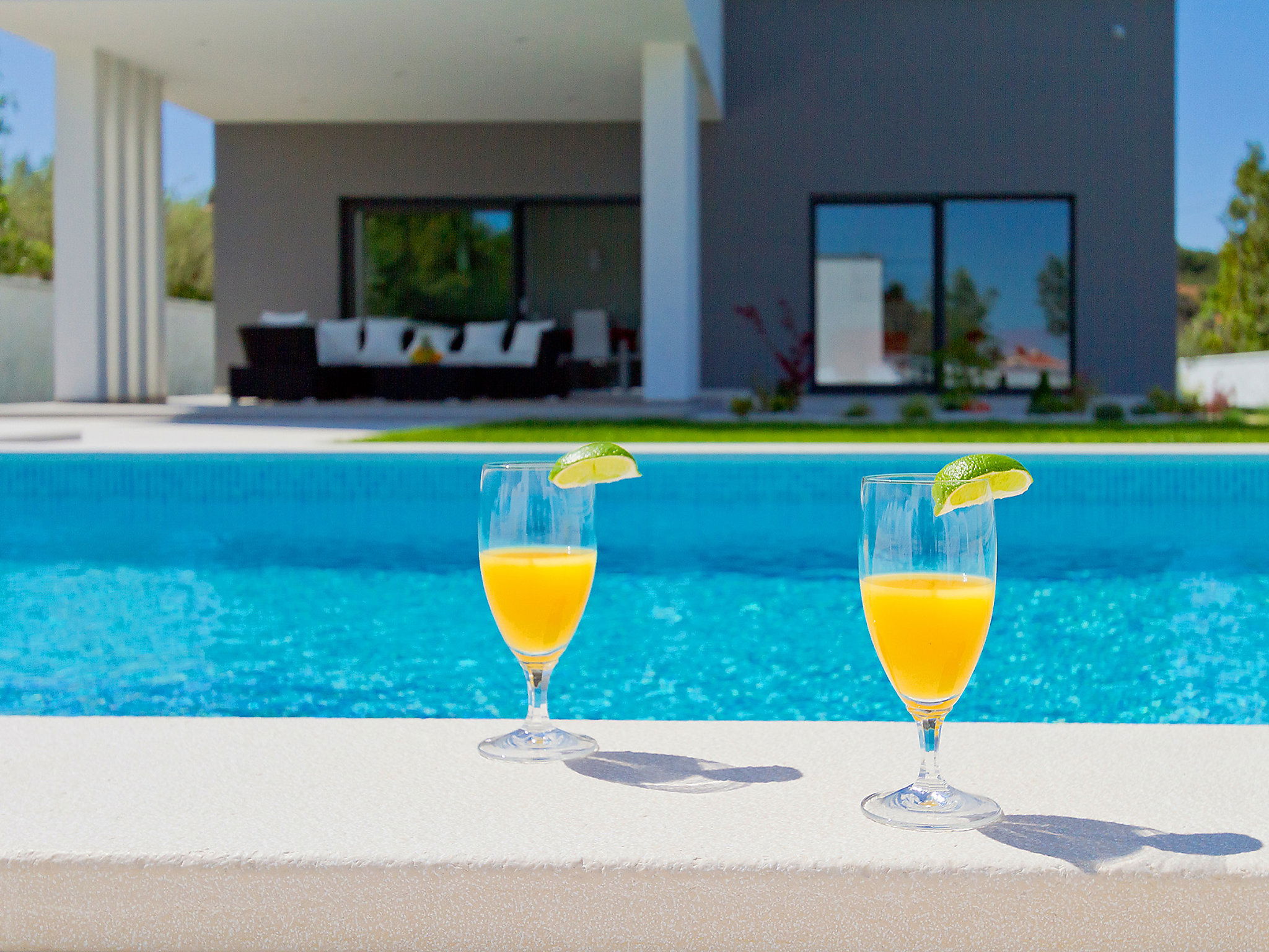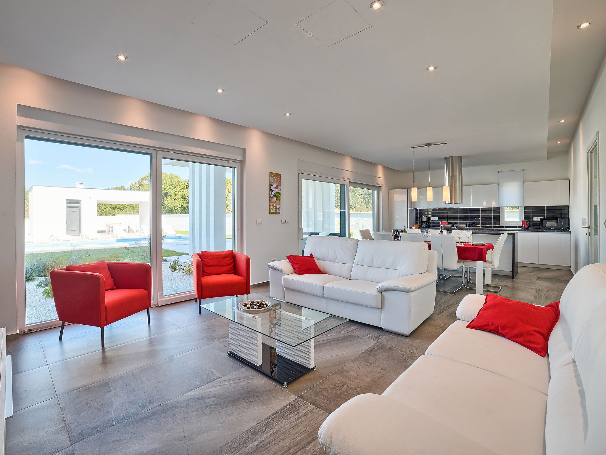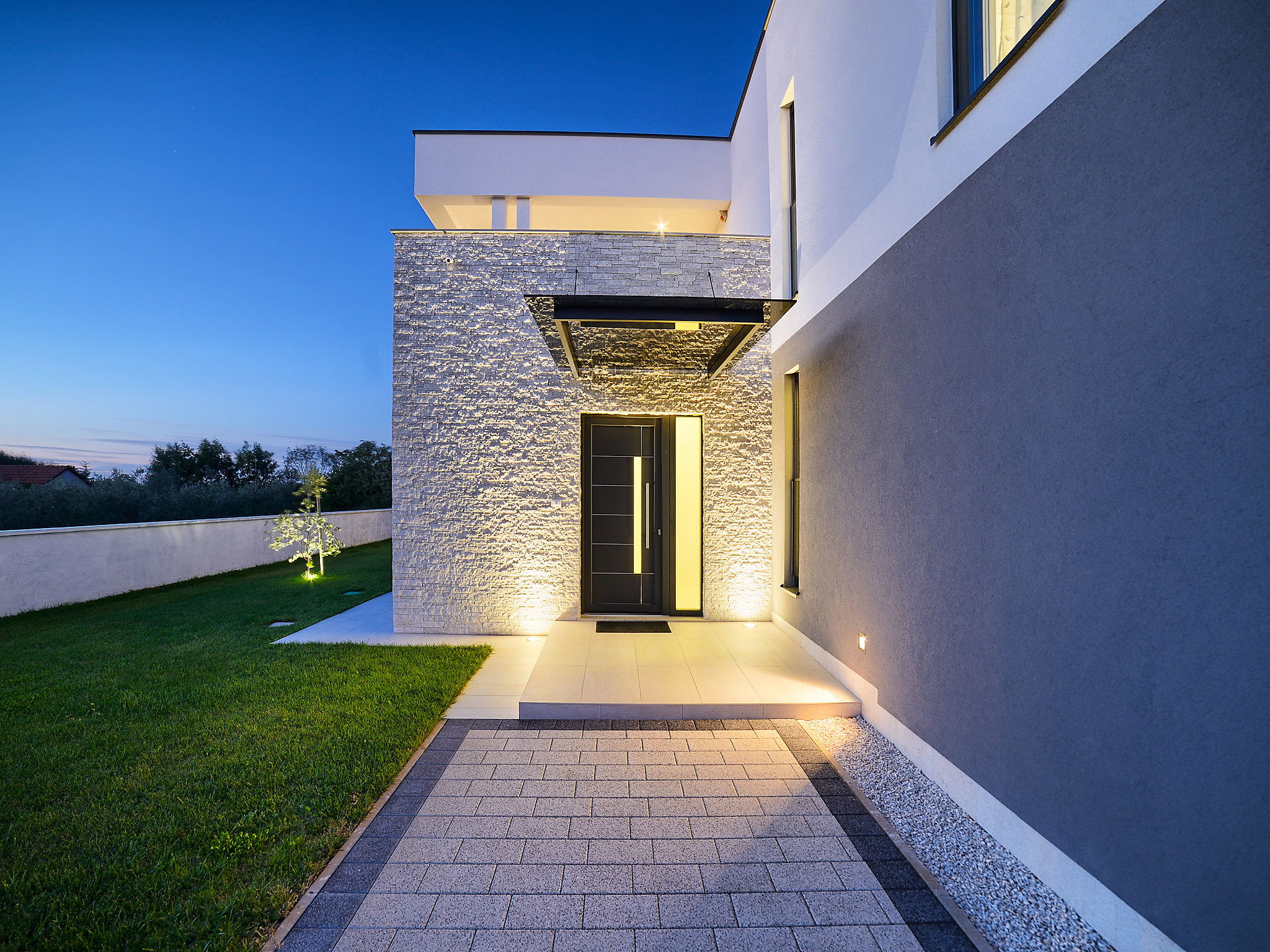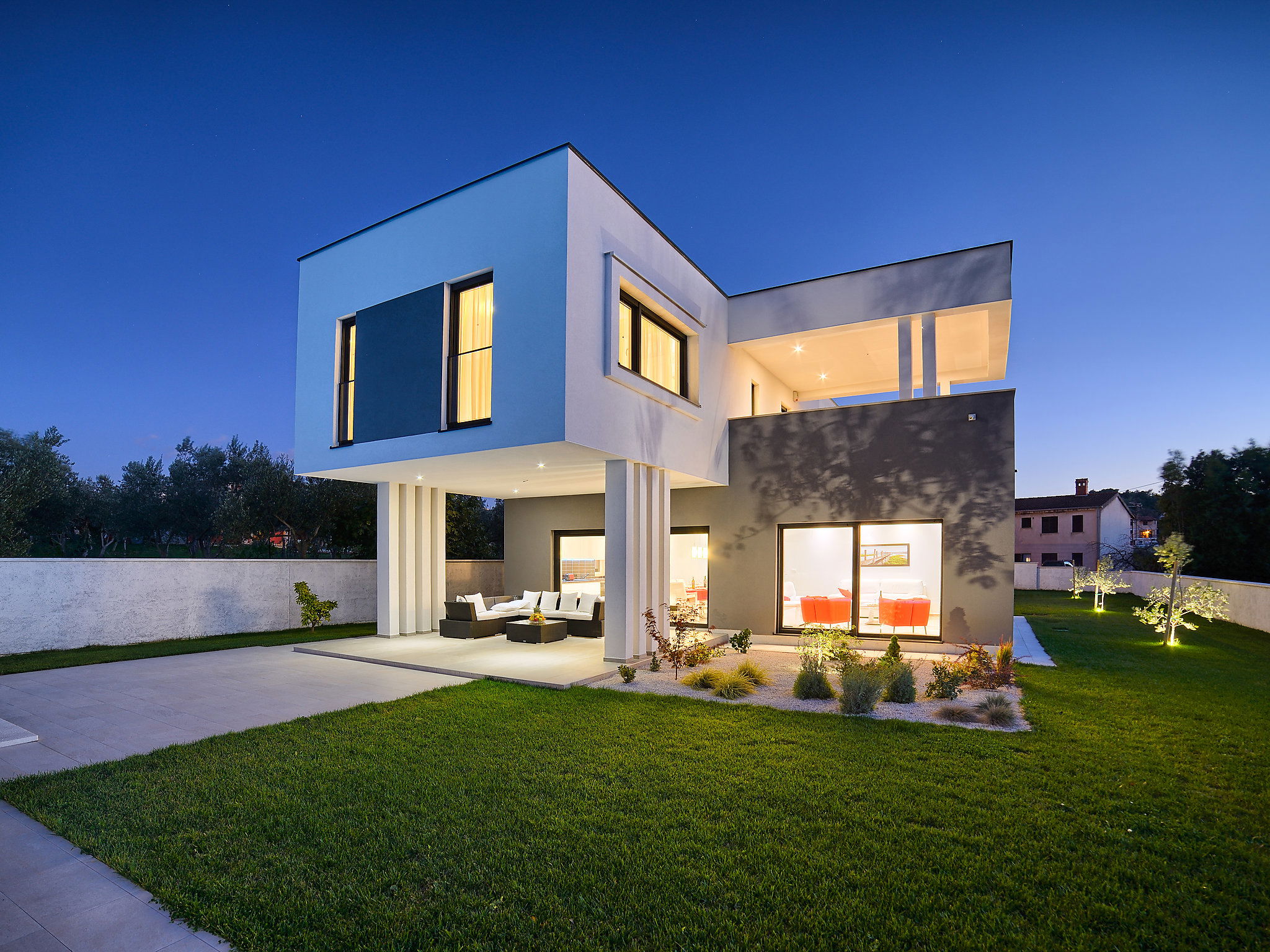 Štinjan 5 km from Pula: Modern, beautiful villa "Lungera", 2 storeys. 3 km from the centre of Fažana, in a sunny position, 1 km from the sea, 1 km from the beach. Private: property 1'250 m2 (fenced), garden with lawn and wildlife garden, swimming pool angular, heated (43 m2, depth 135 cm, seasonal availability: 09.Mar. - 21.Nov.) with internal staircase and salt-electrolysis pool-cleaning system. Outdoor shower, pool house with fridge and cooking stove, terrace, garden furniture, barbecue. In the house: internet access, washing machine. Parking at the house on the premises. Shop 200 m, restaurant 500 m, bus stop 220 m, pebble beach 1 km, rocky beach 1 km. Golf course (18 hole) 5 km, sailing school 2 km, tennis 1 km, riding stable 3 km, walking paths from the house 500 m, cycle lane 100 m. Please note: airfield 15 km from the property. Swimming pool heated (extra). By groups of young people double deposit is requested on arrival. No pets allowed.