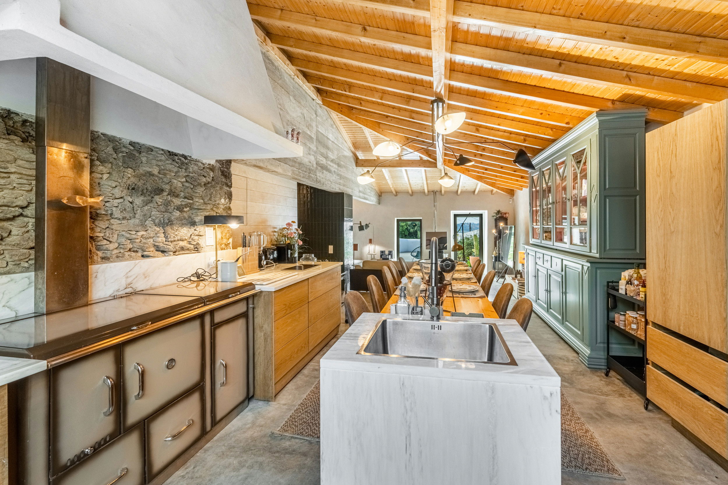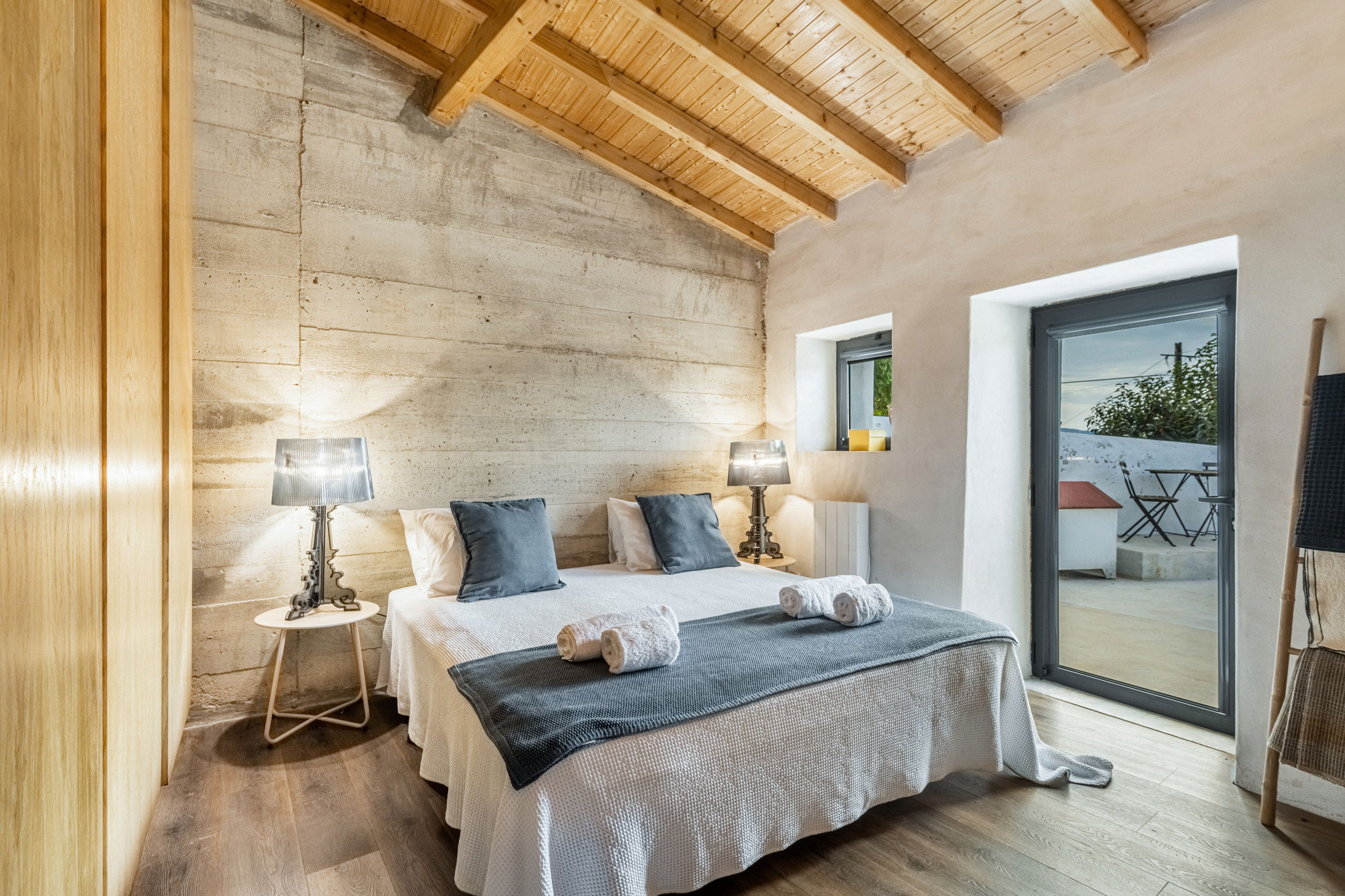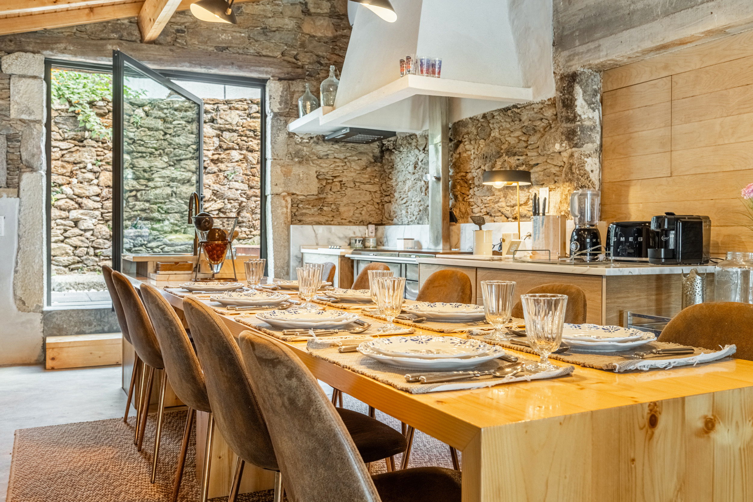Inside, the warmth of natural materials continues. The four double bedrooms, crafted from wood and set upon the villa’s original stone foundations, create a cozy yet refined atmosphere that celebrates the region’s heritage. With three modern shower rooms, a well-appointed SMEG kitchen, and spacious living areas offering ample seating for dining and lounging, every unique detail is designed for comfort and connection. A second lounge framed by exposed stone walls provides the perfect retreat for peaceful moments.