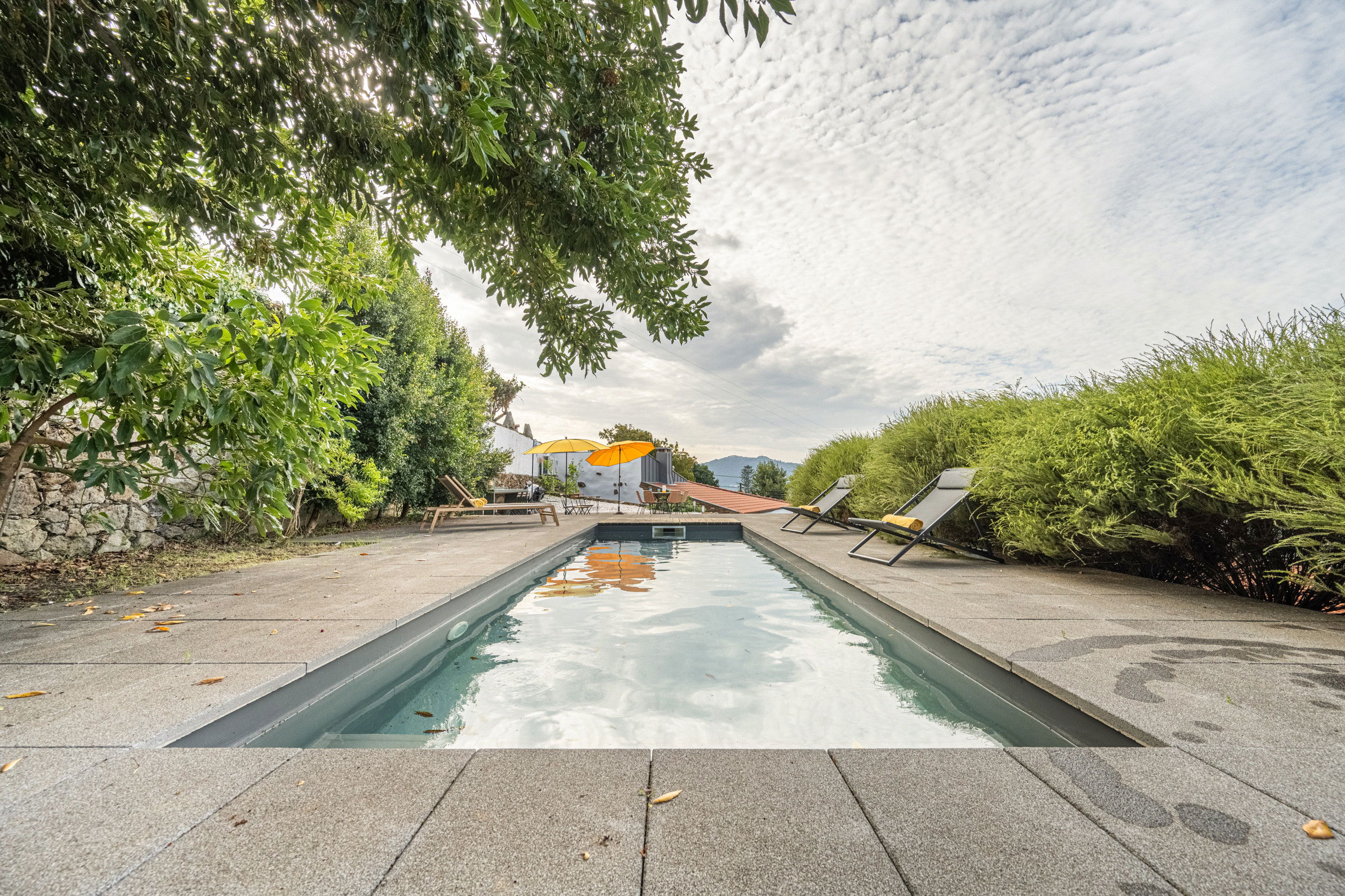 Swimming pool and BBQ area with sunloungers and tables and chairs for alfresco dining.