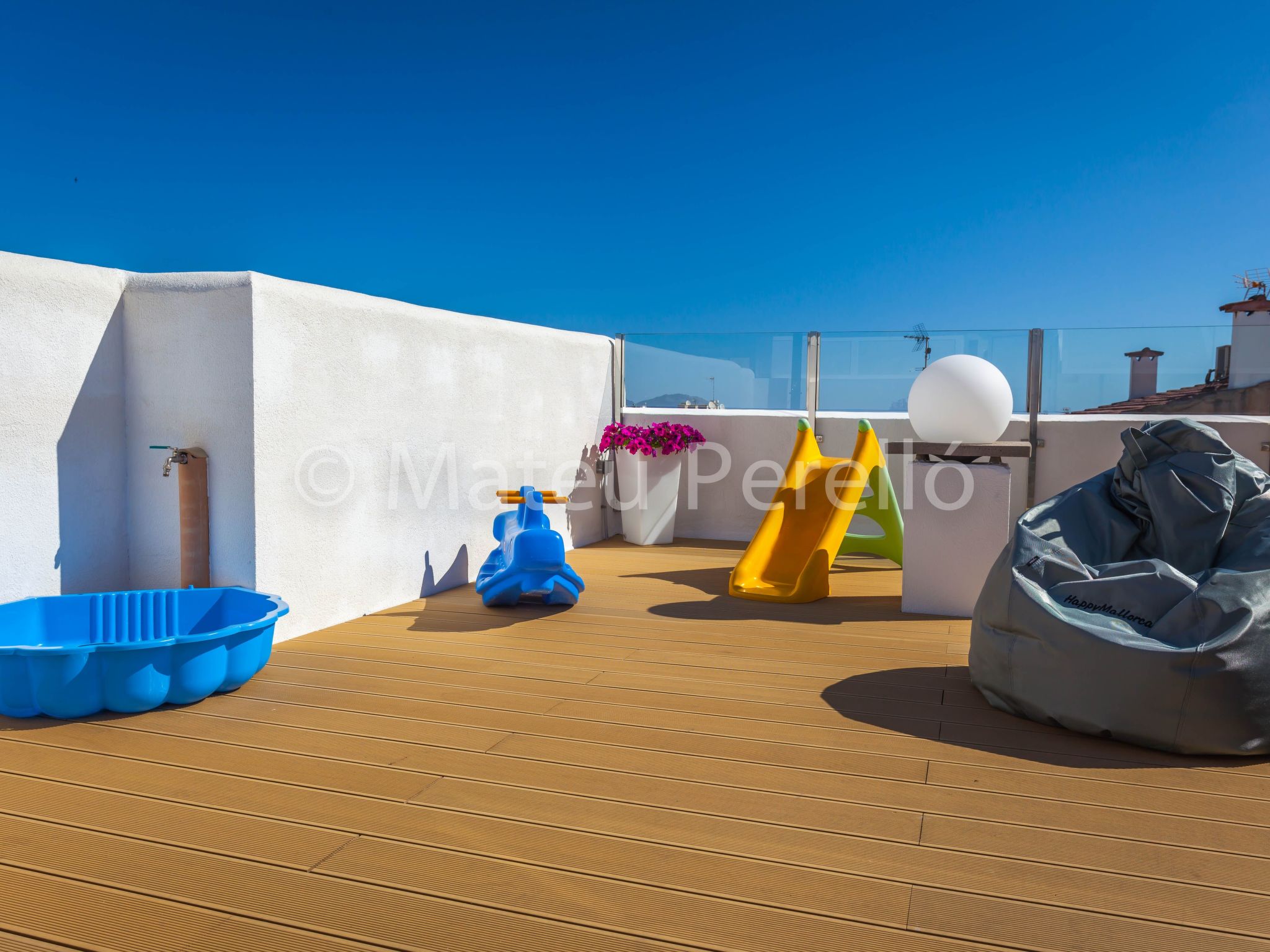 There is a sunny terrace facing the street, and from which peep the sea, is perfect as a solarium or for pleasant summer evenings. With garden furniture, sun loungers and barbecue. In addition, the building has a roof terrace for communal use, prepared as chill-out area. With sun loungers, pergola, shower, table, BBQ and toys for children you can enjoy relaxing hours during the day as also at night.