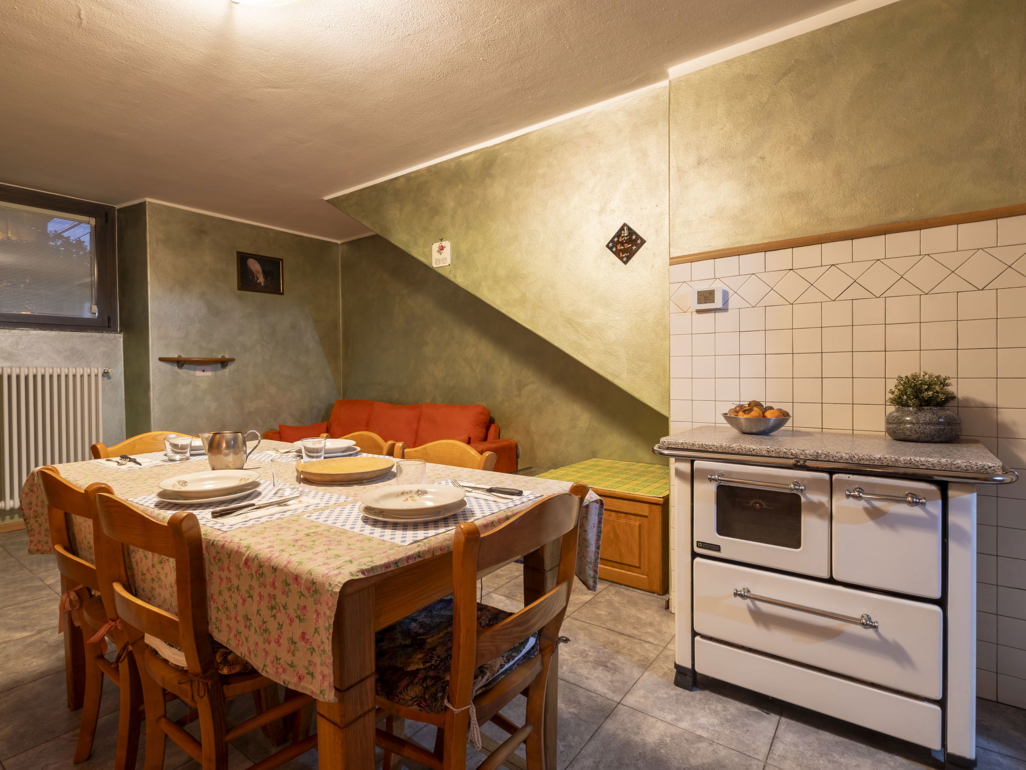 2-room house 60 m2 on 2 levels, on the upper ground floor. Spacious, simple and practical furnishings: living/dining room with 1 double sofabed and Scandinavian wood stove (only for decoration), dining table and TV. Exit to the garden. Kitchenette (oven, 4 induction hot plates, toaster, kettle, microwave, electric coffee machine, Capsules for coffee machine (Nespresso) free). Upper floor: 1 large room with 1 double bed. Exit to the terrace. Shower/bidet/WC. Heating. Terrace. Terrace furniture, barbecue. Panoramic view of the mountains and the valley. Facilities: washing machine, hair dryer. Internet (WiFi, free). Please note: suitable for families. Non-smokers only. Maximum 2 pets/ dogs allowed. Private entrance, fire extinguisher. IT014063C2DPQVSECR