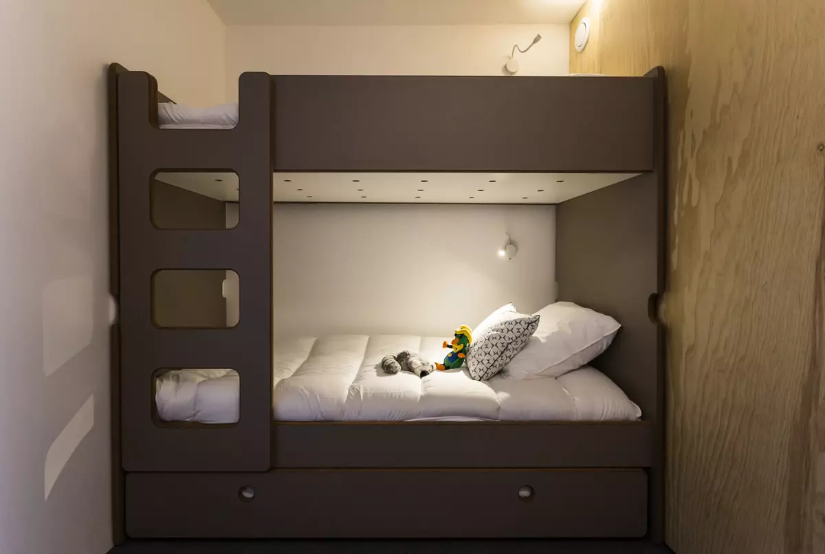 Entrance with an alcove containing 2 bunk beds and 1 pull-out bed (80cm wide) (the upper bunk is not suitable for children under 6 years old)