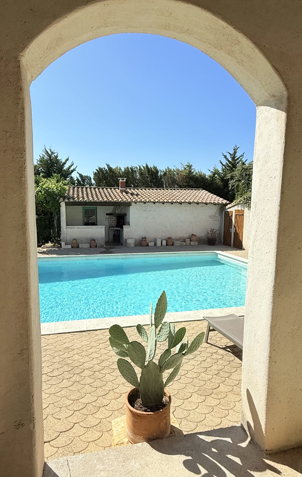 La propriété dispose d’un bel extérieur arboré, d’une terrasse ombragée, idéale pour les repas en plein air, et d’une piscine avec transats pour profiter pleinement des beaux jours. Vous profiterez d'une cuisine d'été avec une plancha pour vos repas et barbecue.