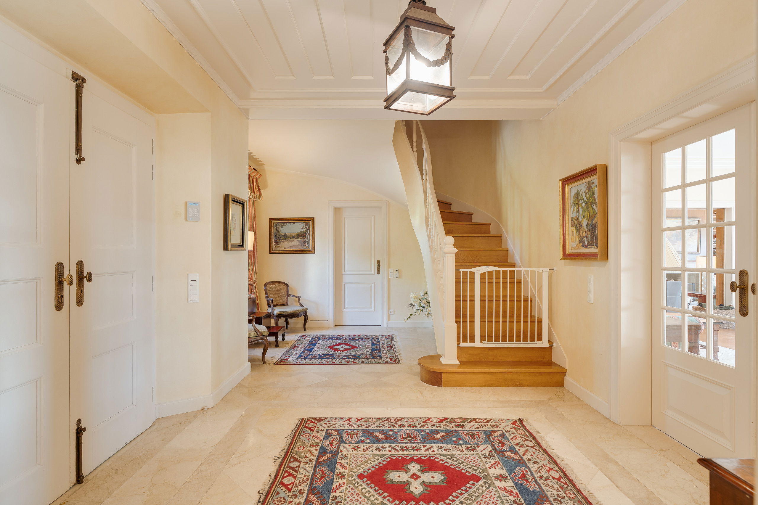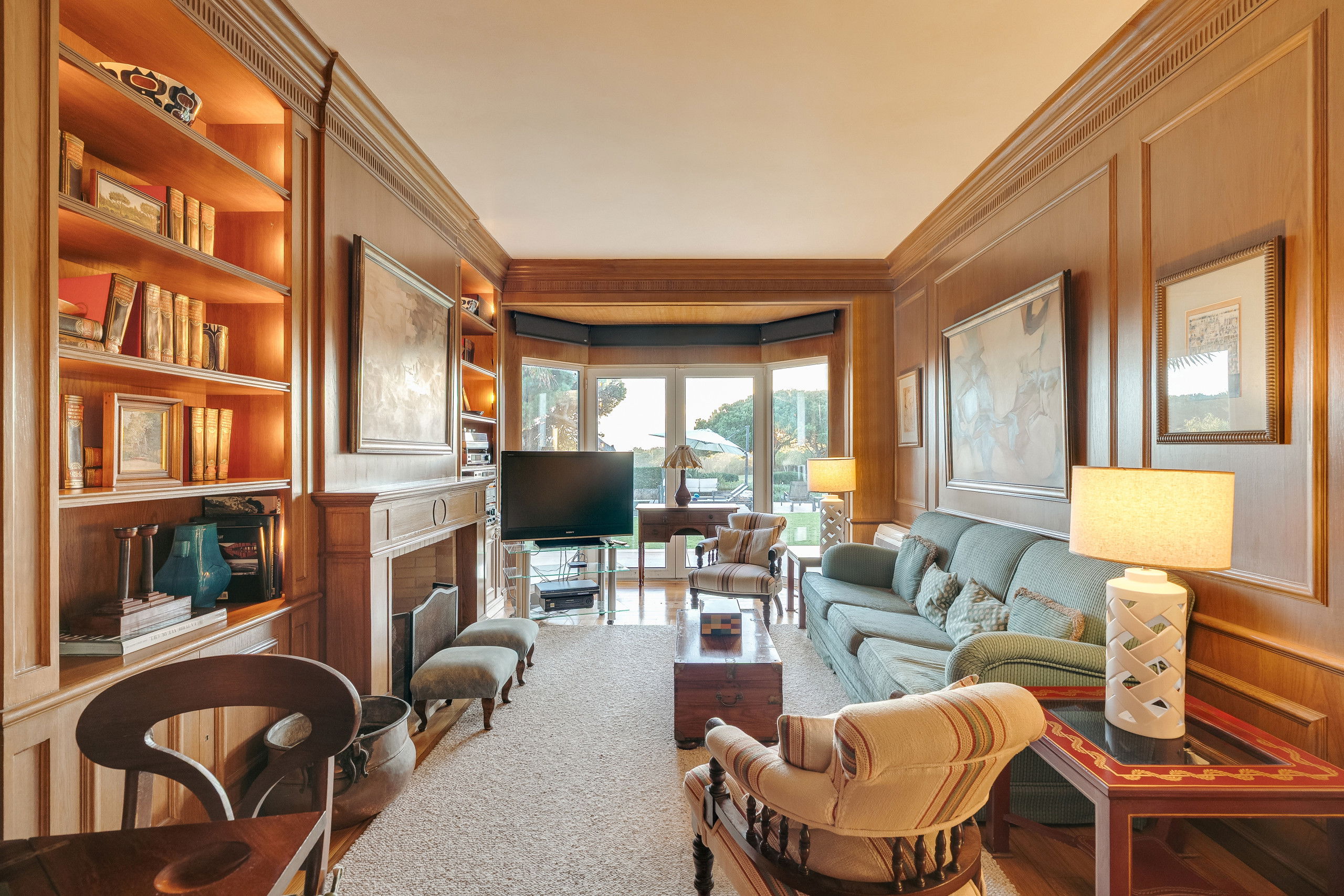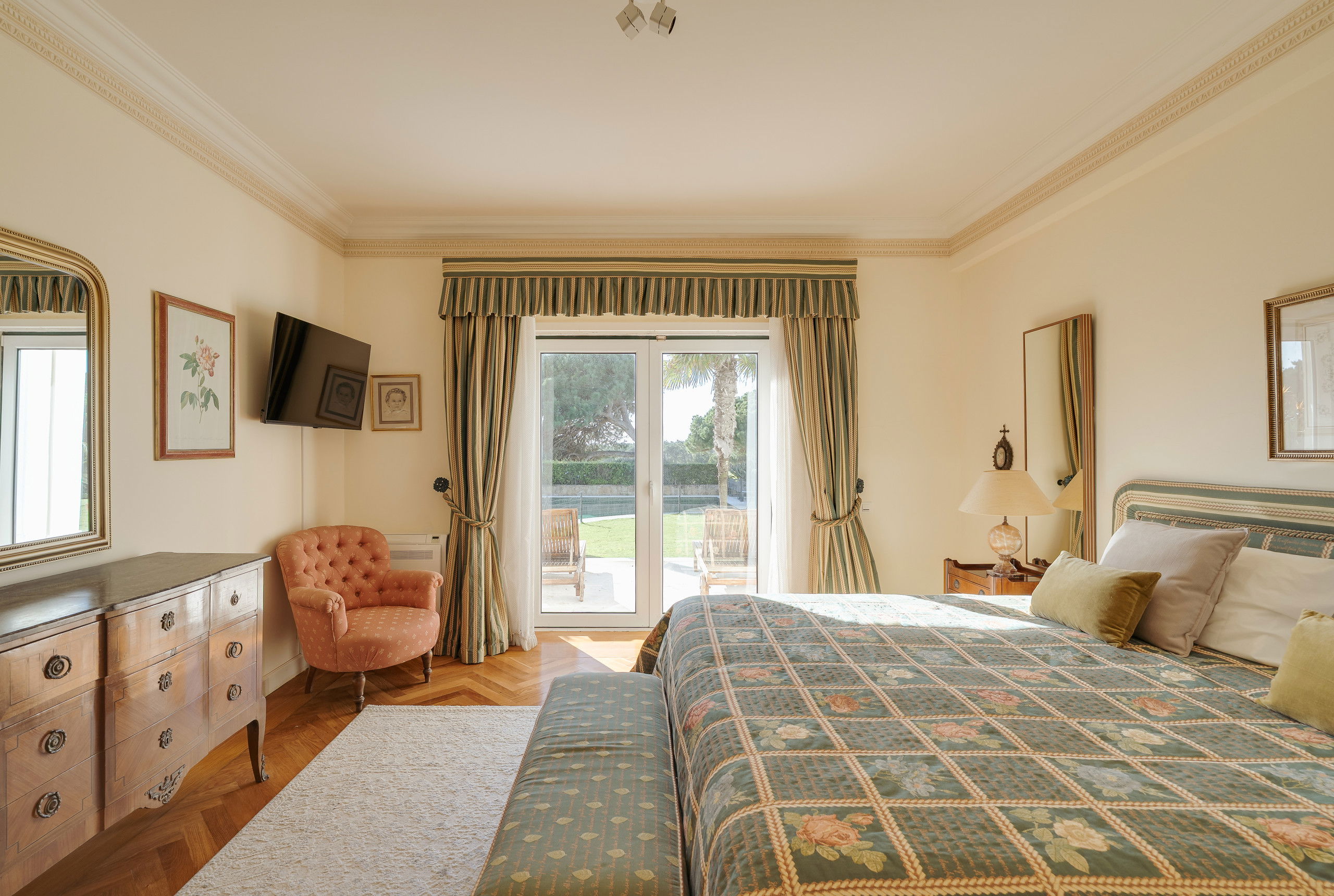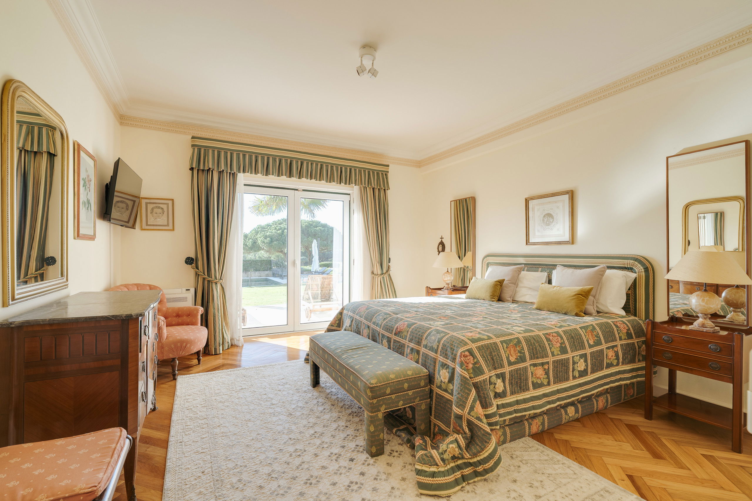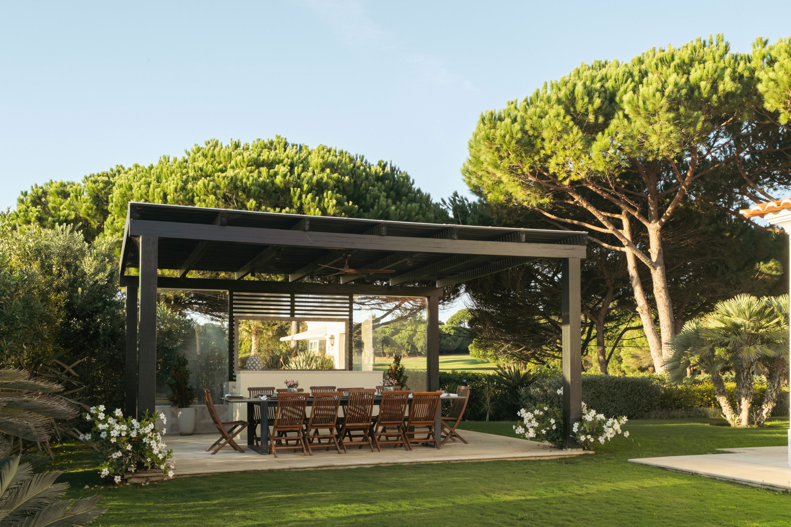 Outside, the villa opens into expansive grounds designed for relaxed outdoor living.