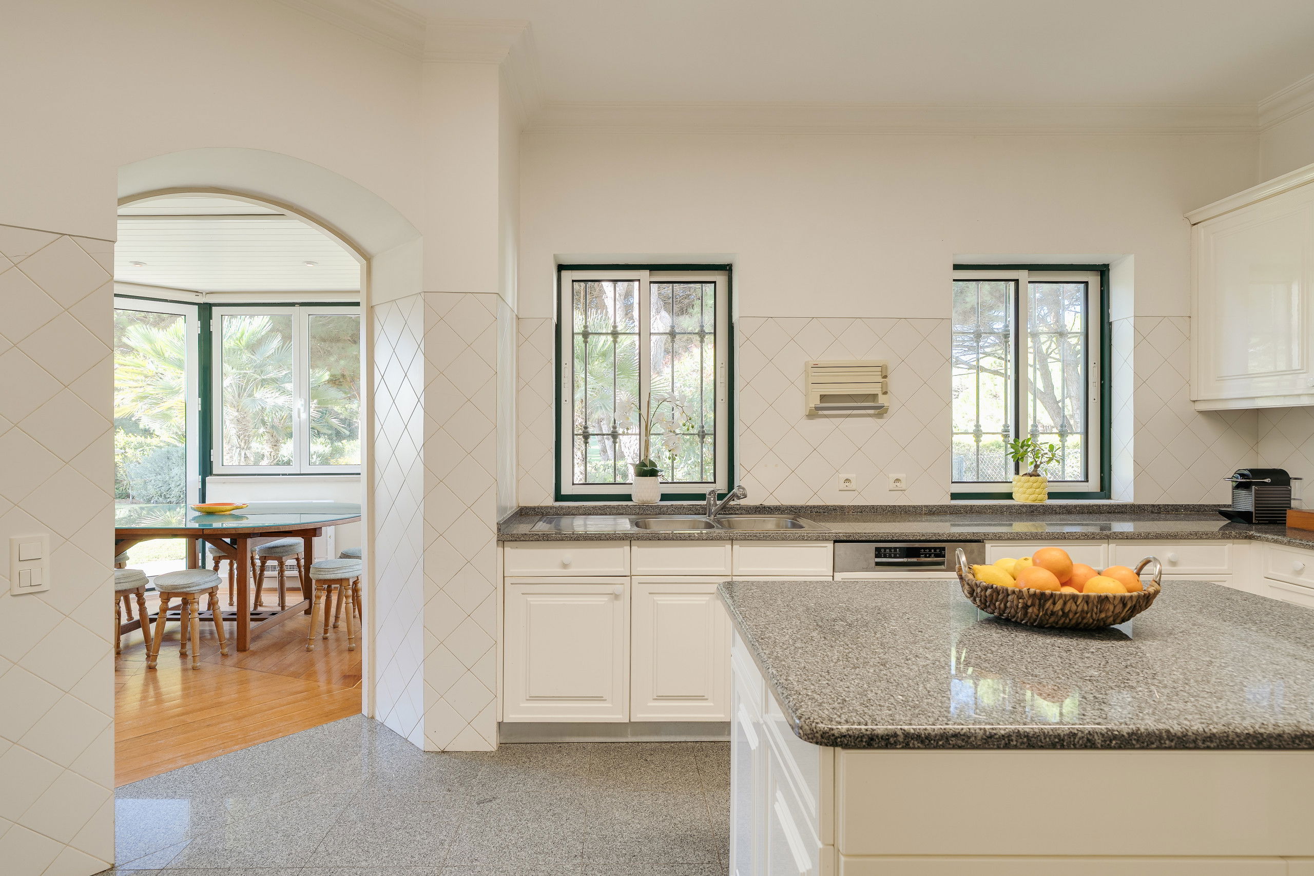 The swimming pool sits at the heart of the garden, equipped with sun loungers and a protective fence for peace of mind with younger guests. An outdoor lounge area with comfortable furnishings invites slow afternoons and early evening gatherings, while the outdoor kitchen and dining table create the perfect setting for long meals enjoyed under the Cascais sky. With generous garden areas surrounding the home, there is a sense of openness and freedom that encourages both play and relaxation.