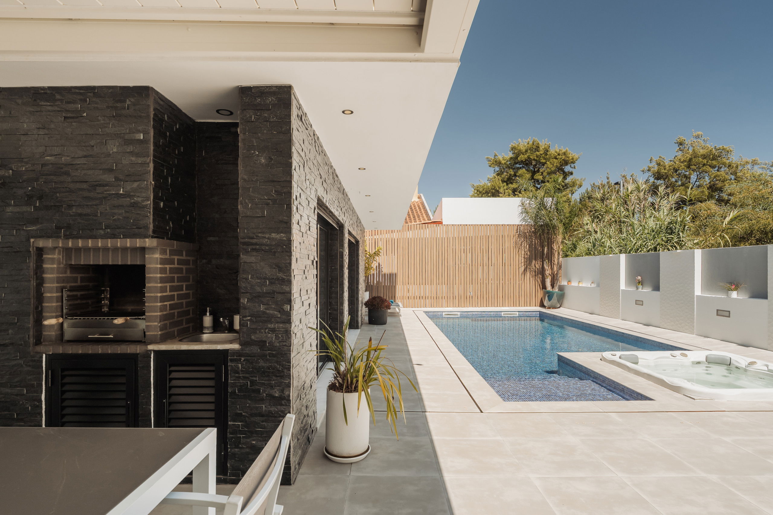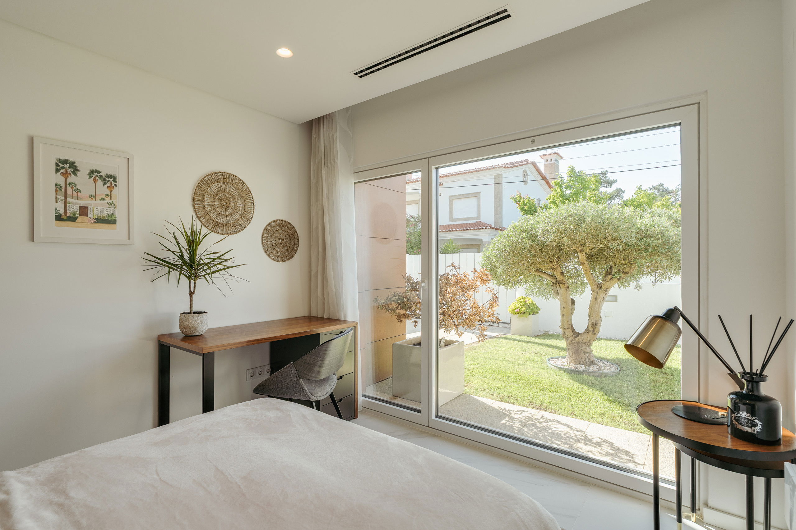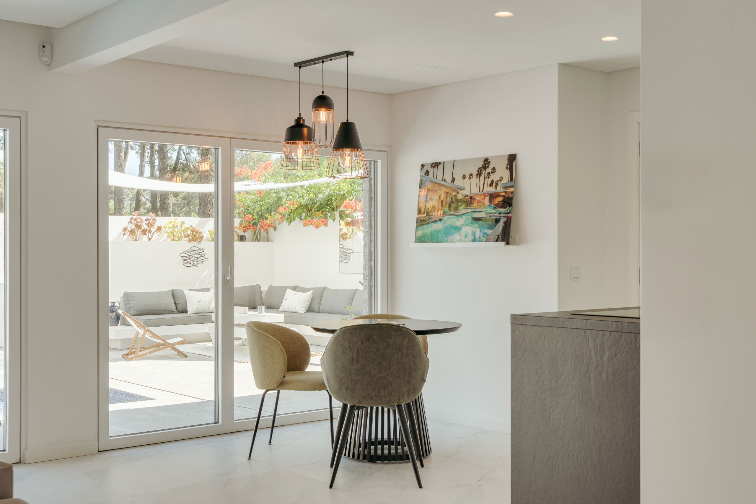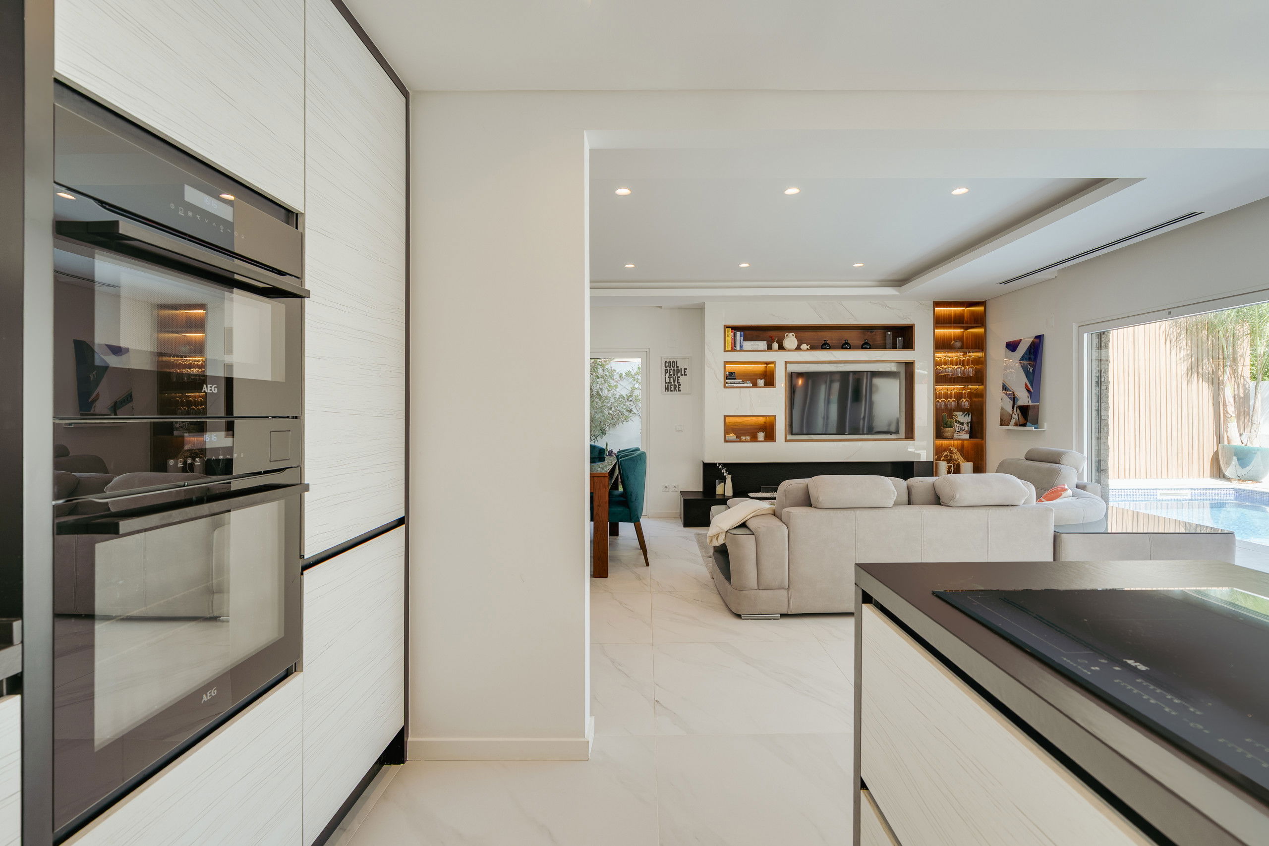 Inside, the villa is designed to provide space, functionality, and a welcoming atmosphere. The ground floor features a bright and open layout, with a spacious living and dining area seamlessly connected to a modern American-style kitchen. Large glass doors allow natural light to flow in and provide easy access to the garden and pool area. A home office, which can be converted into a bedroom with a retractable bed, offers additional flexibility for guests. This level also includes a laundry room, a full bathroom, and interior access to the garage. Upstairs, the floor accommodates three double bedrooms, including a master suite with a hydromassage bathtub. The other two bedrooms share a full bathroom with a walk-in shower, and one of the rooms has access to a large decked balcony with sun loungers, offering a peaceful space to unwind.