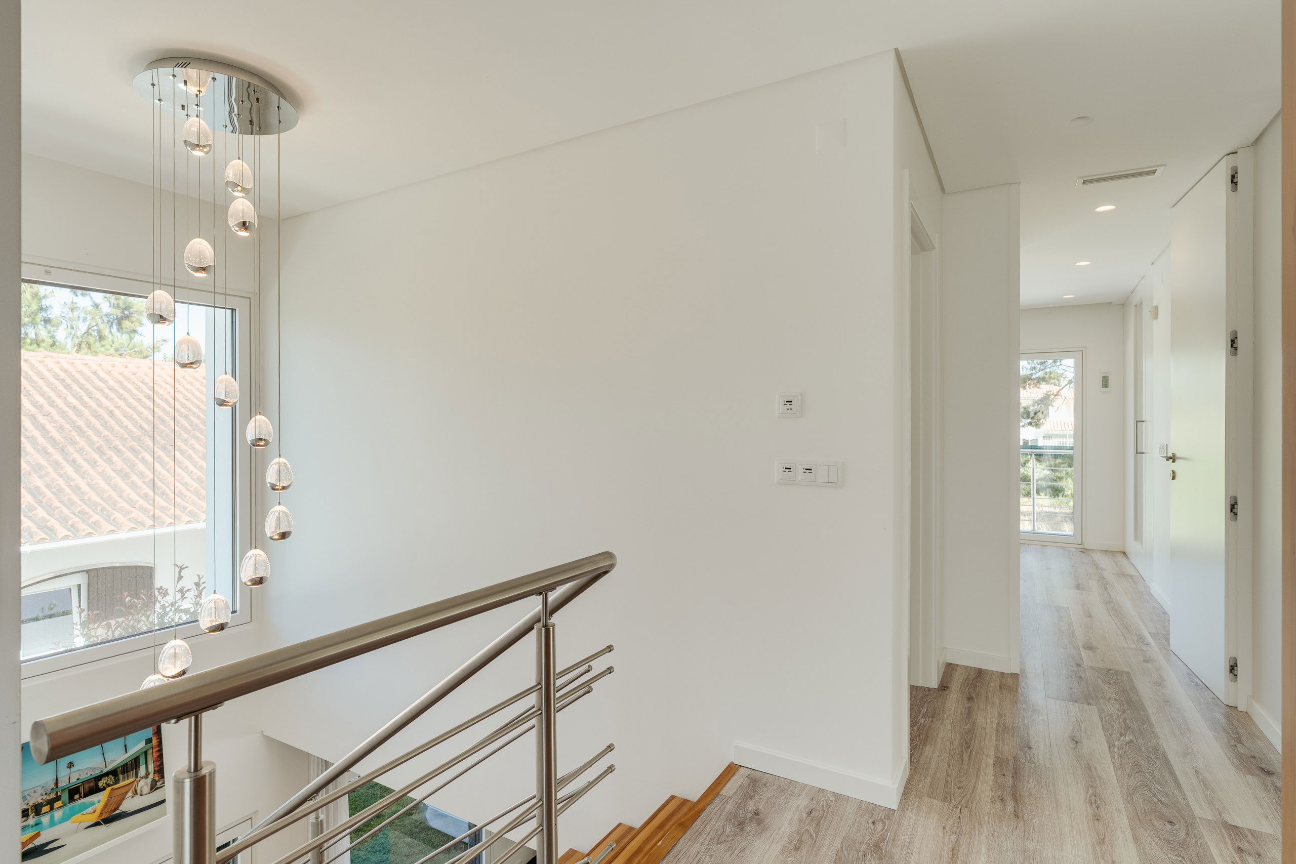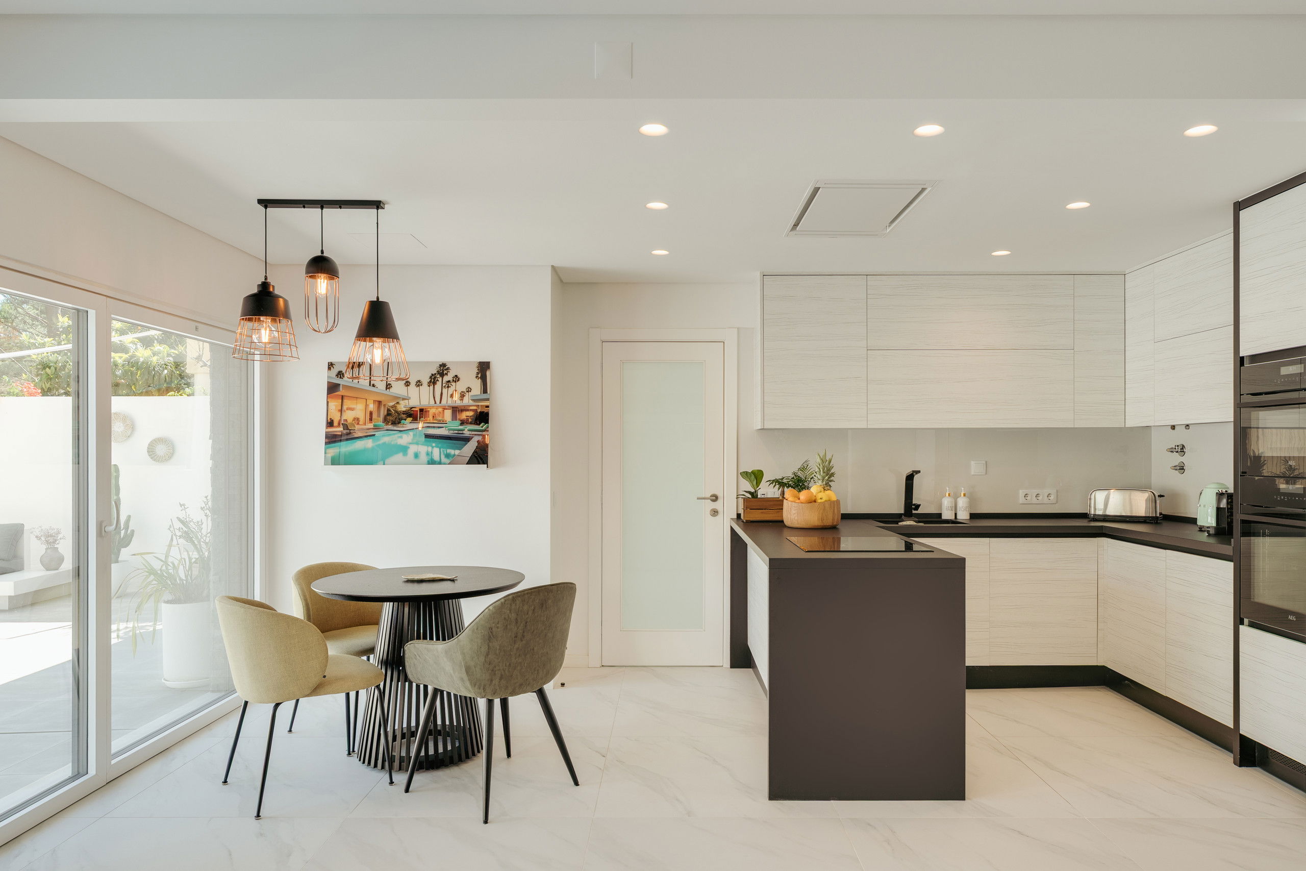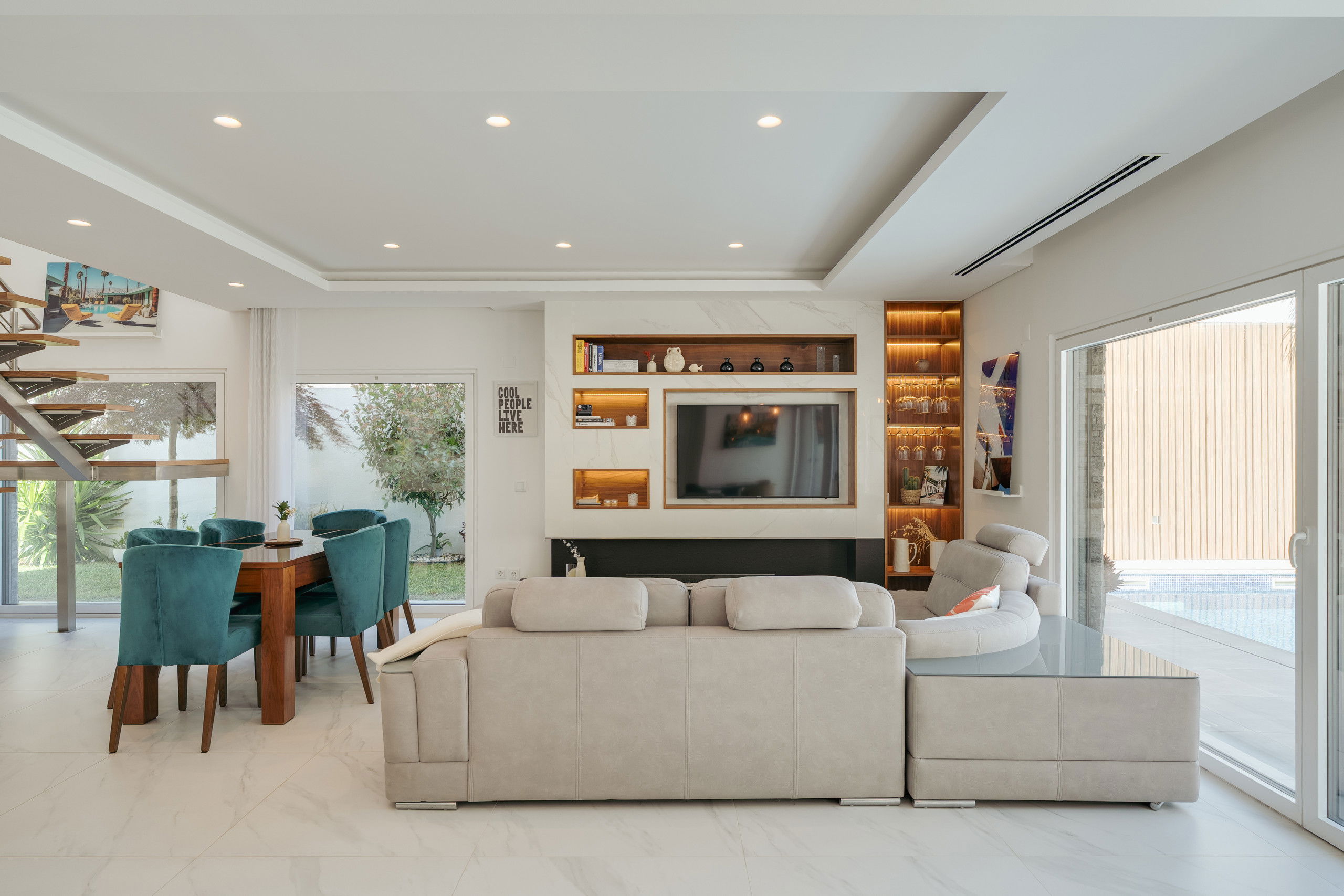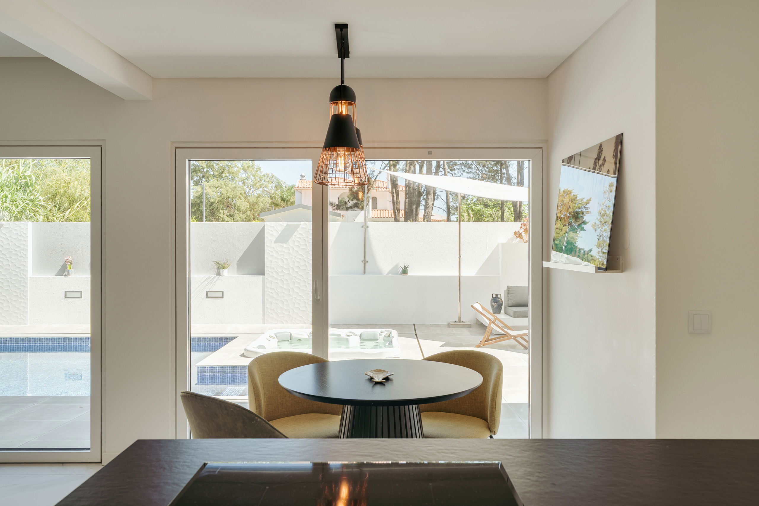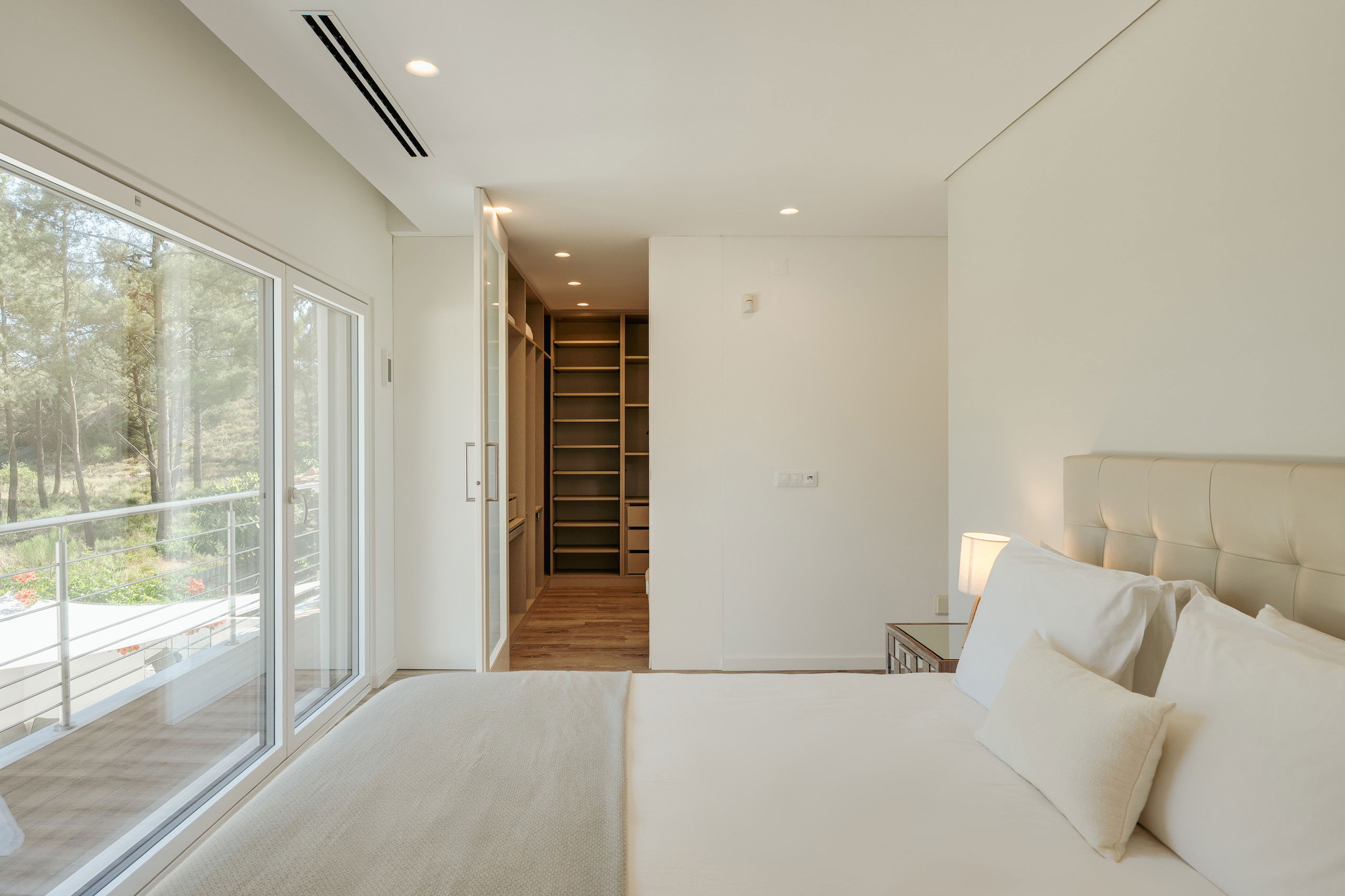 Inside, the villa is designed to provide space, functionality, and a welcoming atmosphere. The ground floor features a bright and open layout, with a spacious living and dining area seamlessly connected to a modern American-style kitchen. Large glass doors allow natural light to flow in and provide easy access to the garden and pool area. A home office, which can be converted into a bedroom with a retractable bed, offers additional flexibility for guests. This level also includes a laundry room, a full bathroom, and interior access to the garage. Upstairs, the floor accommodates three double bedrooms, including a master suite with a hydromassage bathtub. The other two bedrooms share a full bathroom with a walk-in shower, and one of the rooms has access to a large decked balcony with sun loungers, offering a peaceful space to unwind.