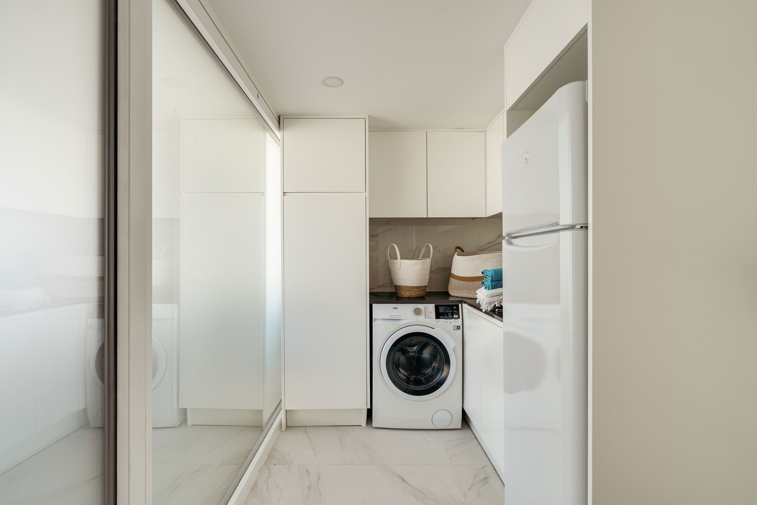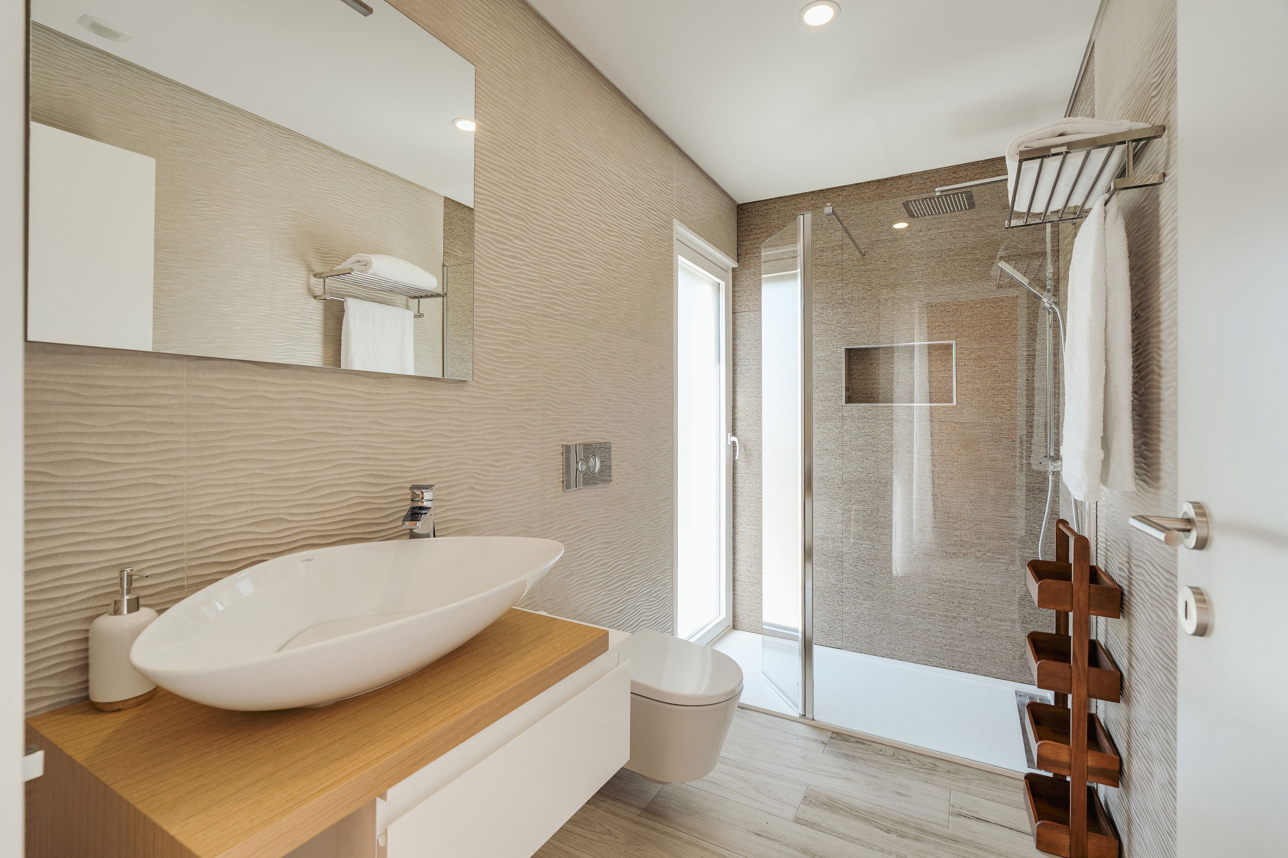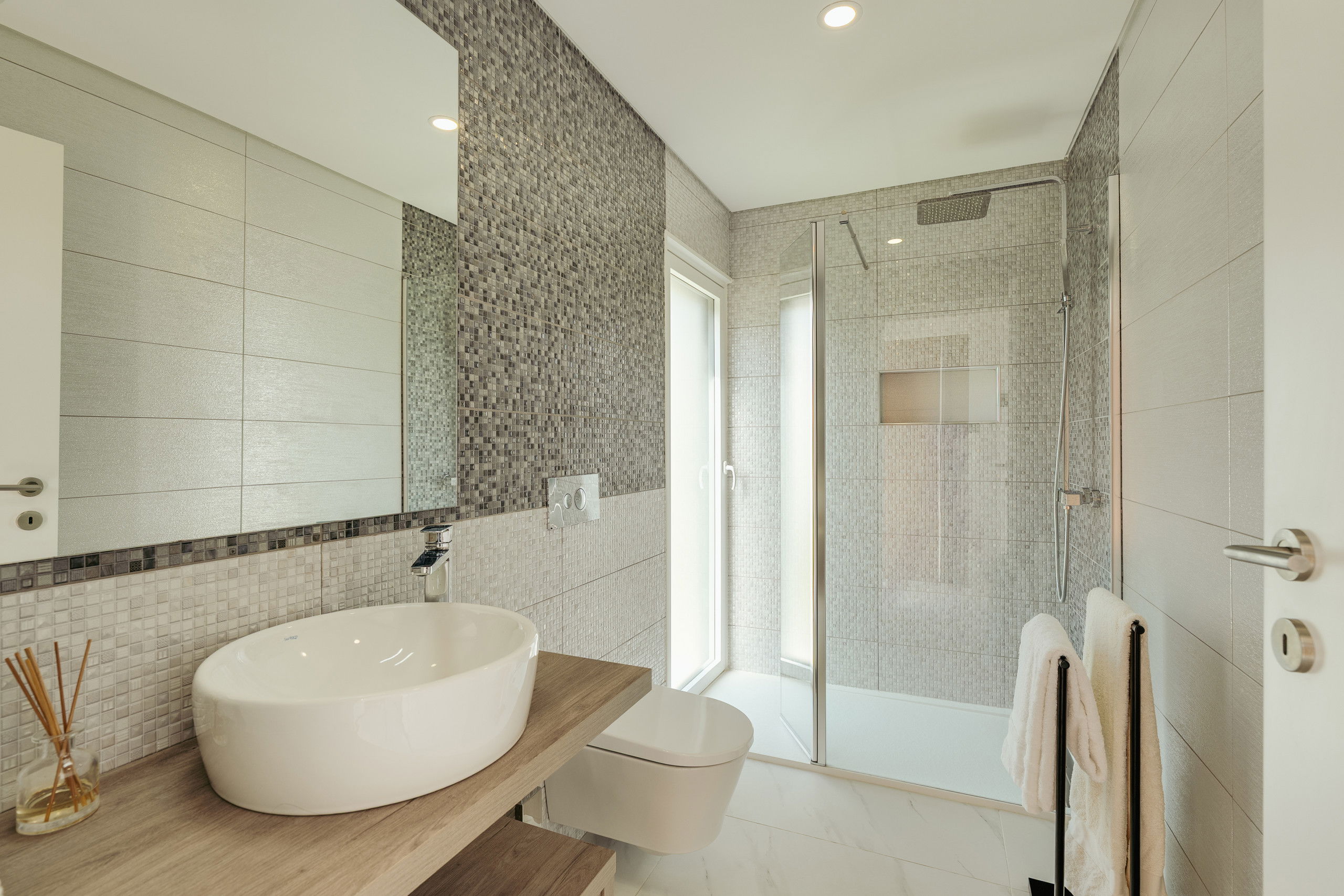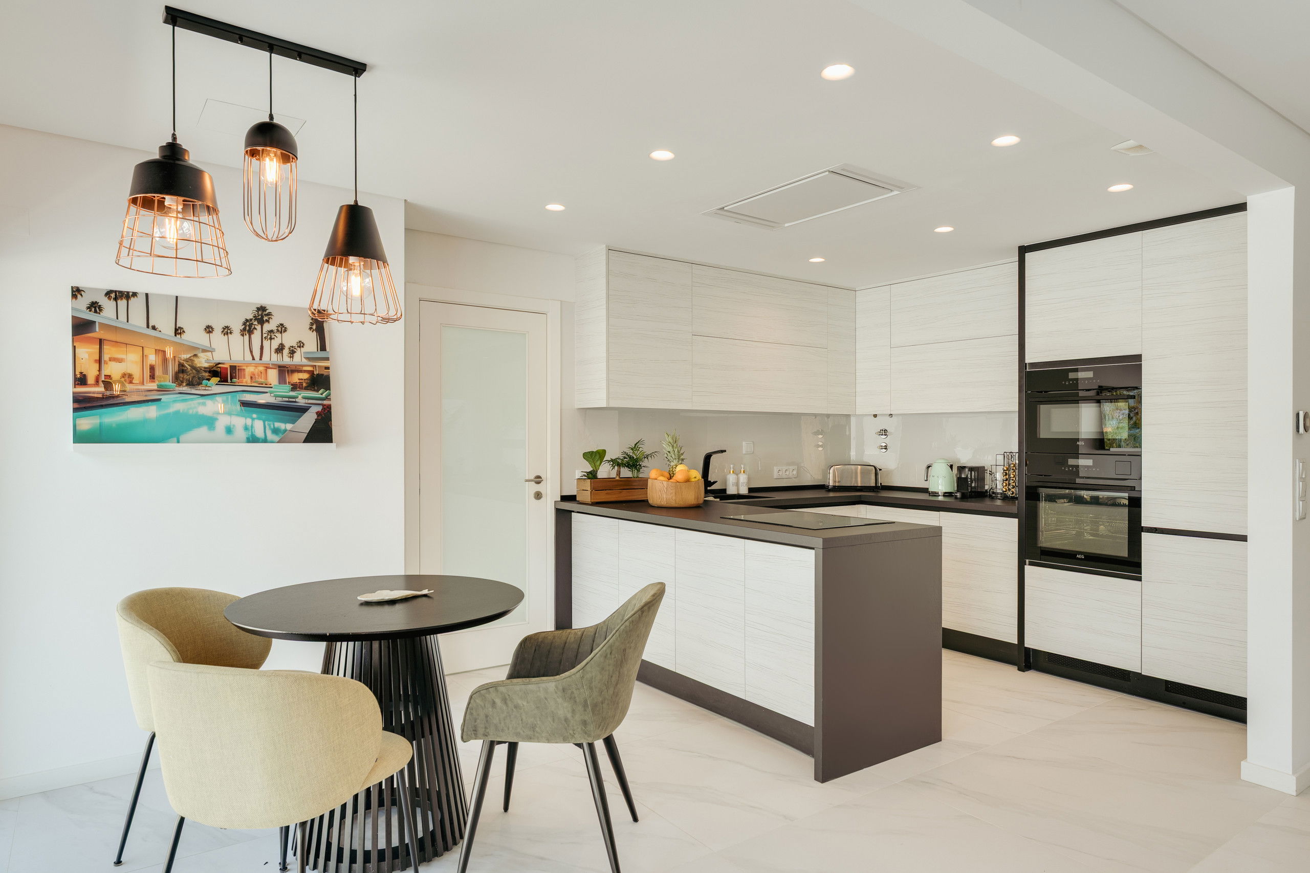 Inside, the villa is designed to provide space, functionality, and a welcoming atmosphere. The ground floor features a bright and open layout, with a spacious living and dining area seamlessly connected to a modern American-style kitchen. Large glass doors allow natural light to flow in and provide easy access to the garden and pool area. A home office, which can be converted into a bedroom with a retractable bed, offers additional flexibility for guests. This level also includes a laundry room, a full bathroom, and interior access to the garage. Upstairs, the floor accommodates three double bedrooms, including a master suite with a hydromassage bathtub. The other two bedrooms share a full bathroom with a walk-in shower, and one of the rooms has access to a large decked balcony with sun loungers, offering a peaceful space to unwind.