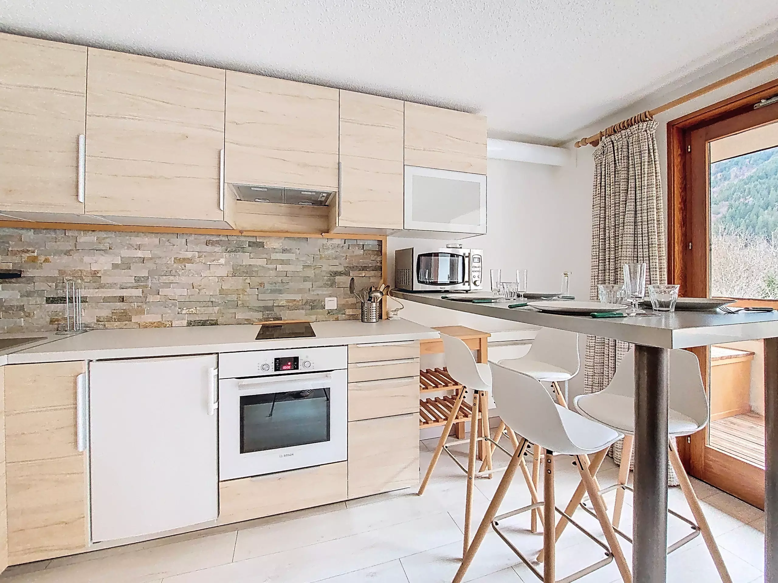 A fully equipped kitchen with fridge/freezer, dishwasher, kettle, toaster, microwave, sink, oven, 2-burner induction hob, raclette grill and fondue set.