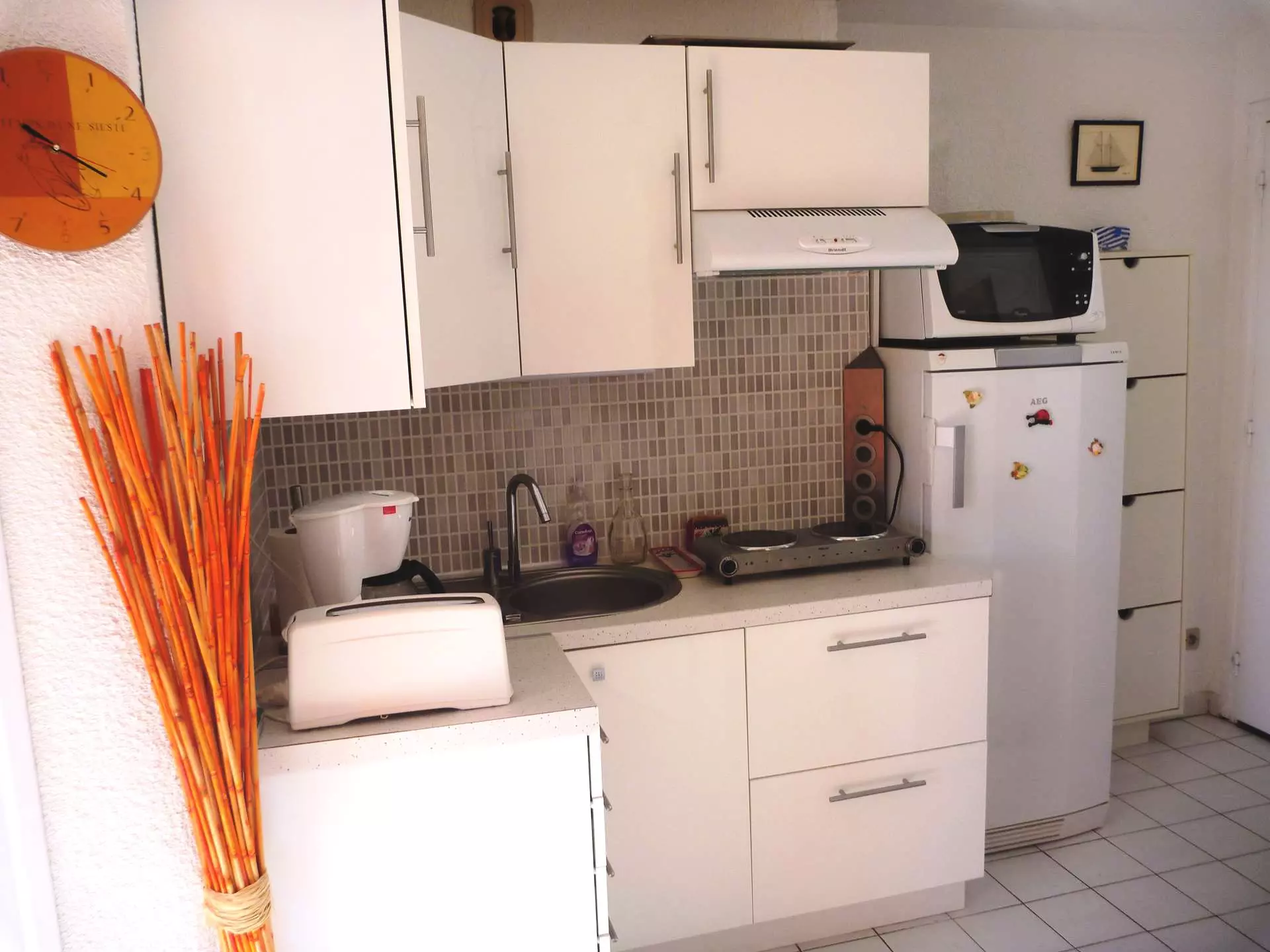 Open kitchen: ceramic hob, microwave, dishwasher, electric coffee maker, fridge/freezer.