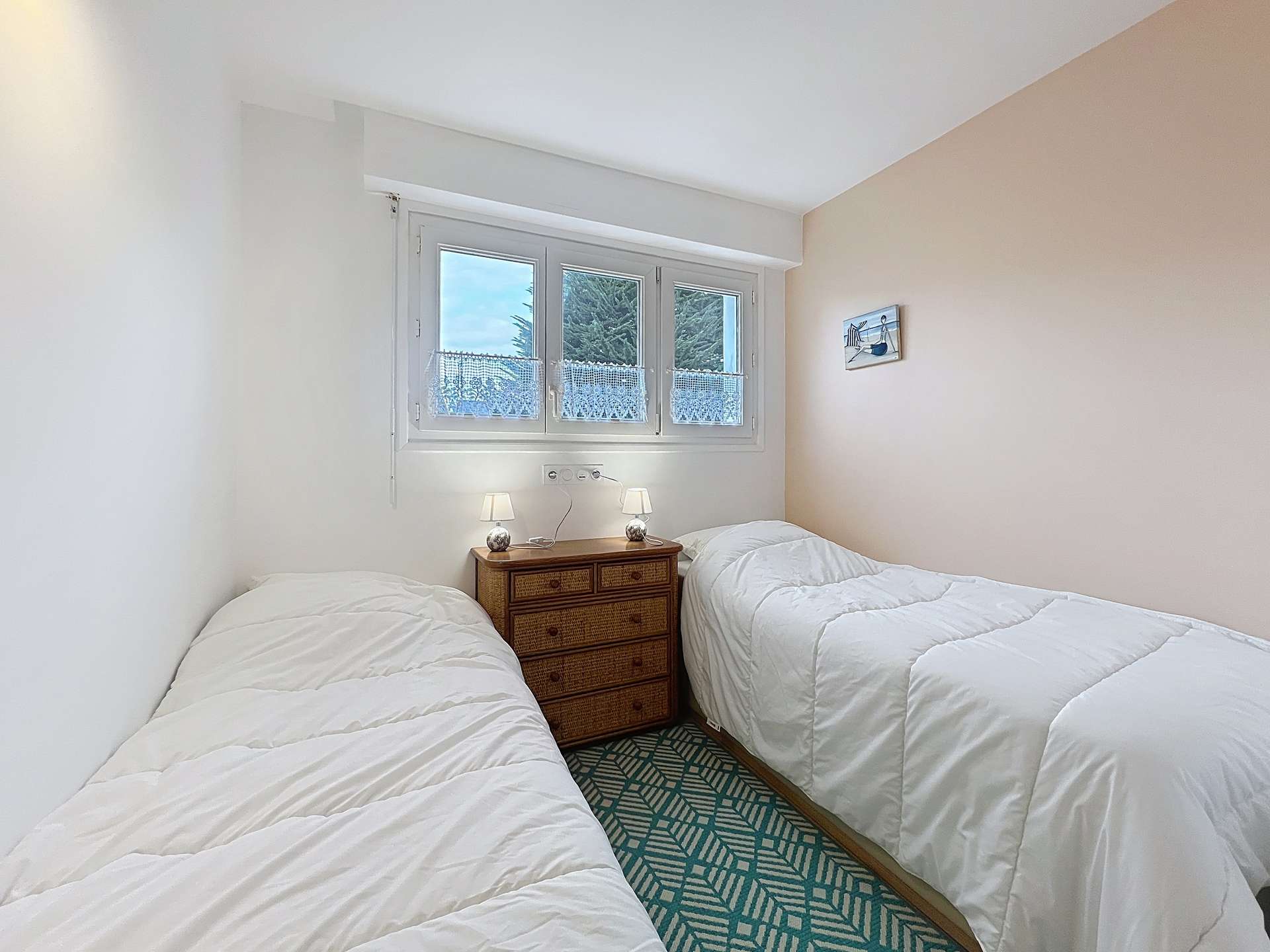 - A room with two beds of 80 cm close together, storage space and adjoining balcony,