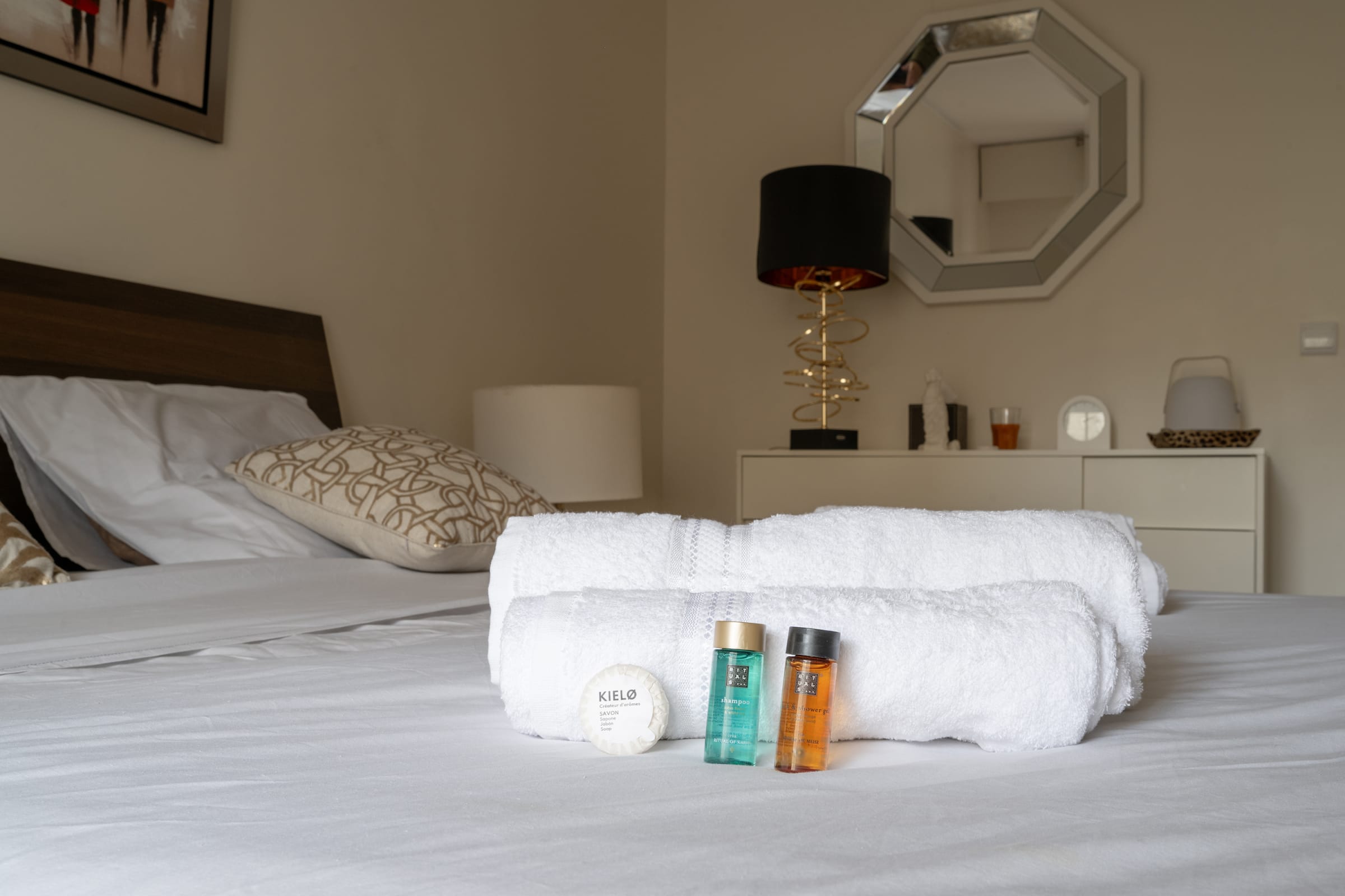 → Before your arrival and after your departure, our team performs hotel-quality housekeeping and provides you with hotel-quality towels, bed linen and a line of natural skincare products.