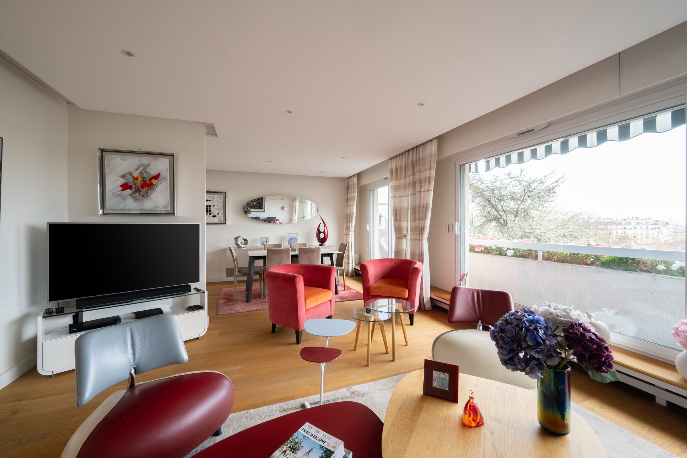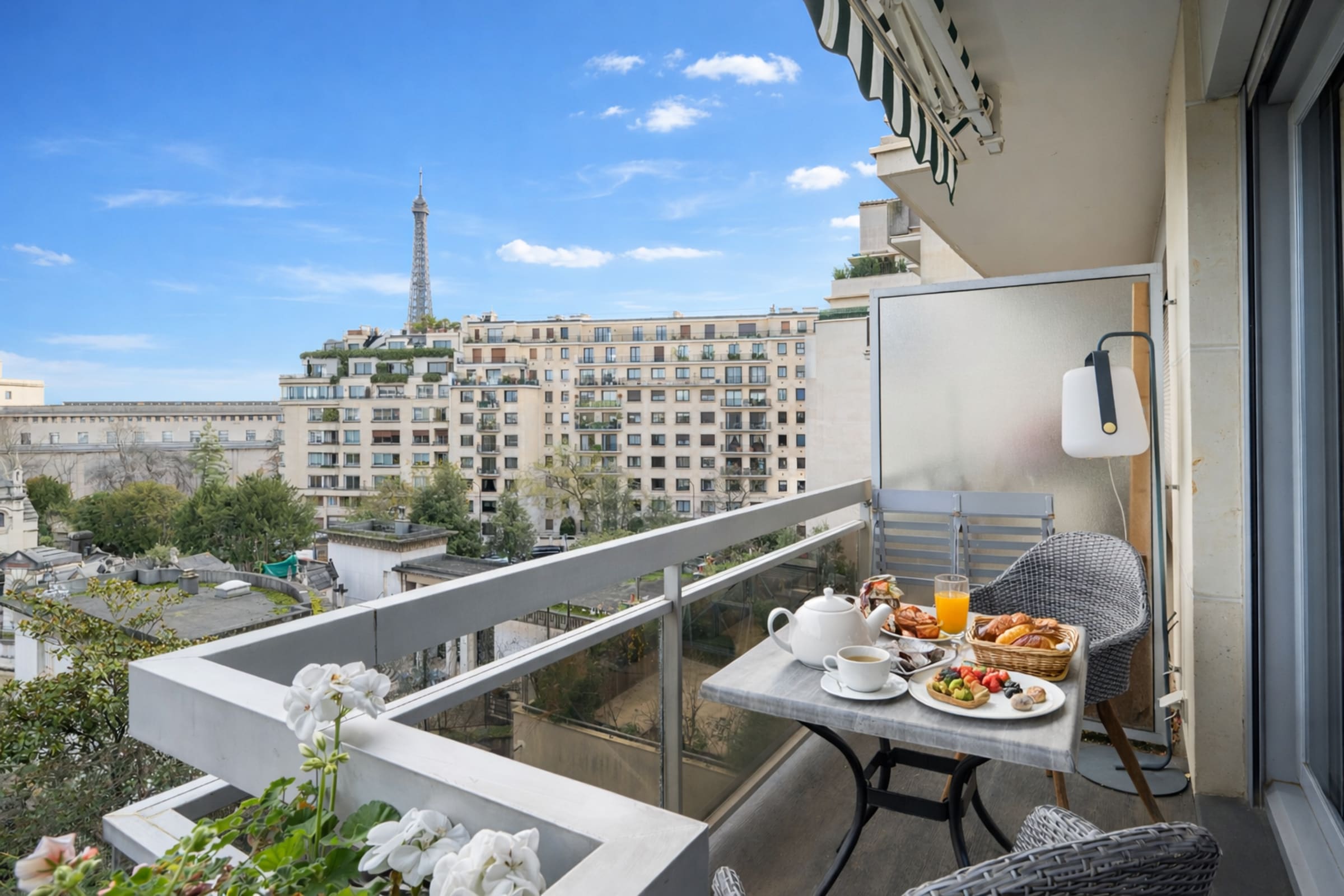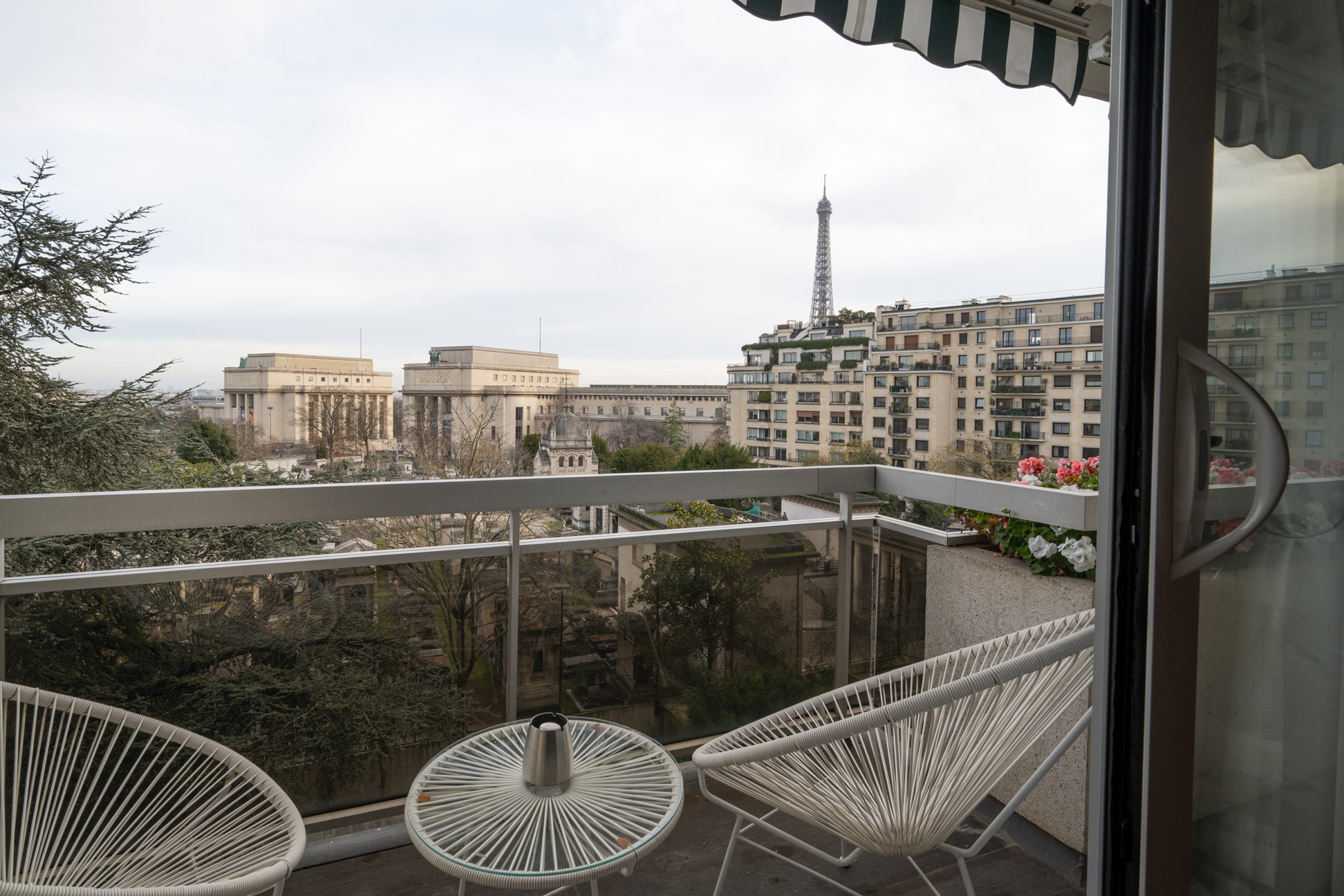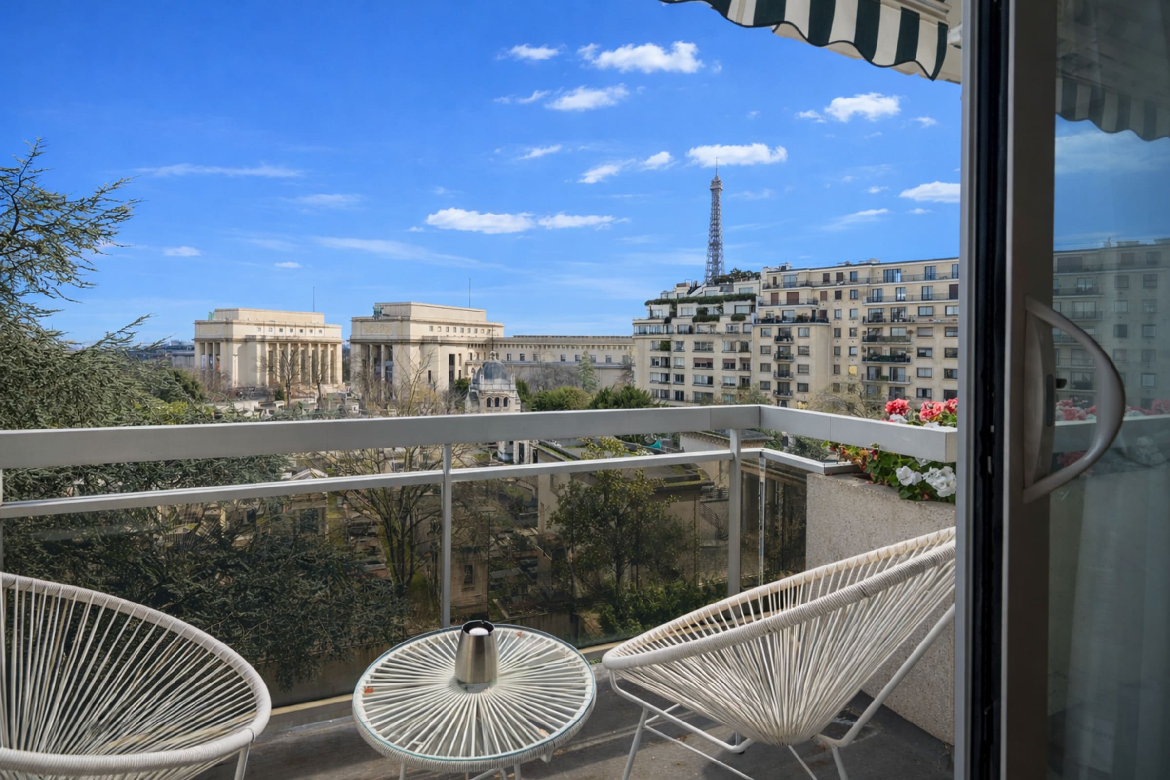 - a double living room comprising a large lounge and dining room, with a large convertible sofa, television with Sonos audio, and a large furnished balcony offering a view of the Trocadero and the Eiffel Tower,