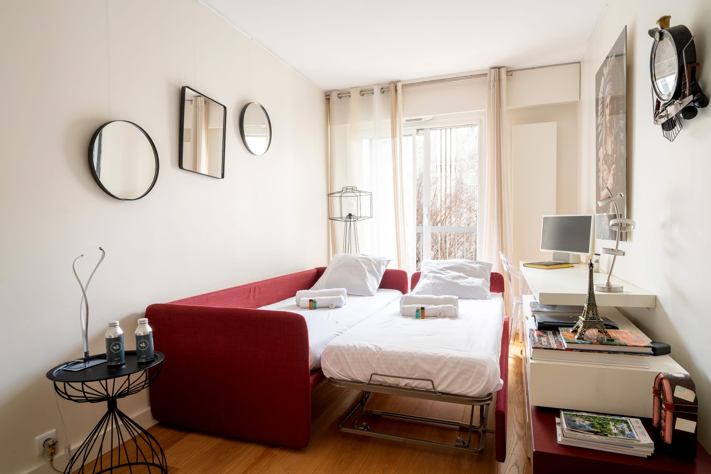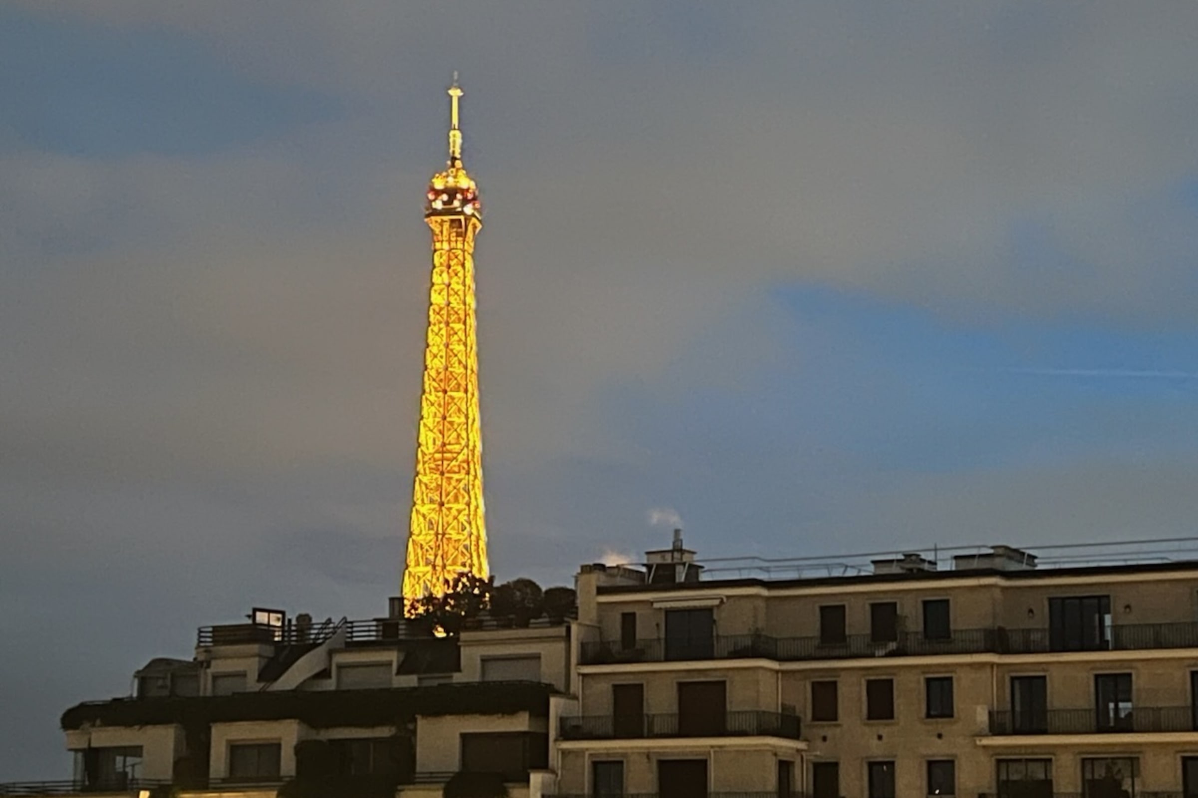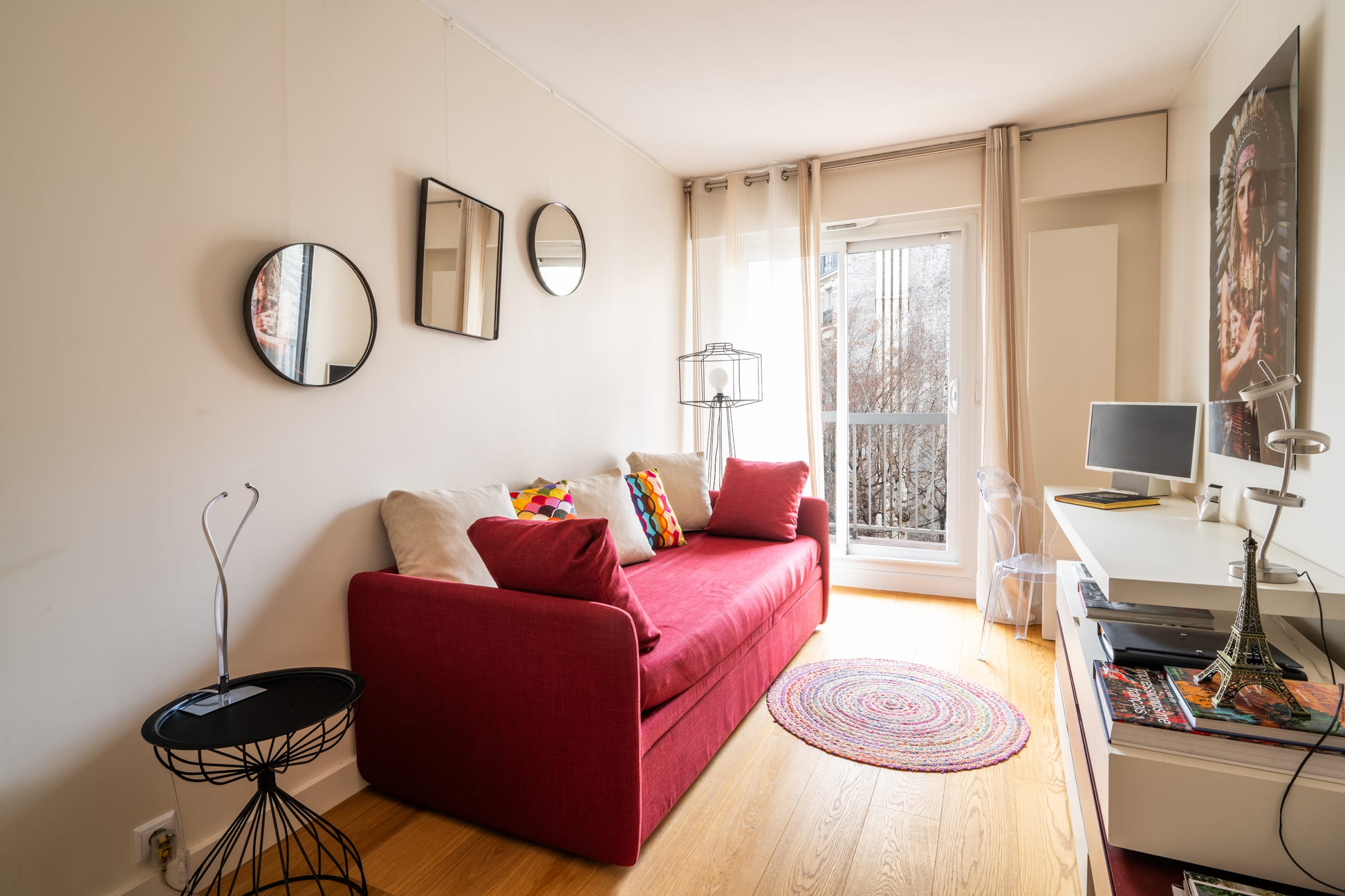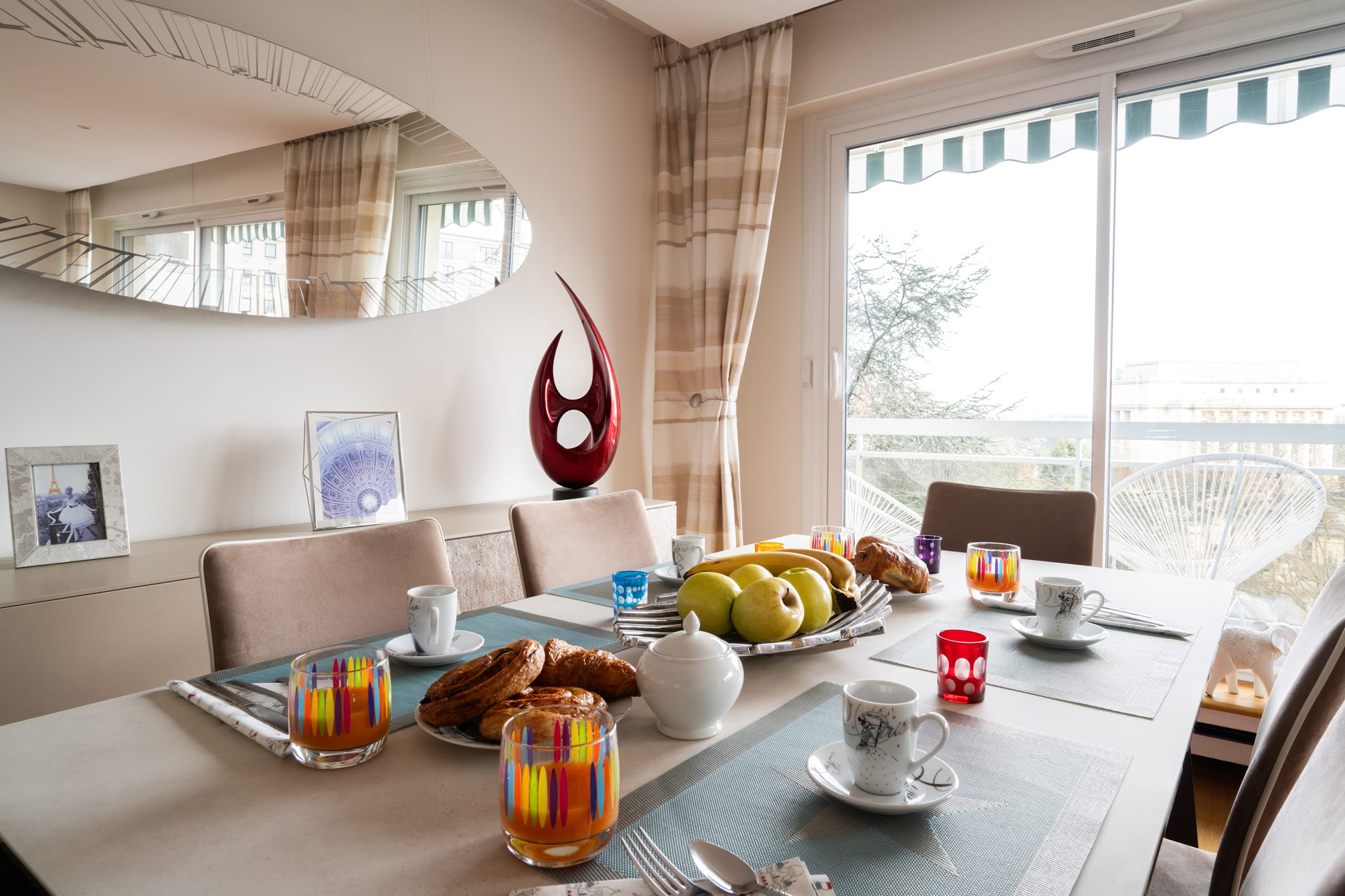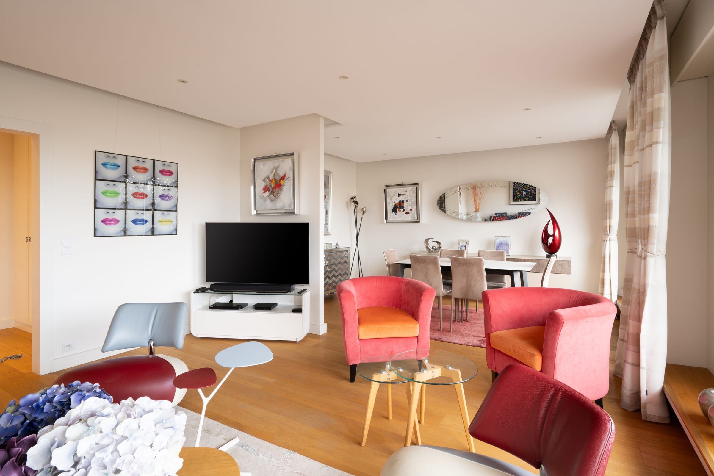 - a double living room comprising a large lounge and dining room, with a large convertible sofa, television with Sonos audio, and a large furnished balcony offering a view of the Trocadero and the Eiffel Tower,