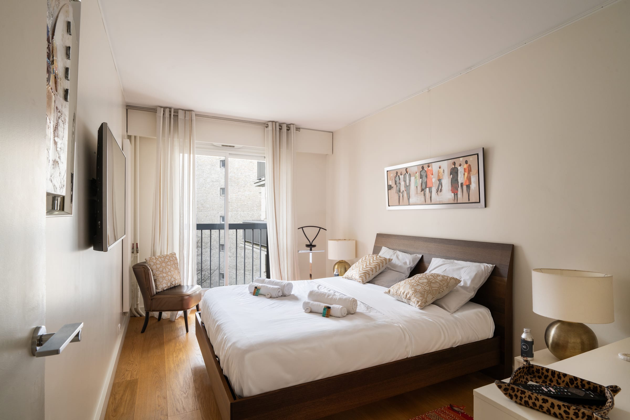 This spacious 106 m² apartment, located on the fourth floor of a luxury building with elevator, can accommodate up to 6 people and a baby. Located in a prestigious residential area, this apartment offers easy access to Paris' main sites, while guaranteeing peace and quiet.