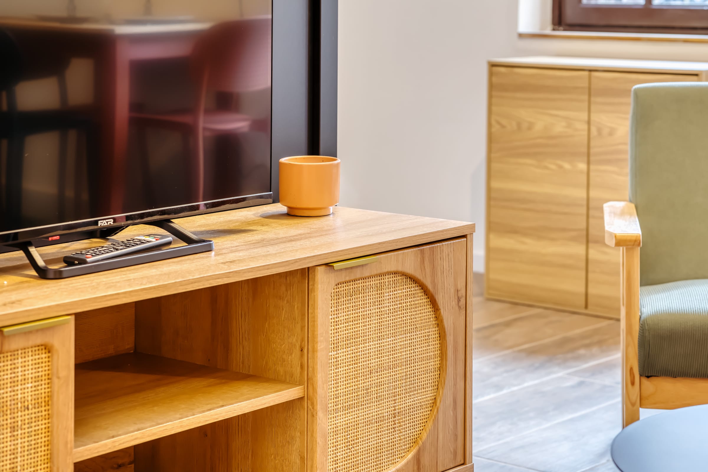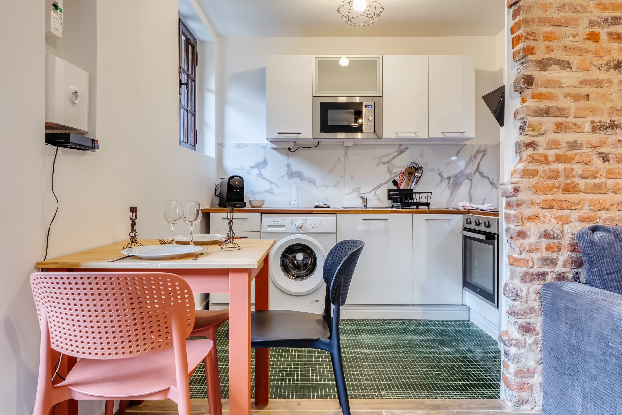 The accommodation includes a living area, perfect for relaxing and socializing. There is a sofa and television for you to relax in after a day of sightseeing or work. The kitchen is open plan, fully equipped and furnished with an oven, microwave, kettle, toaster, coffee maker, etc. Enjoy the sleeping area, which offers optimal comfort with 1 double bed. The bathroom has a shower, hair dryer, and toilet. Fiber optic internet is available.
