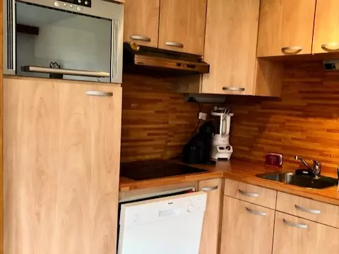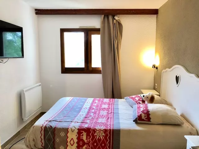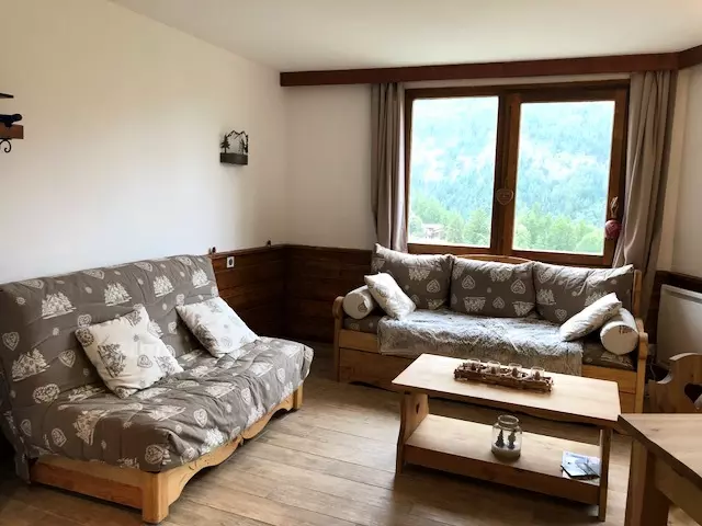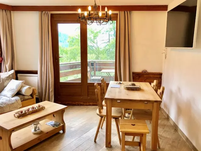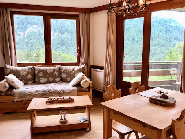 You'll appreciate the comfortable bedroom, decorated in a mountain style and equipped with a cozy double bed, ideal for restful nights after your days of skiing or hiking. The living area offers two sofas, perfect for relaxing with family or friends. The room opens onto a welcoming dining area where you can share meals around a solid wood table.