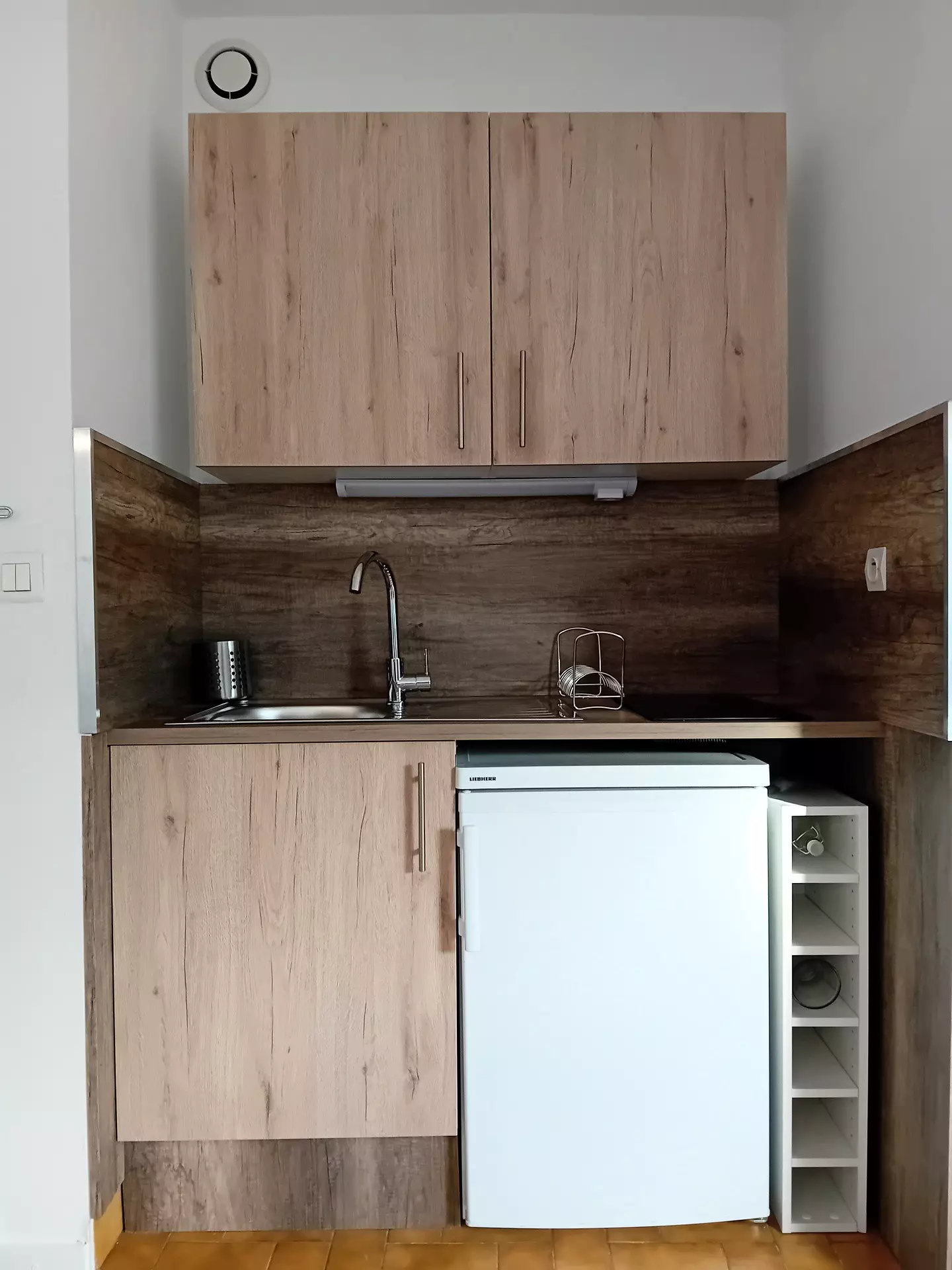 Open kitchen unit (tiled): 2 induction hobs, fridge/freezer, mini oven, microwave, 1 kettle, 1 electric coffee maker, 1 toaster, crockery and cookware.